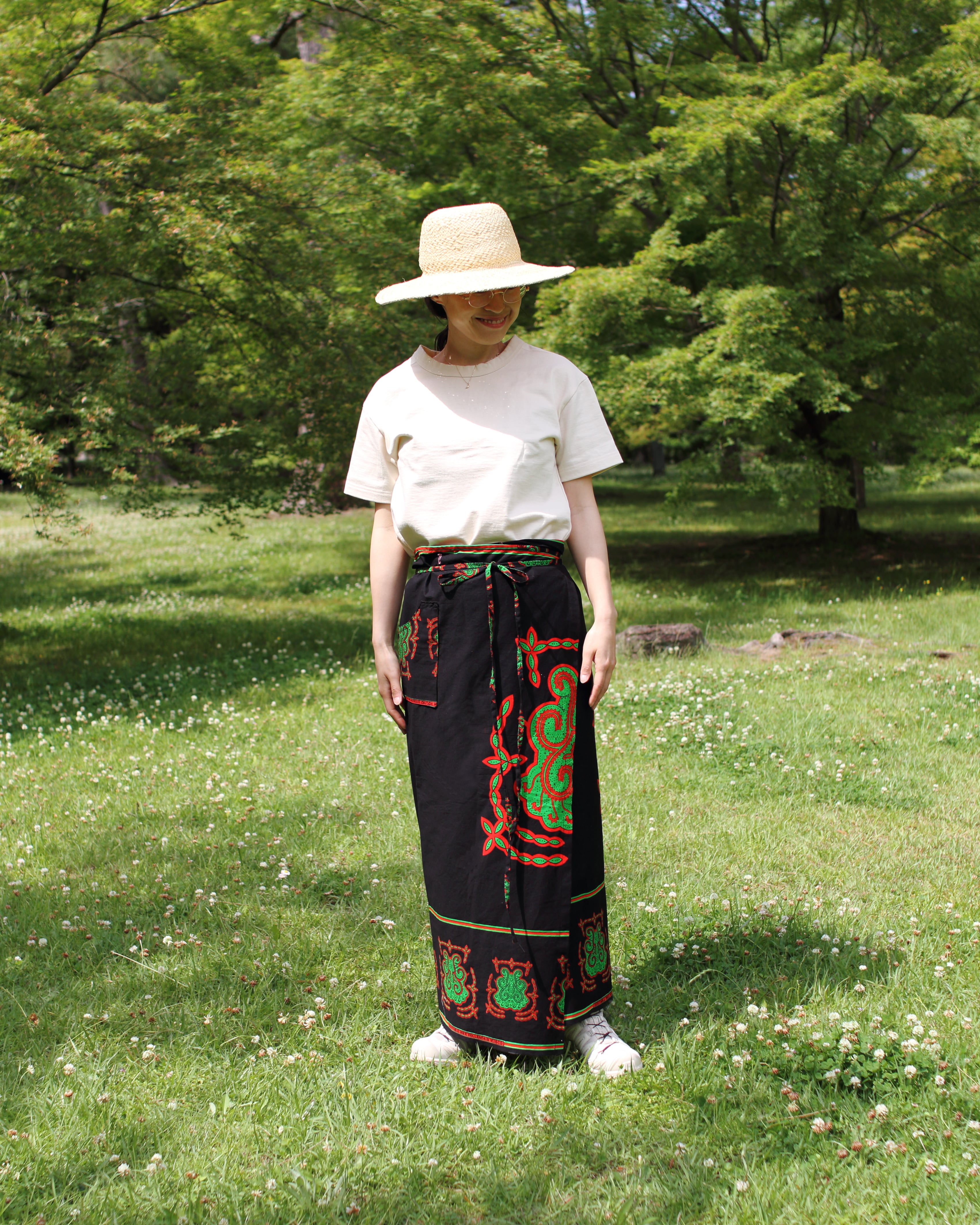 アフリカンプリントの一枚布を体に巻くというシンプルなアトリエエプロン。