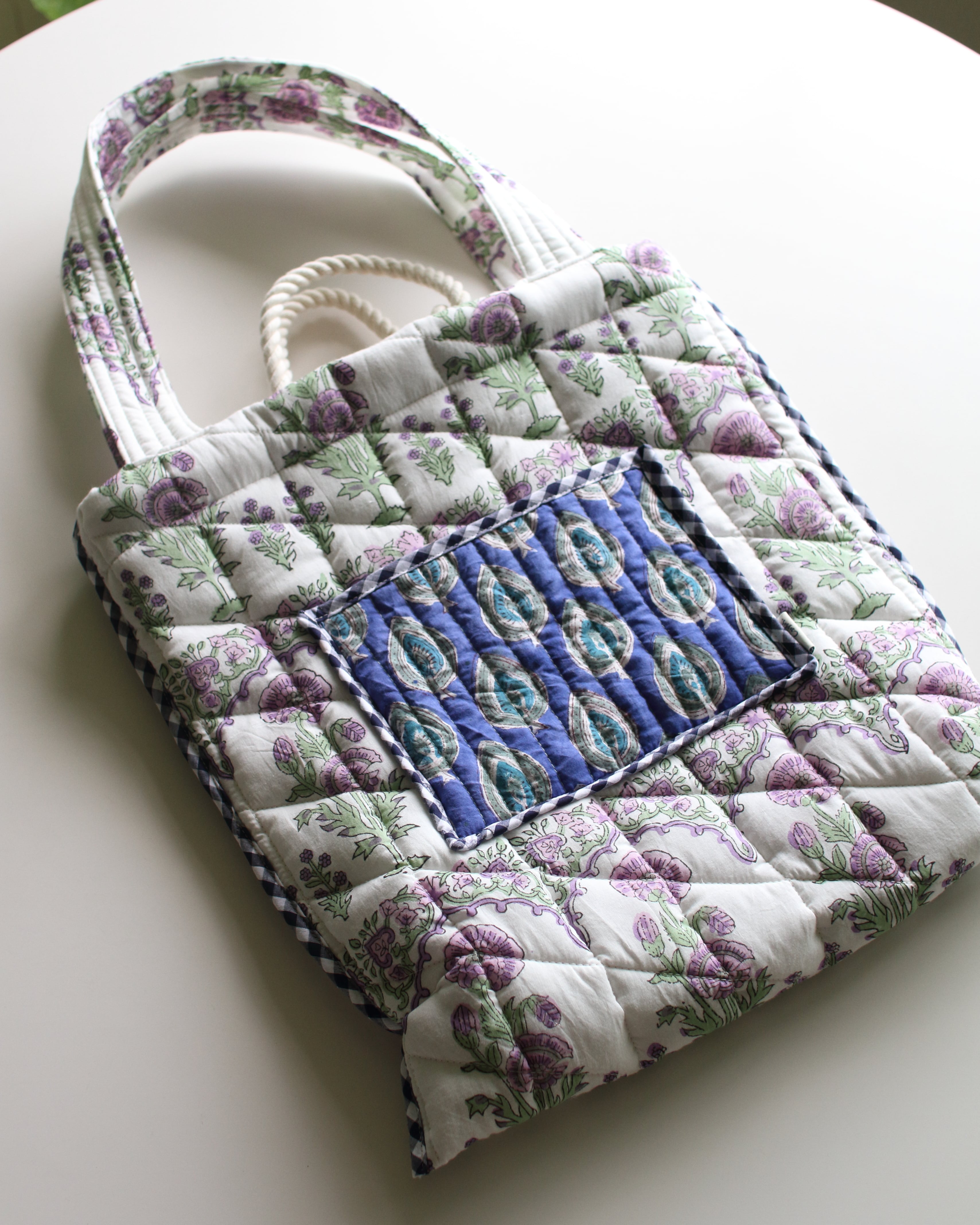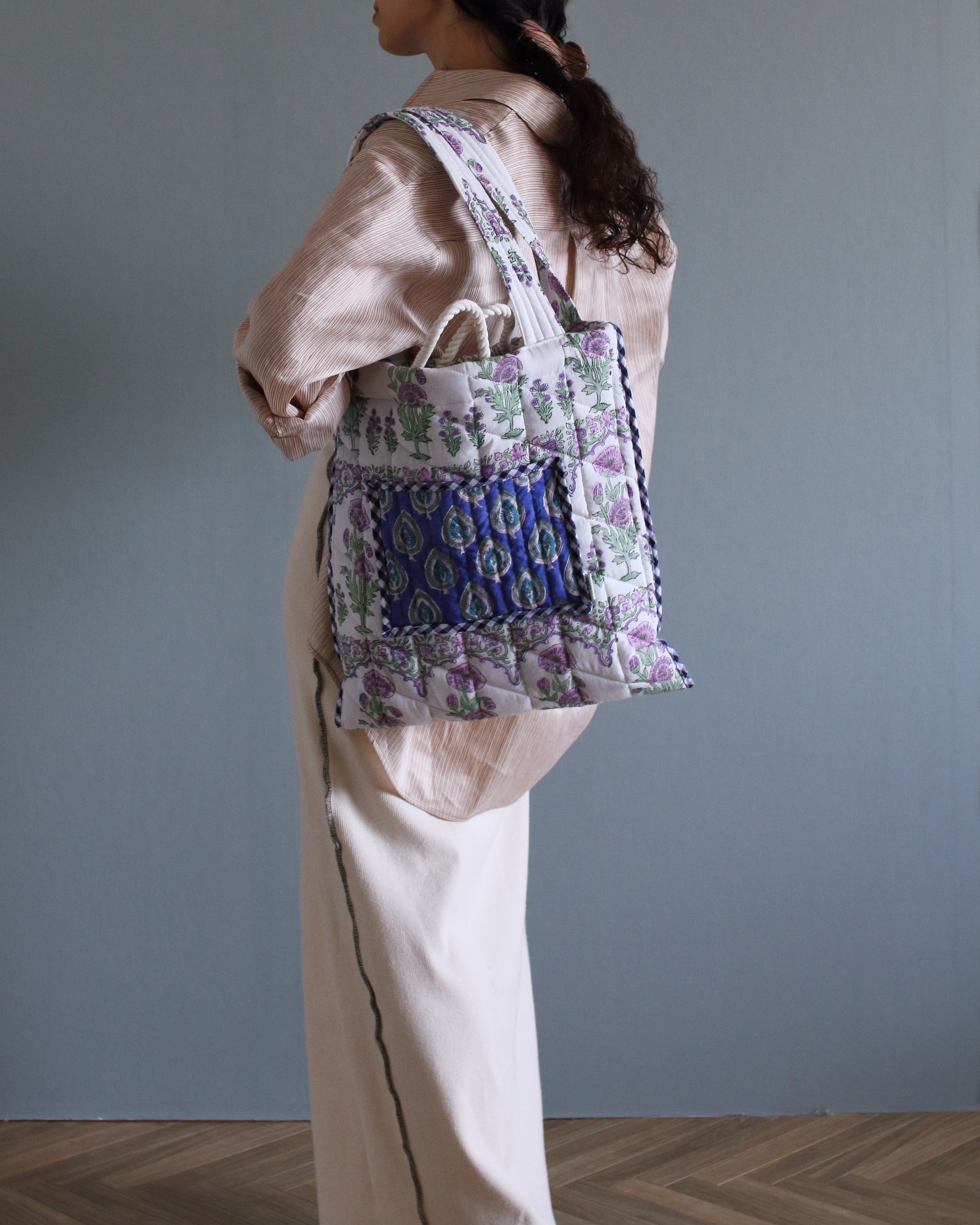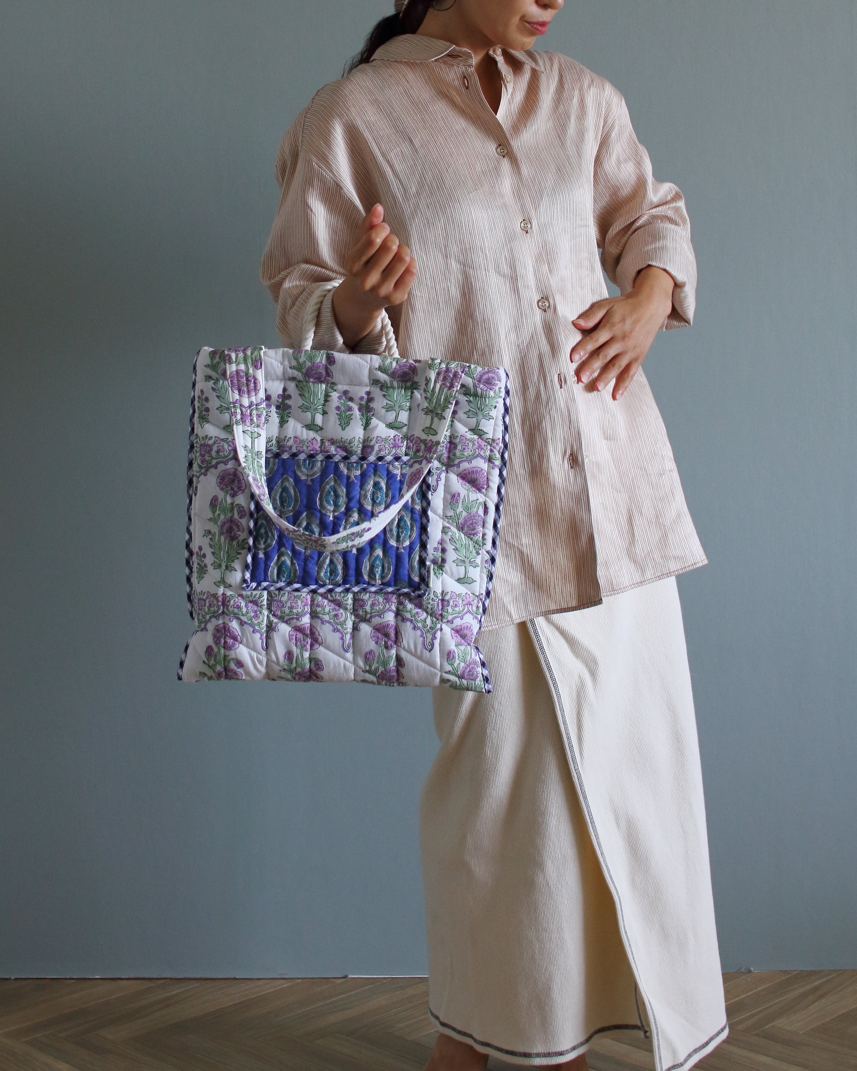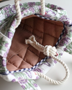 インドで作られたハンドブロックプリント生地(木製のスタンプで色を重ねていく伝統的な手法)をオリジナルで厚みのあるキルティングに仕立てて、軽くてたくさん入るトートバッグ。