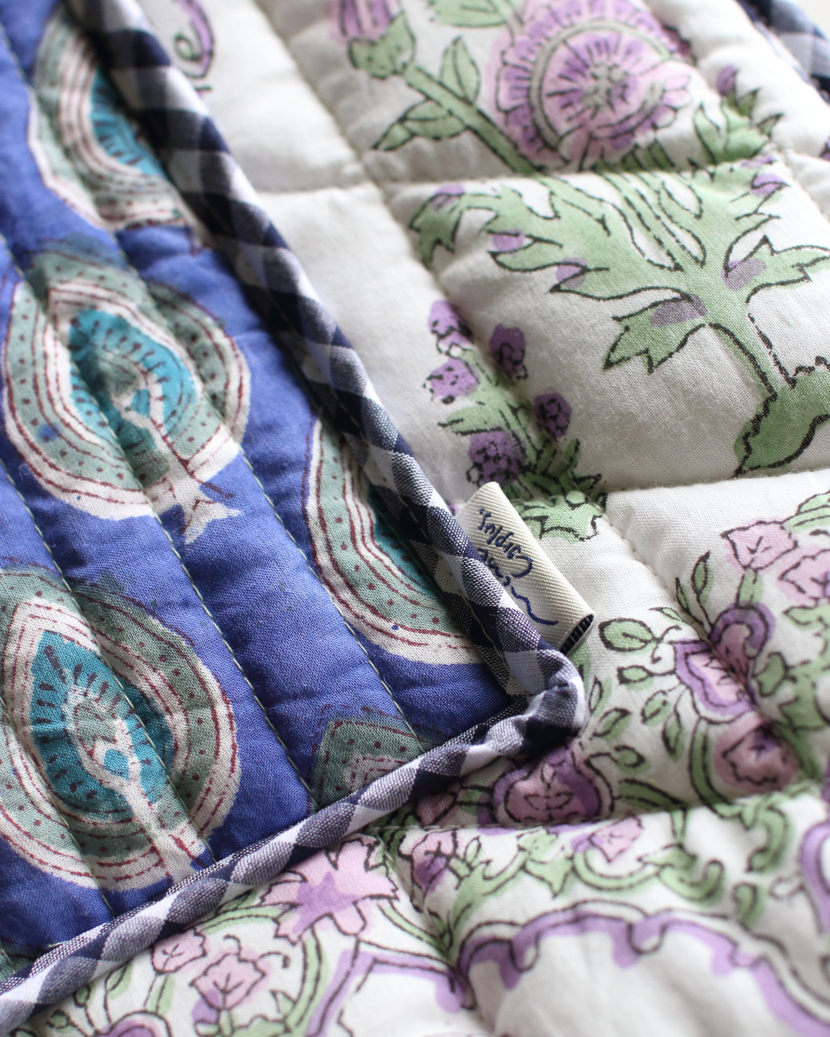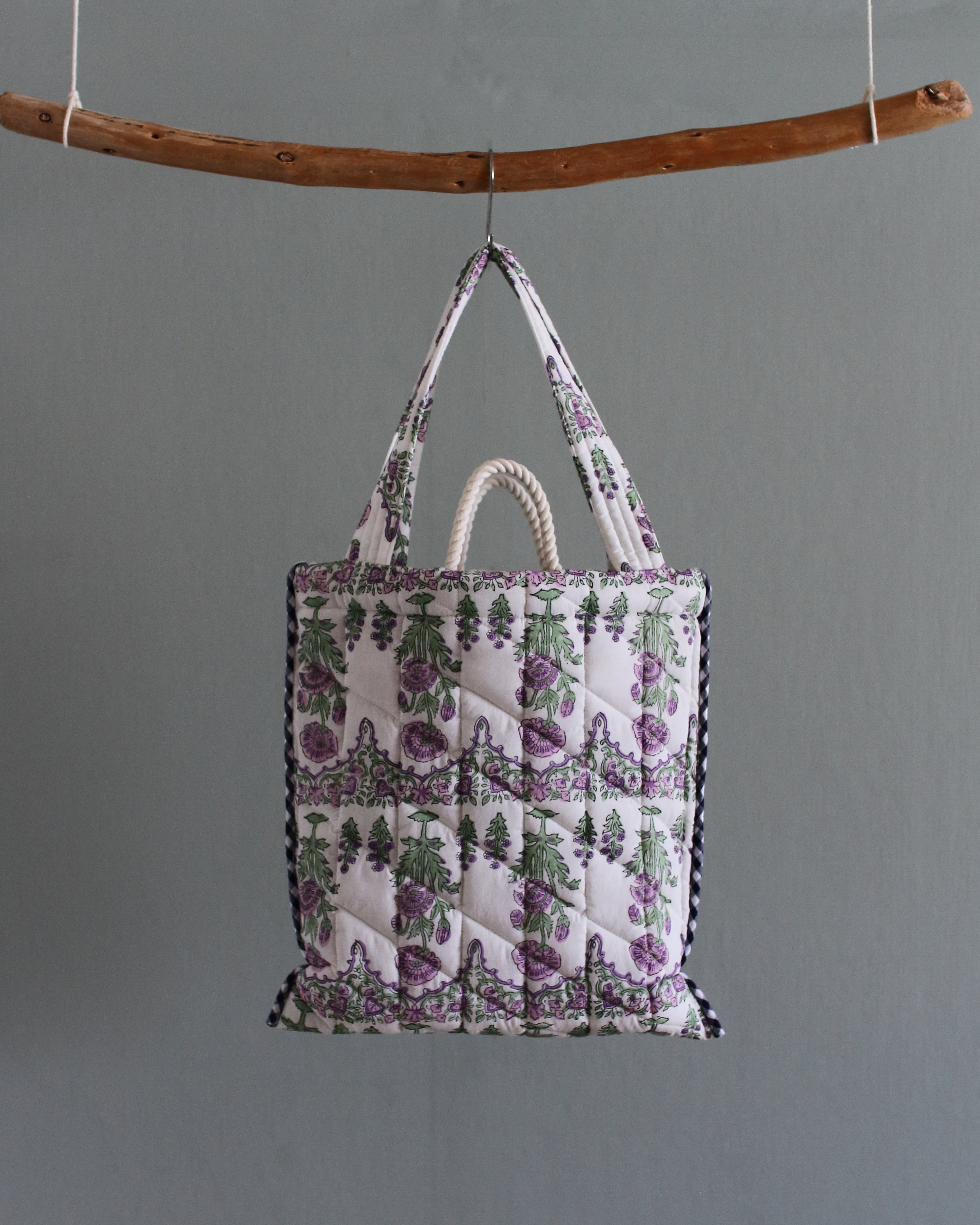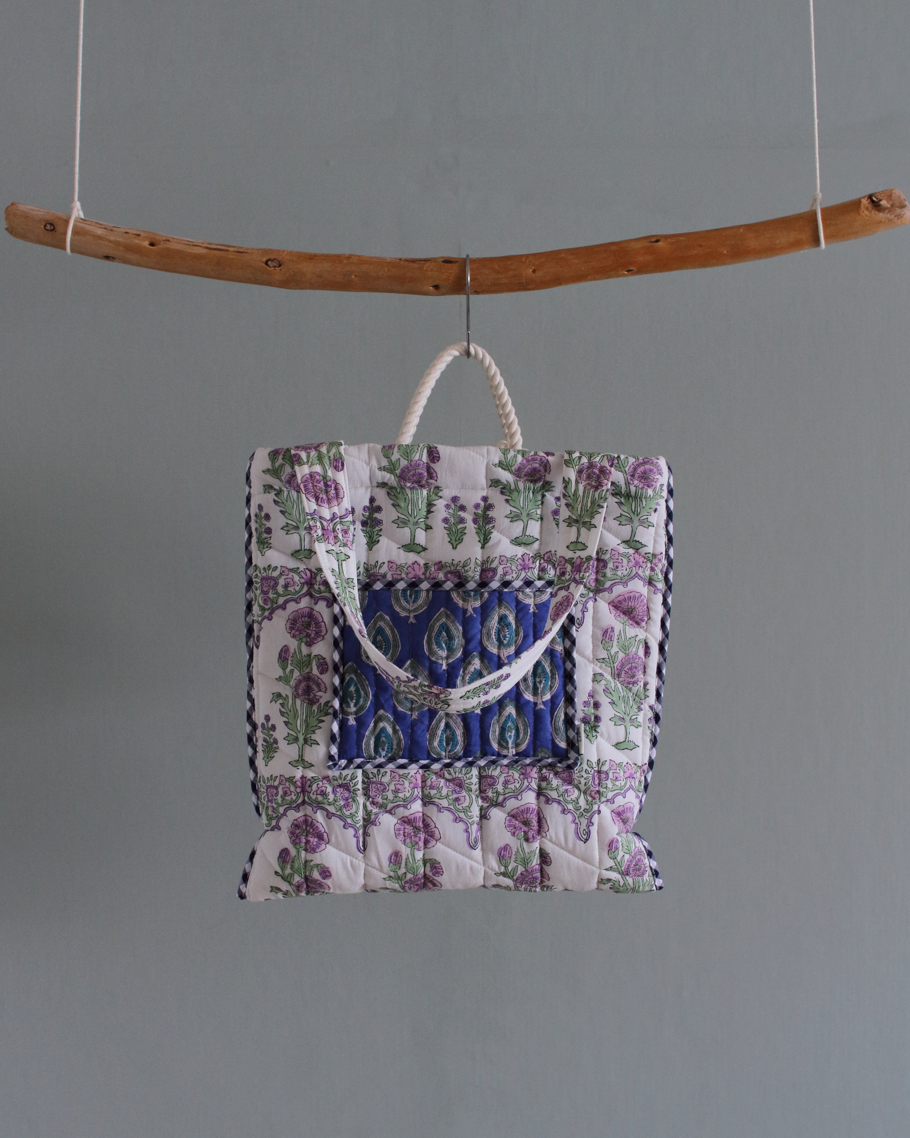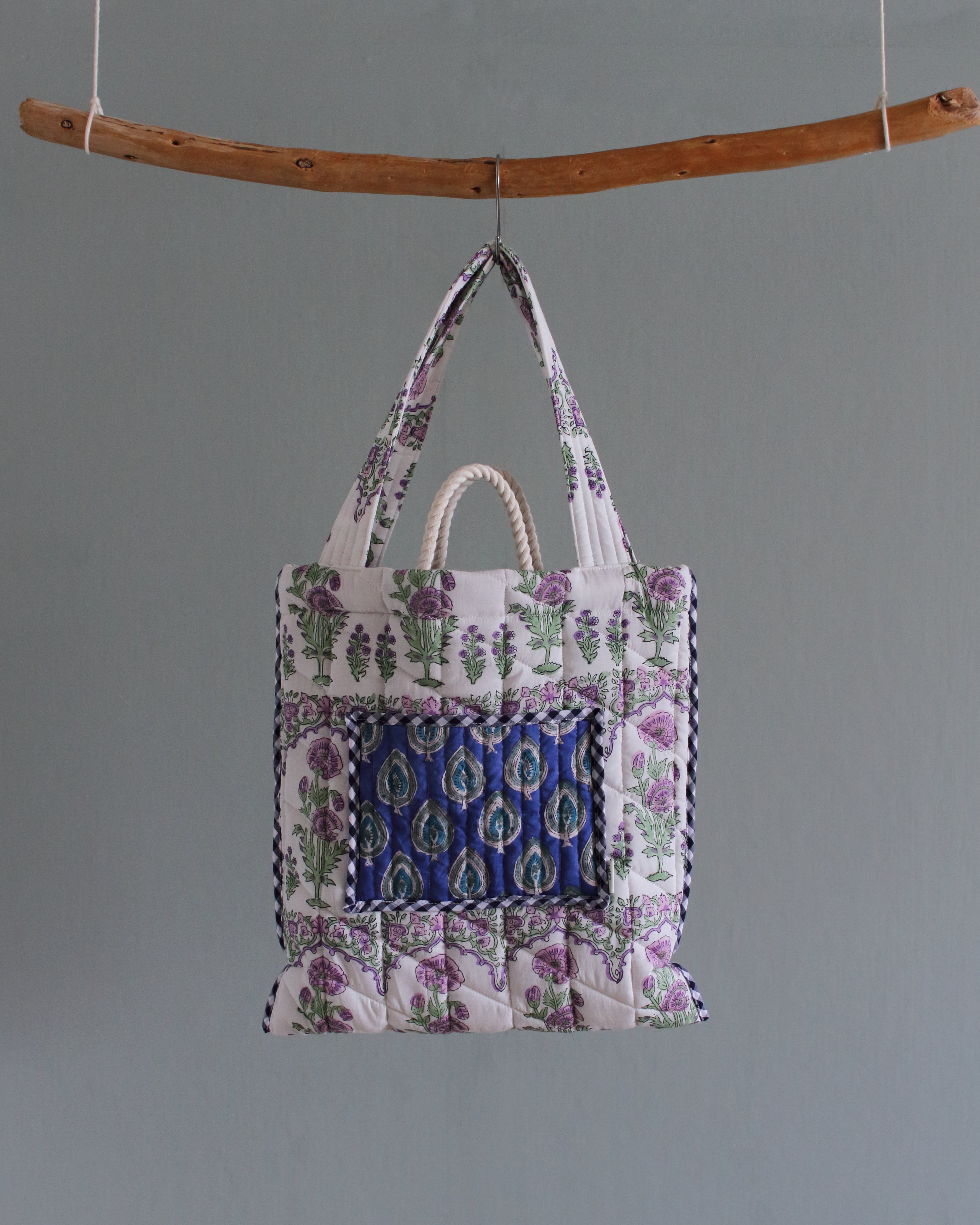 インドで作られたハンドブロックプリント生地(木製のスタンプで色を重ねていく伝統的な手法)をオリジナルで厚みのあるキルティングに仕立てて、軽くてたくさん入るトートバッグ。