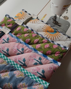 裏地にもブロックプリントの柄を配置していて、縁取りの組み合わせもひとつひとつ違っている、全て1点ずつの制作となります。