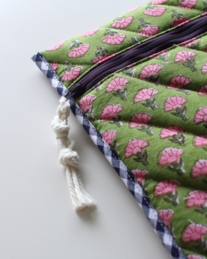 裏地にもブロックプリントの柄を配置していて、縁取りの組み合わせもひとつひとつ違っている、全て1点ずつの制作となります。