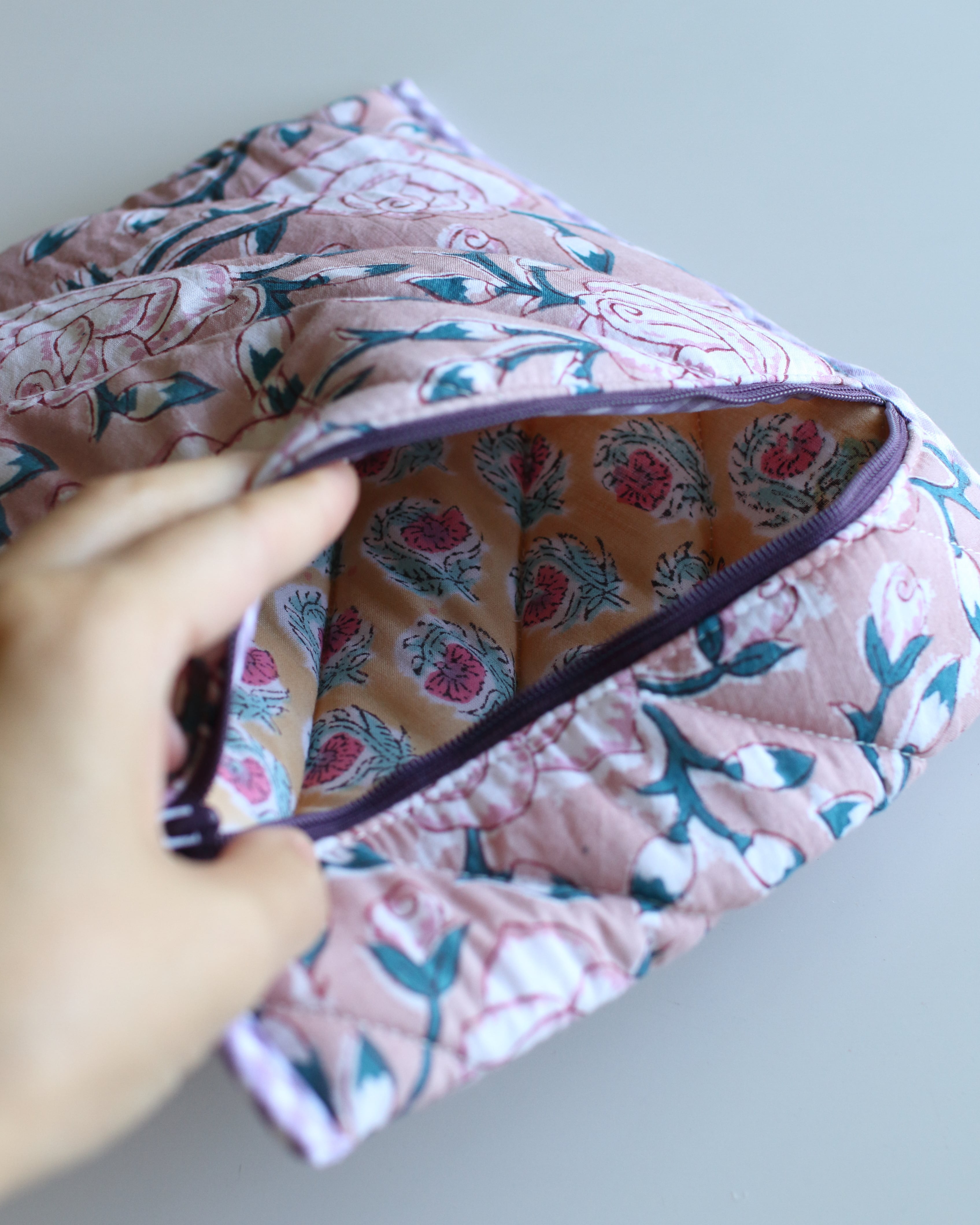 裏地にもブロックプリントの柄を配置していて、縁取りの組み合わせもひとつひとつ違っている、全て1点ずつの制作となります。