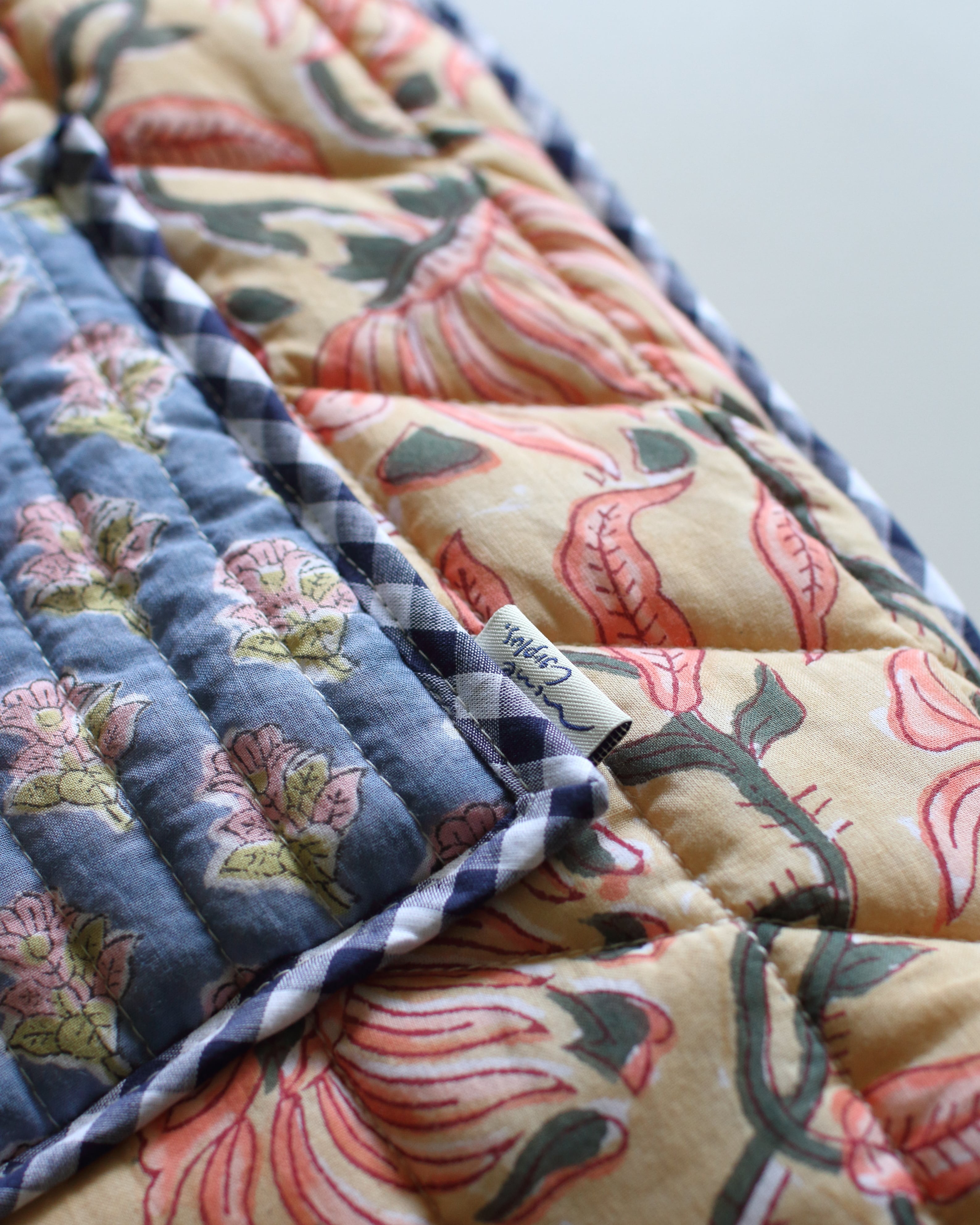 どこか懐かしい色合いが美しいブロックプリントはインドで全て手作業でプリント(スタンプ)されていて、不均一さや不完全さのようなものが独特のあたたかみをうみだしている。