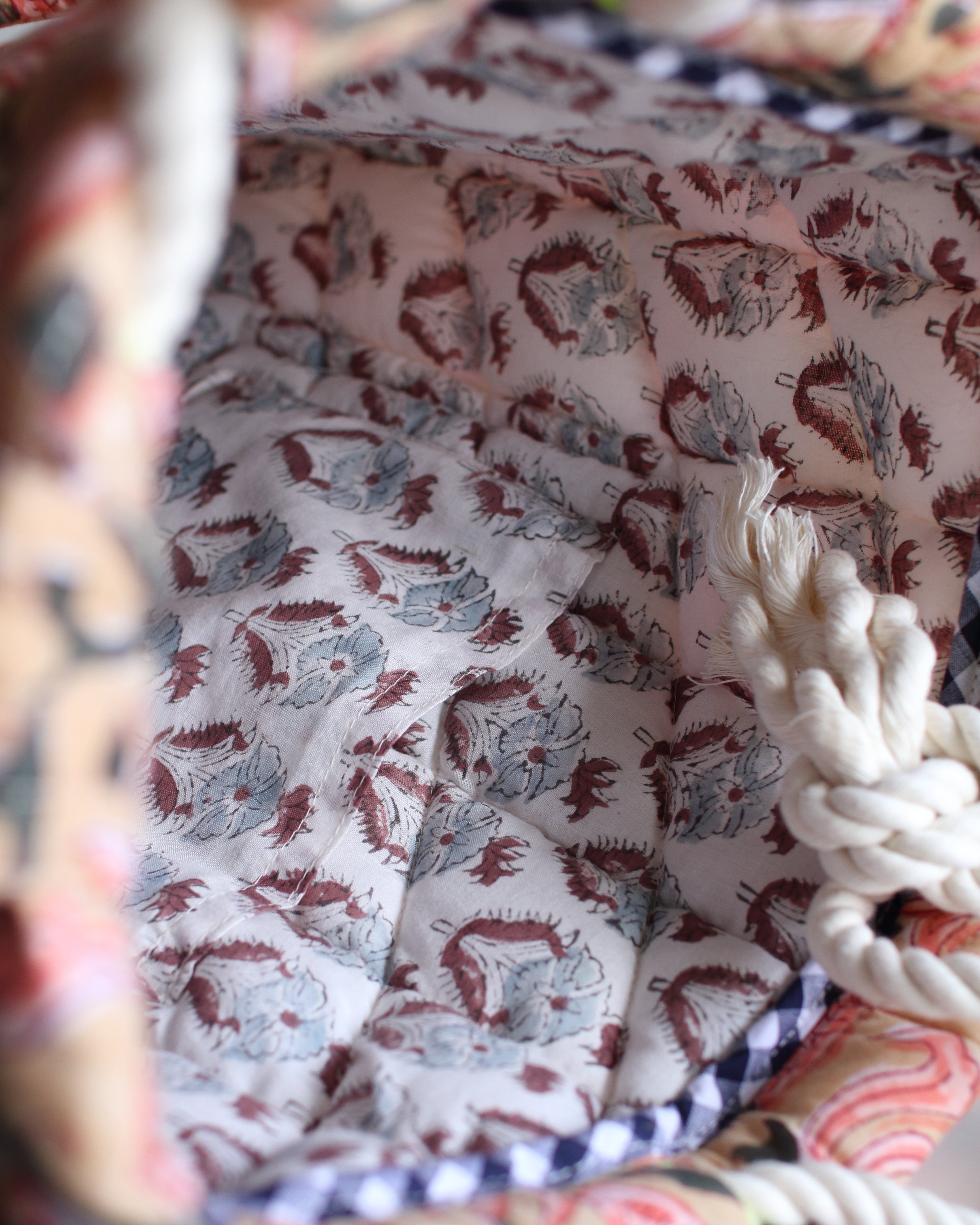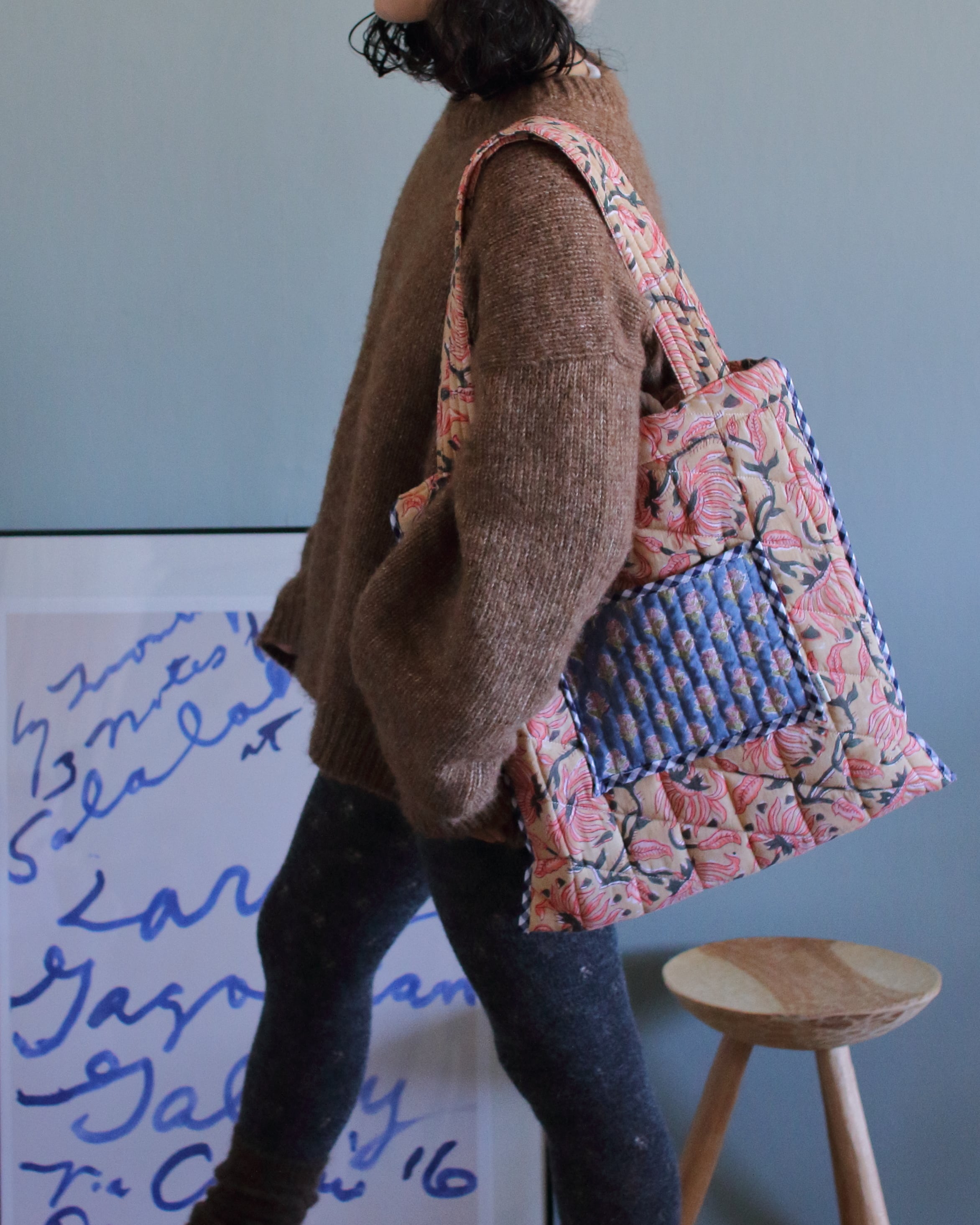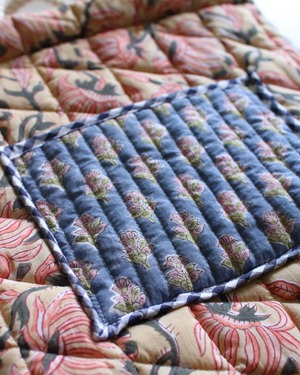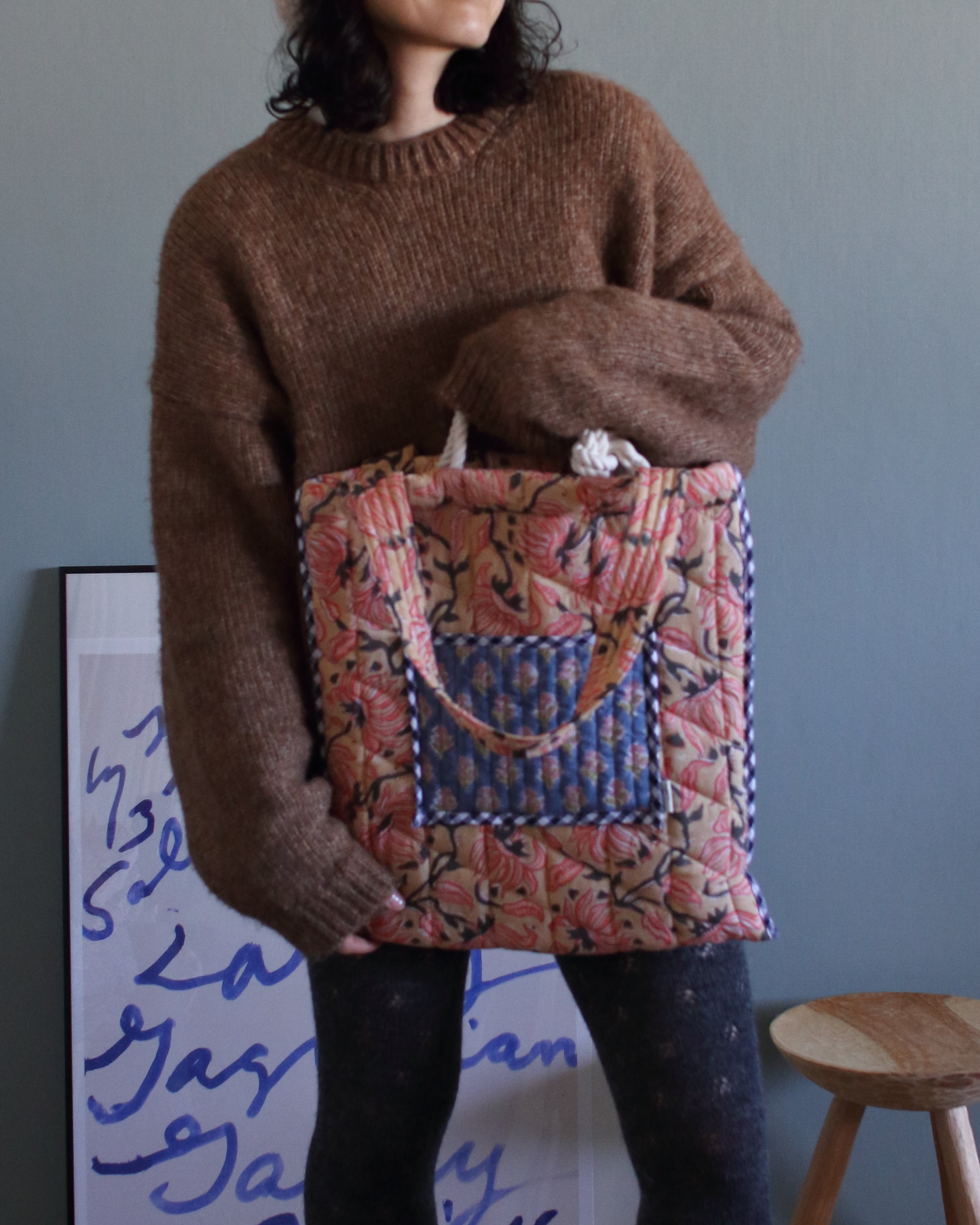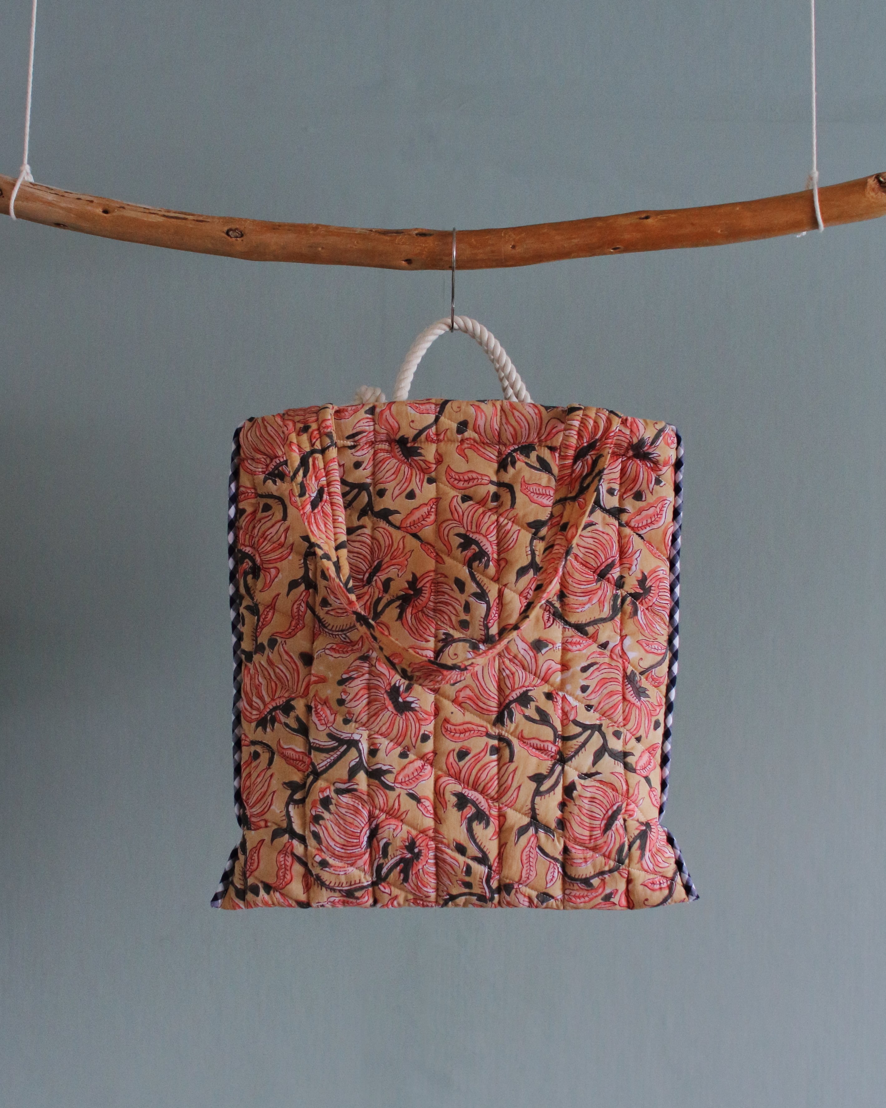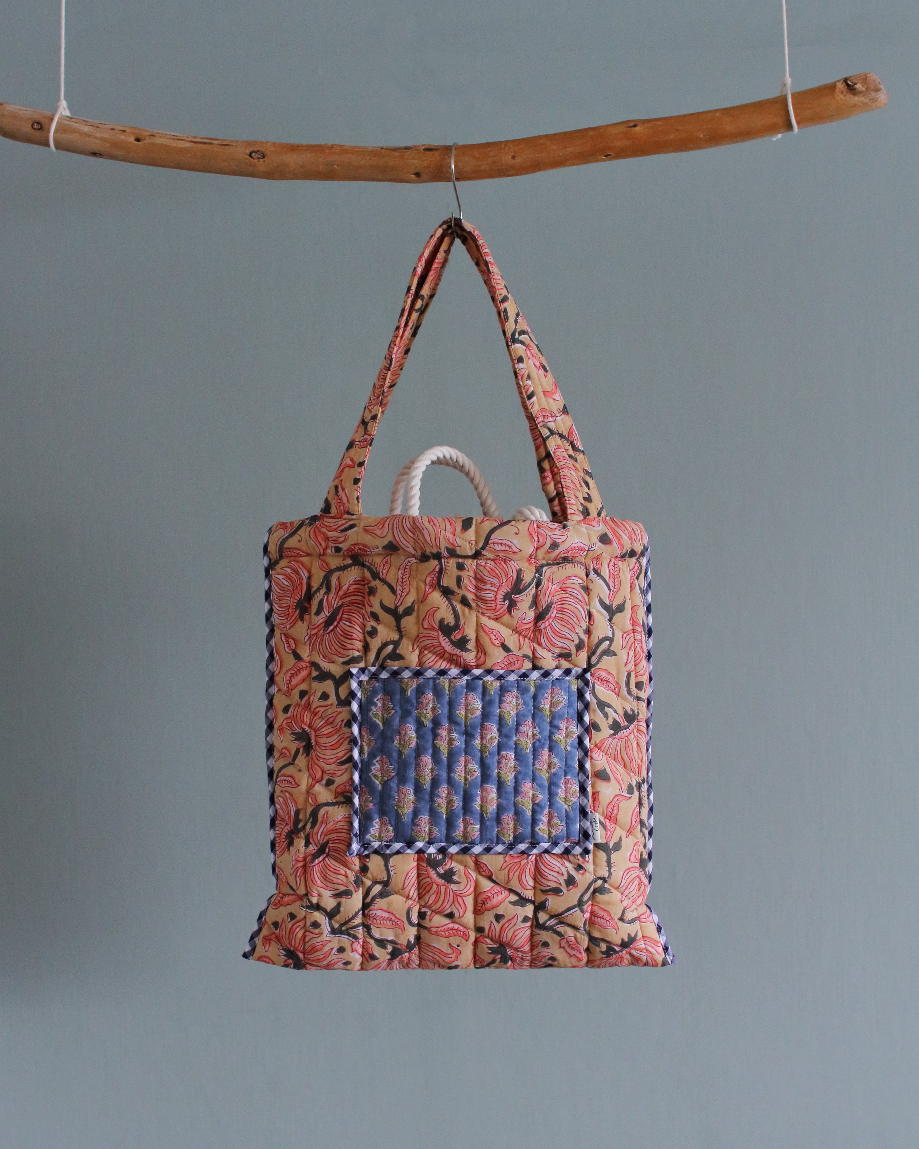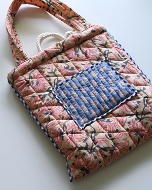 インドで作られたハンドブロックプリント生地(木製のスタンプで色を重ねていく伝統的な手法)をオリジナルで厚みのあるキルティングに仕立てて、軽くてたくさん入るトートバッグ。
