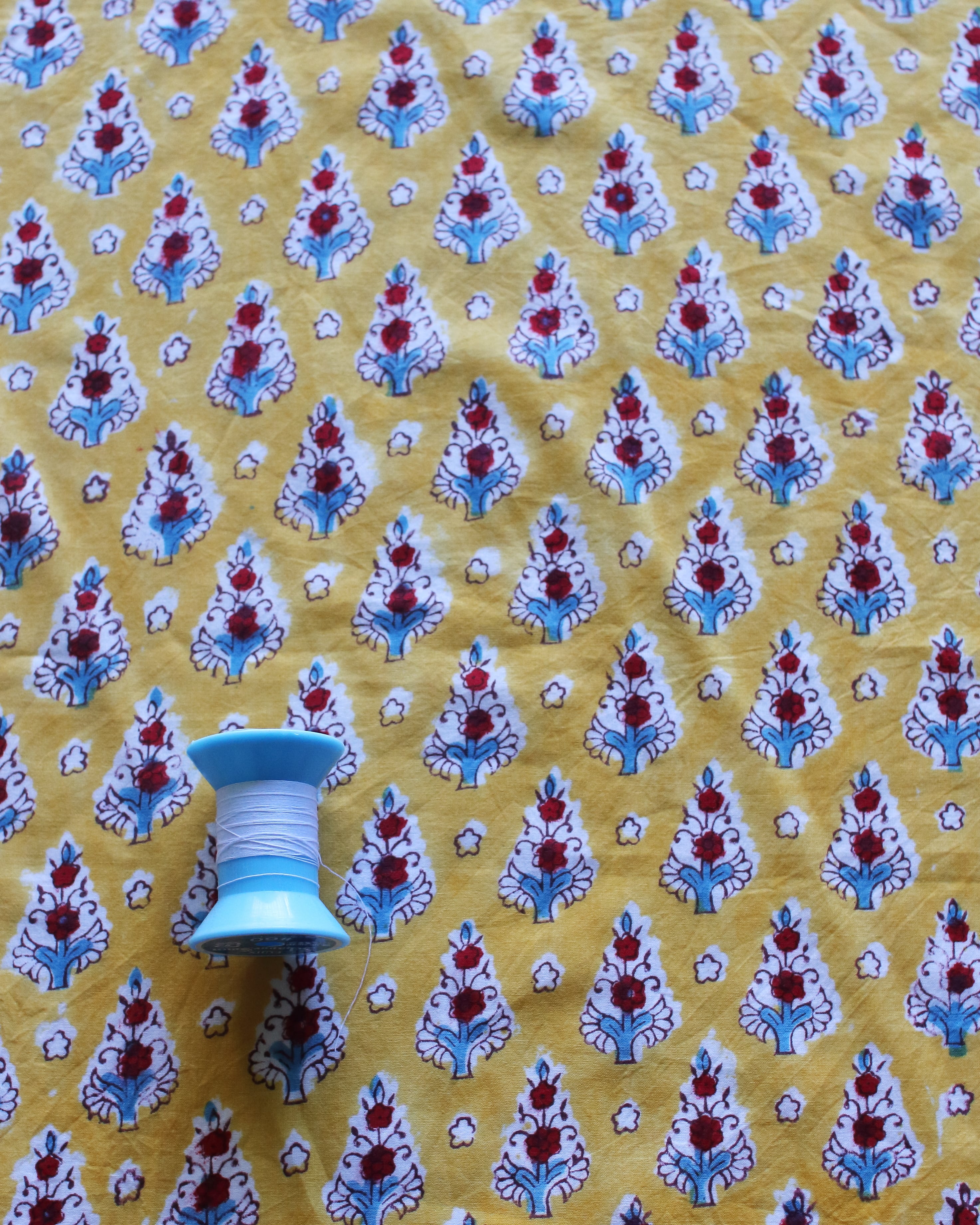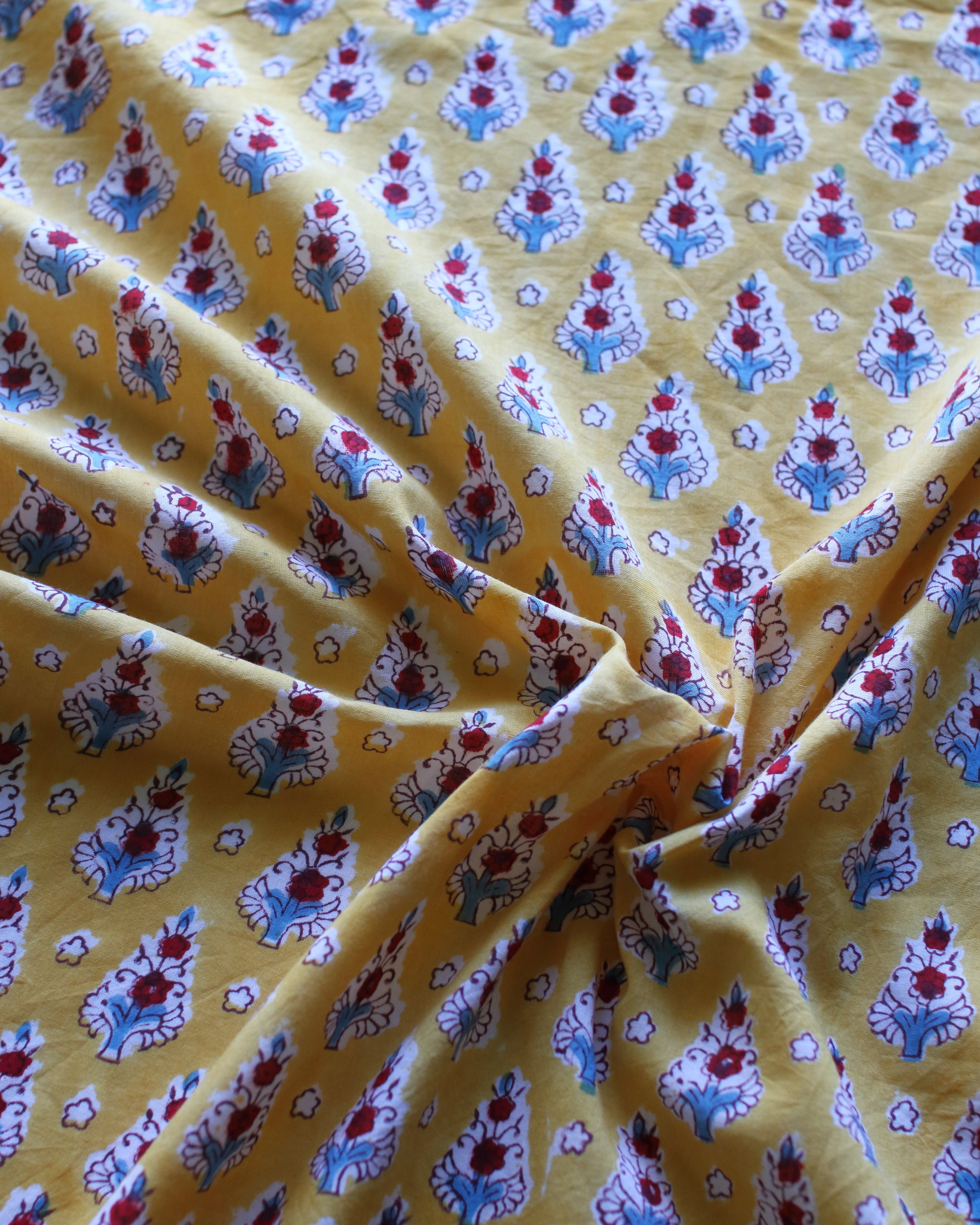 ハンドブロックプリントはインドの伝統的な技法で、手彫りの木版をひとつひとつ布に押しあてて制作していく、あたたかみ溢れるコットンファブリックです。
