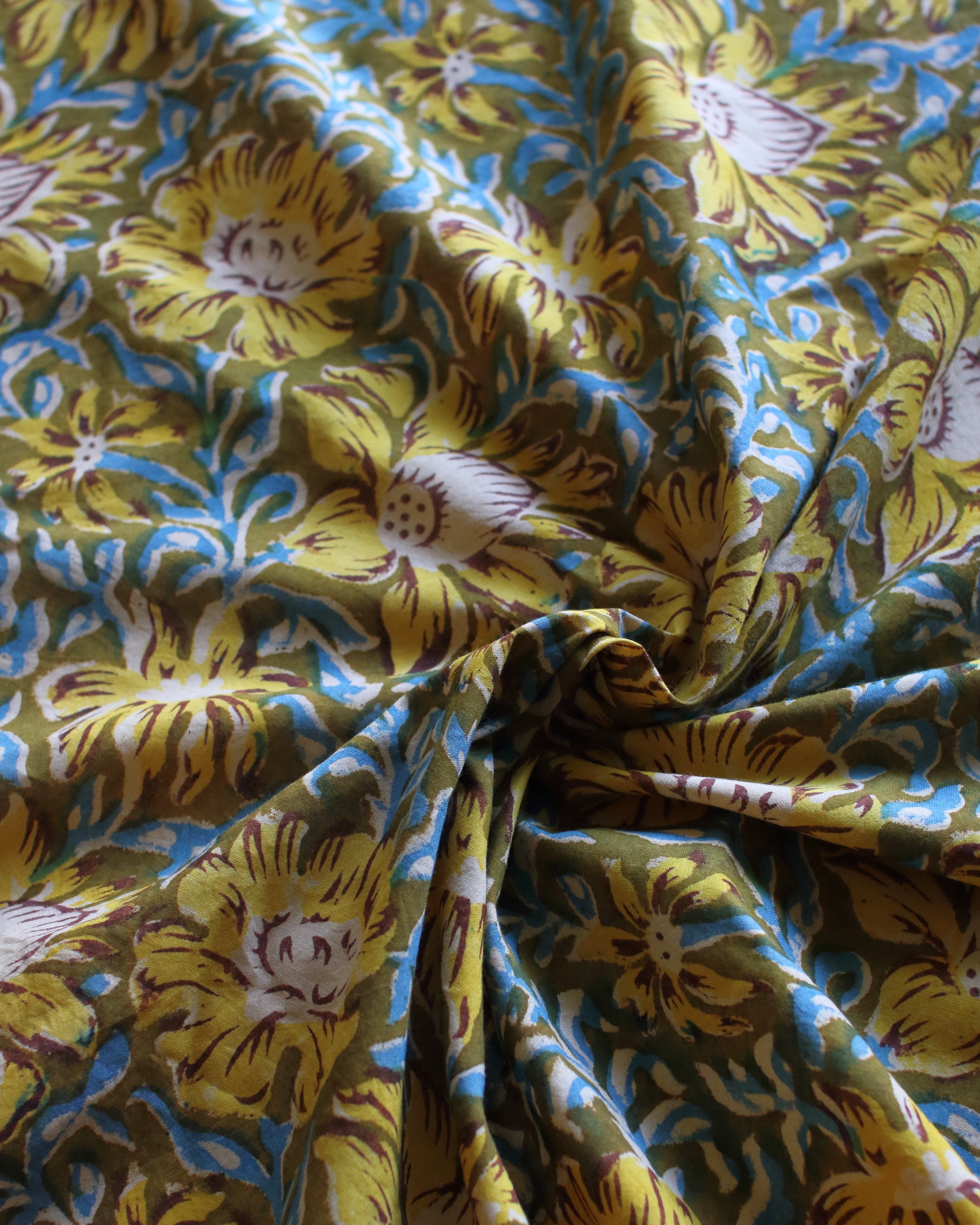 ハンドブロックプリントはインドの伝統的な技法で、手彫りの木版をひとつひとつ布に押しあてて制作していく、あたたかみ溢れるコットンファブリックです。