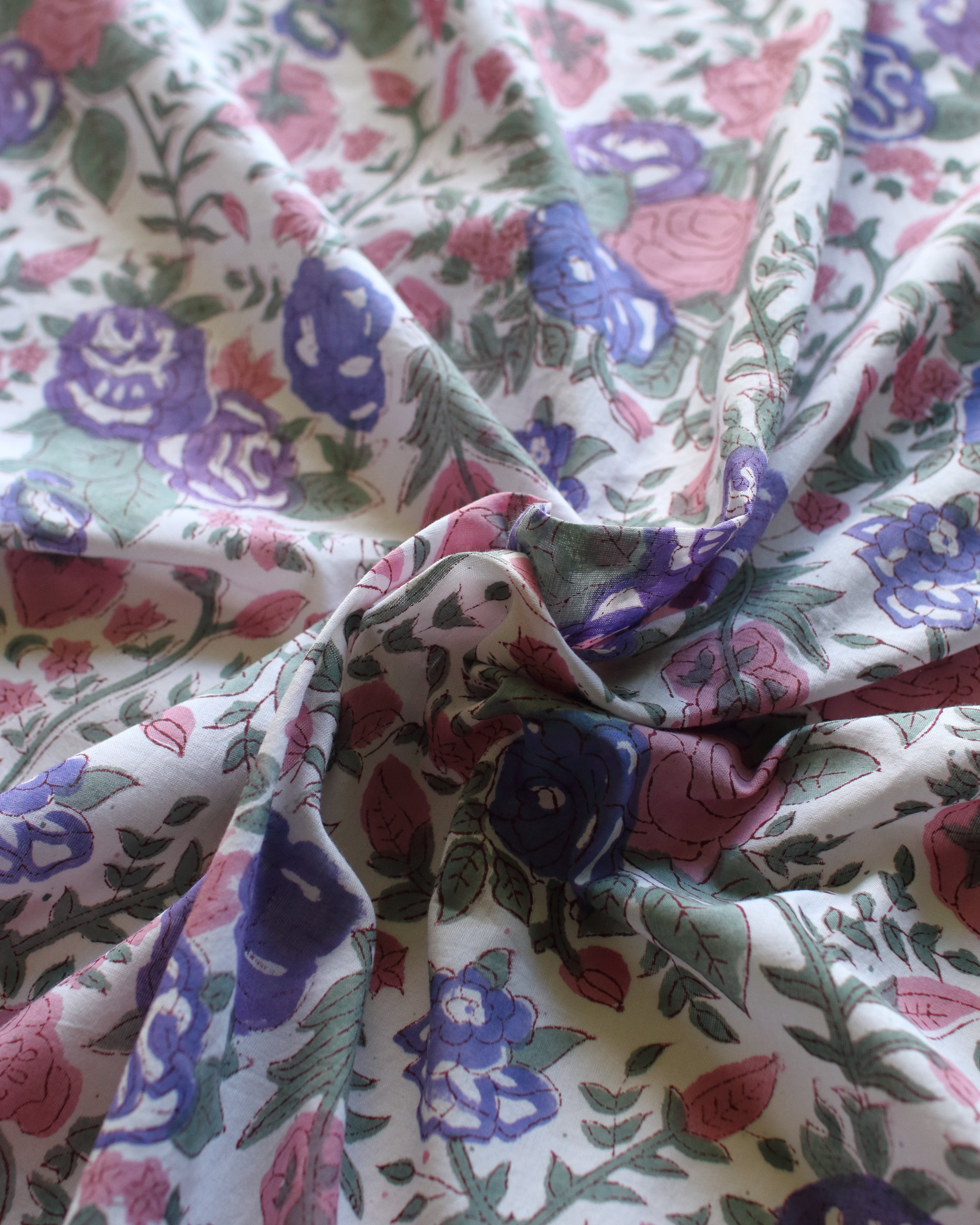 ハンドブロックプリントはインドの伝統的な技法で、手彫りの木版をひとつひとつ布に押しあてて制作していく、あたたかみ溢れるコットンファブリックです。