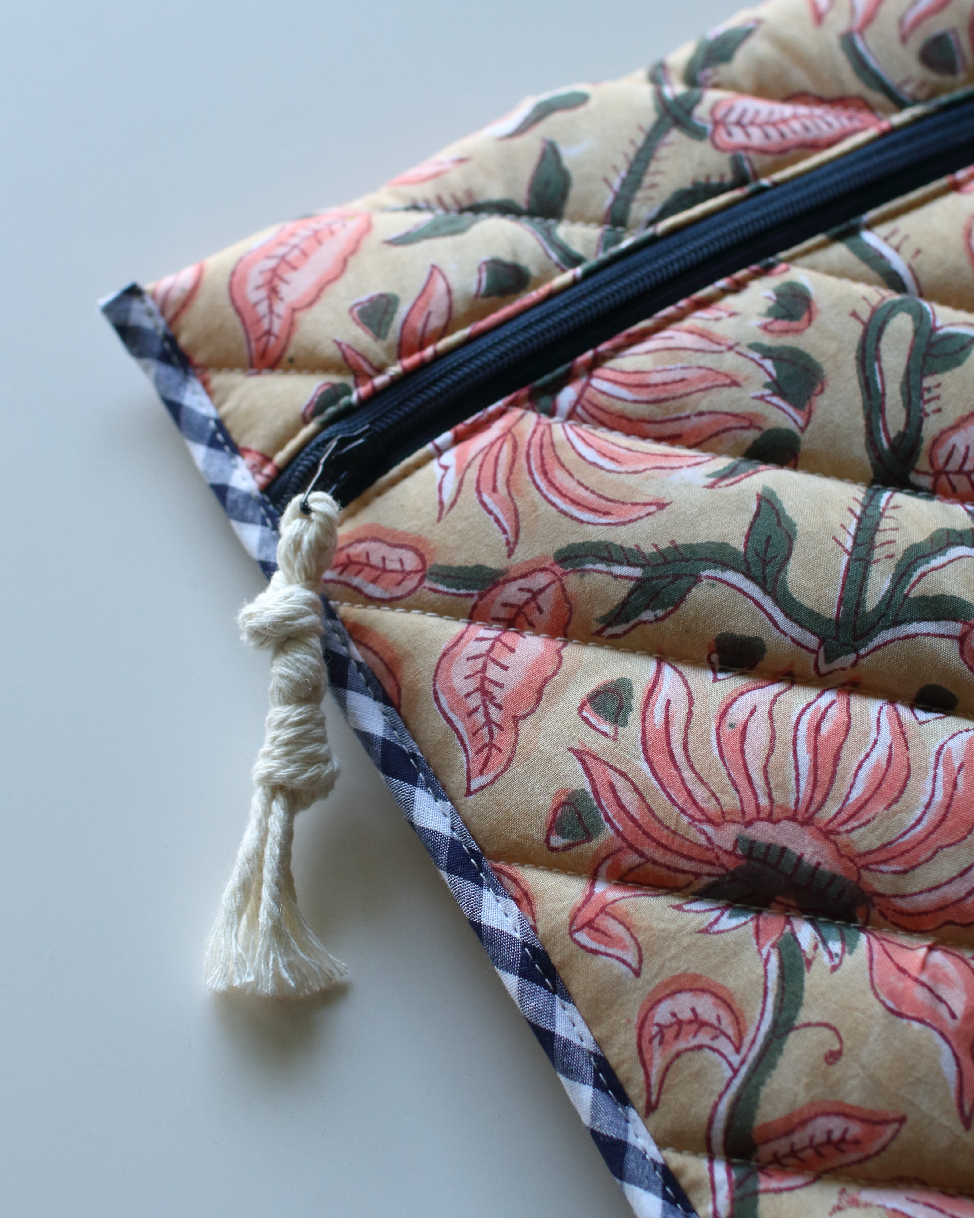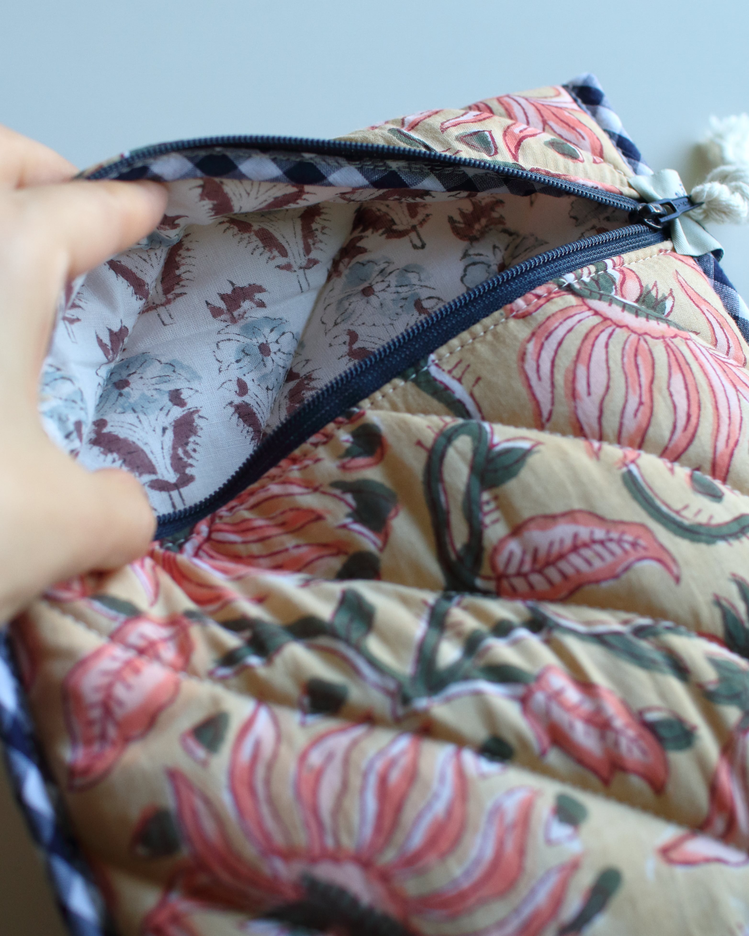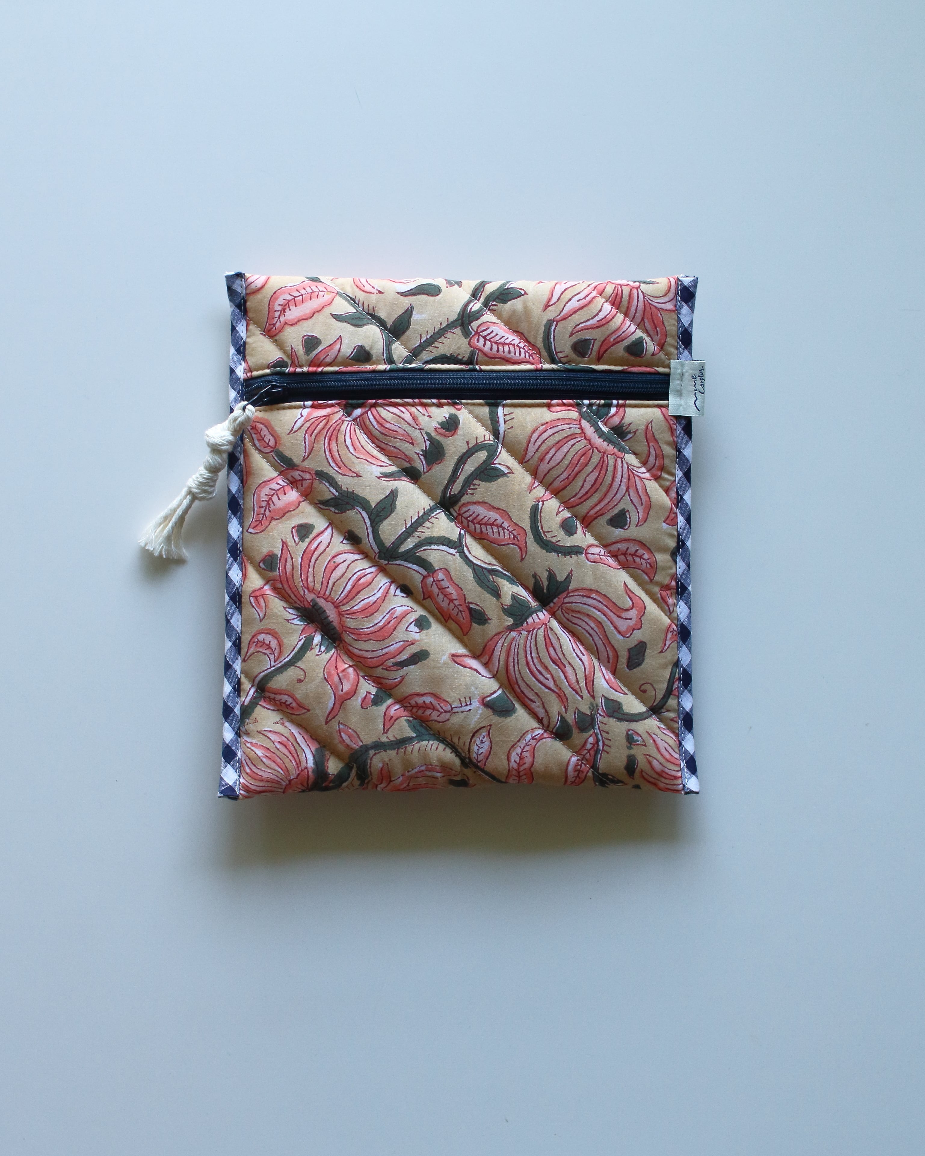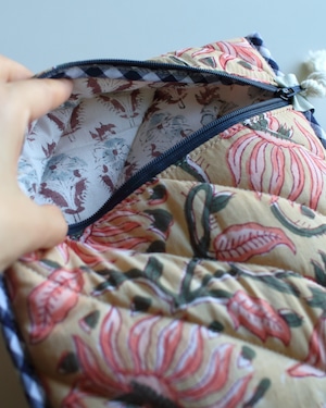 裏地にもブロックプリントの柄を配置していて、縁取りの組み合わせもひとつひとつ違っている、全て1点ずつの制作となります。