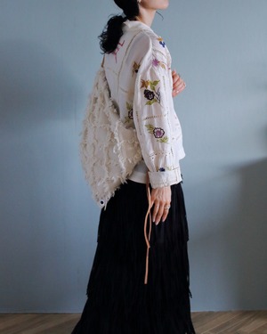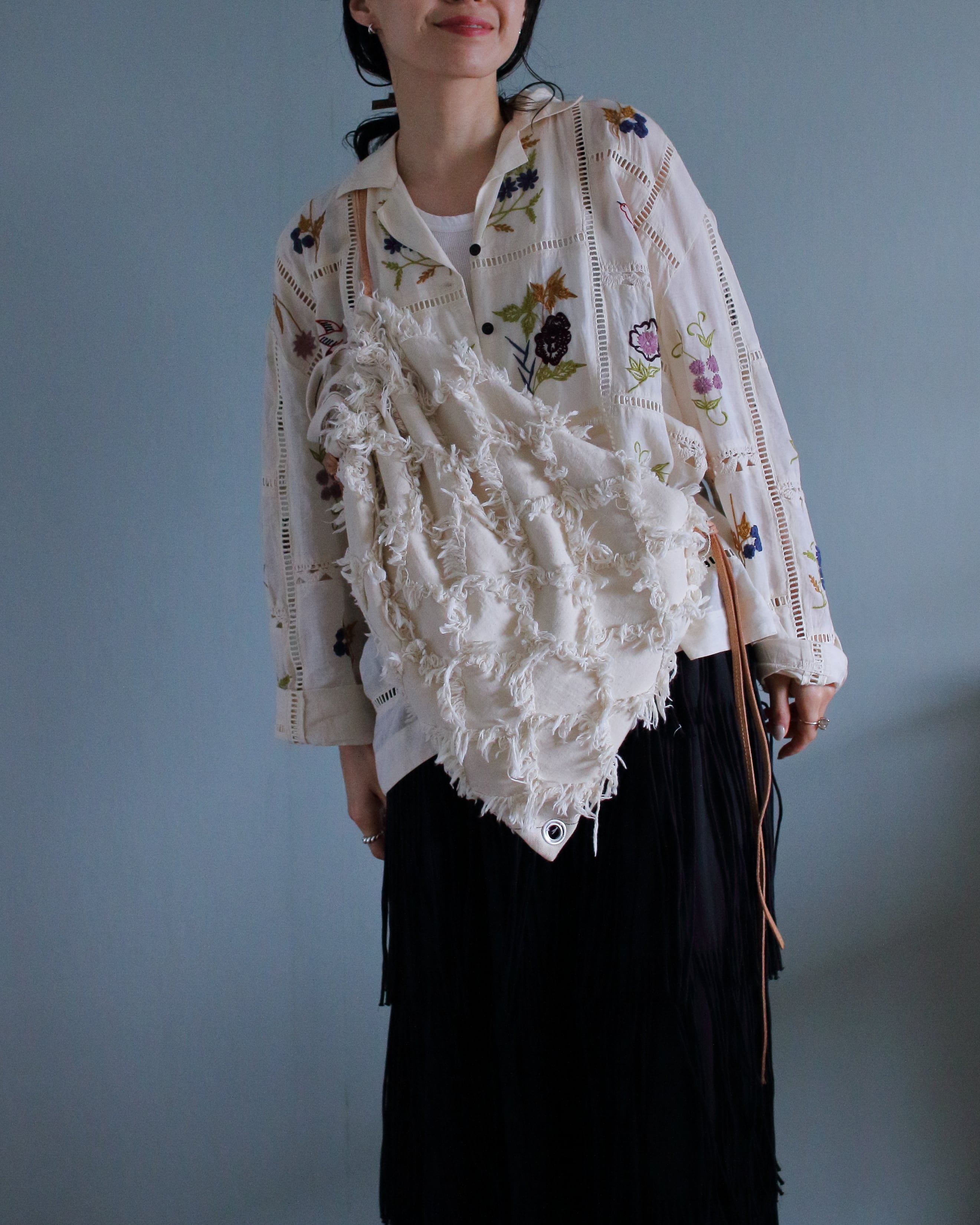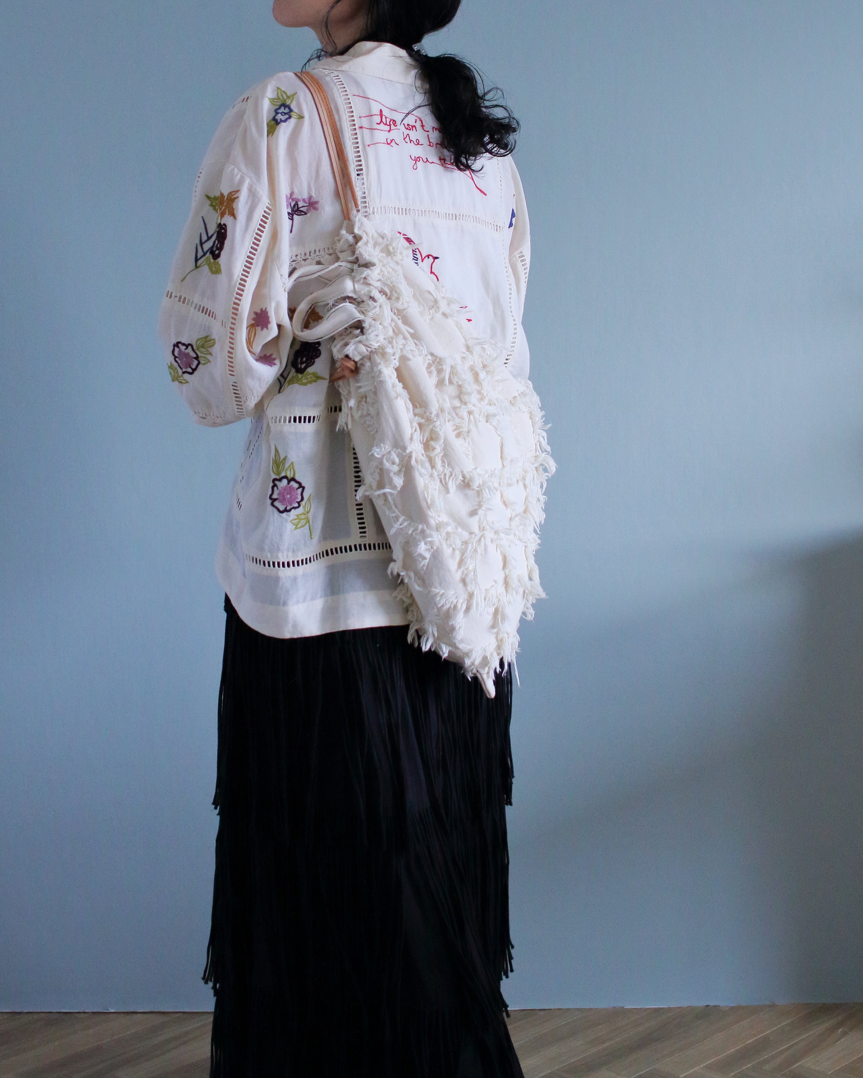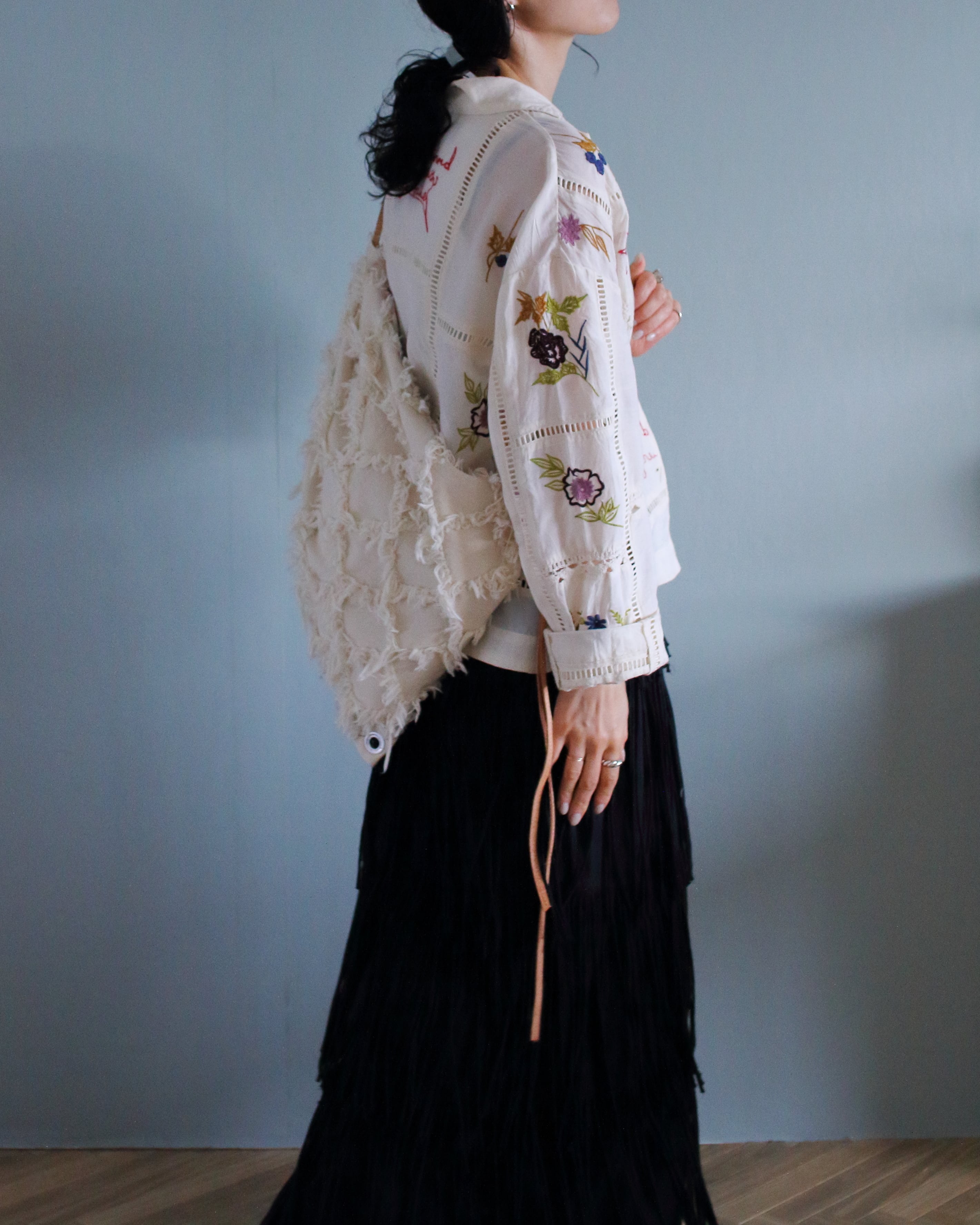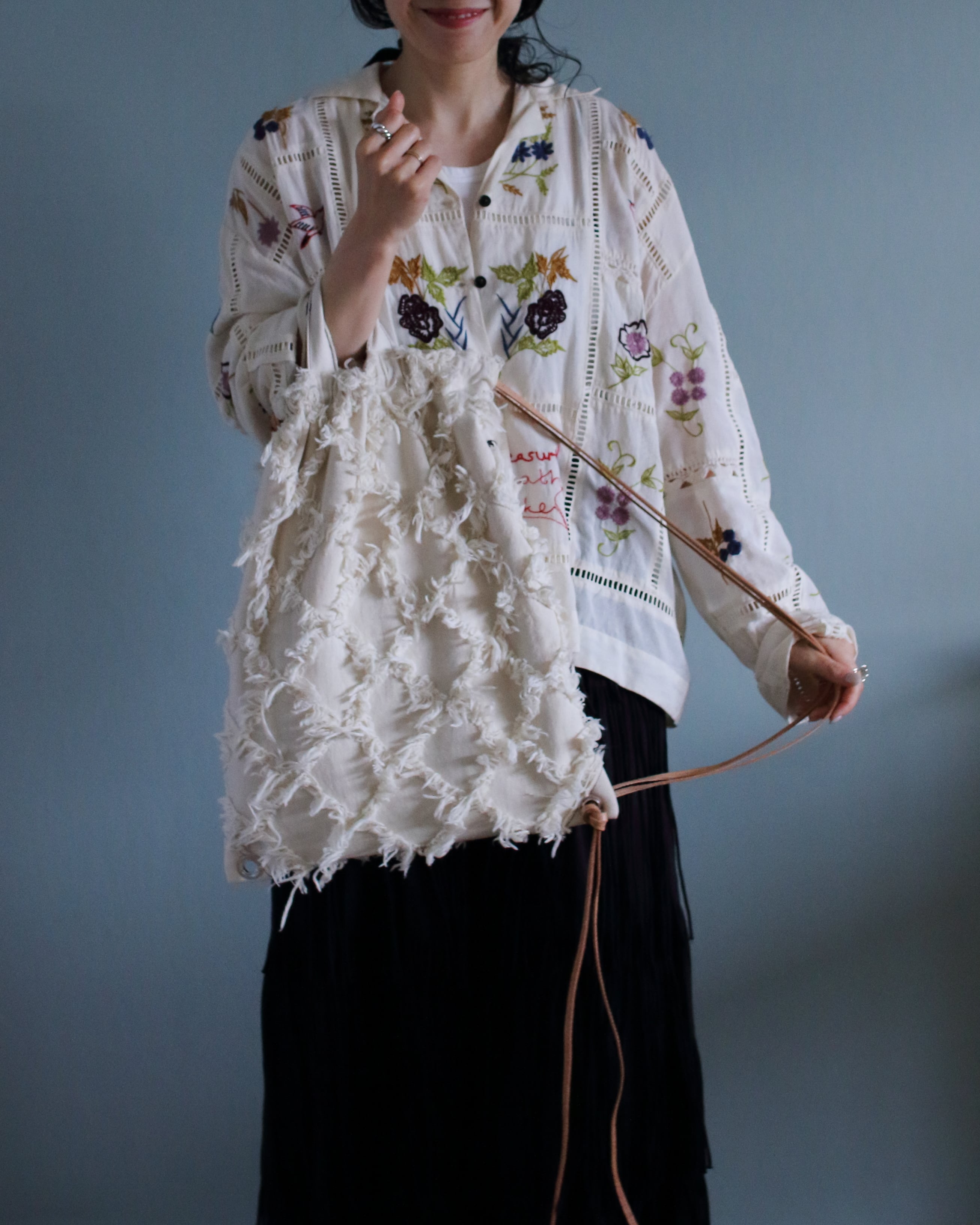 生成りの自然な風合いながら印象的なイメージを与えてくれる華やかなバッグに仕上がりました。