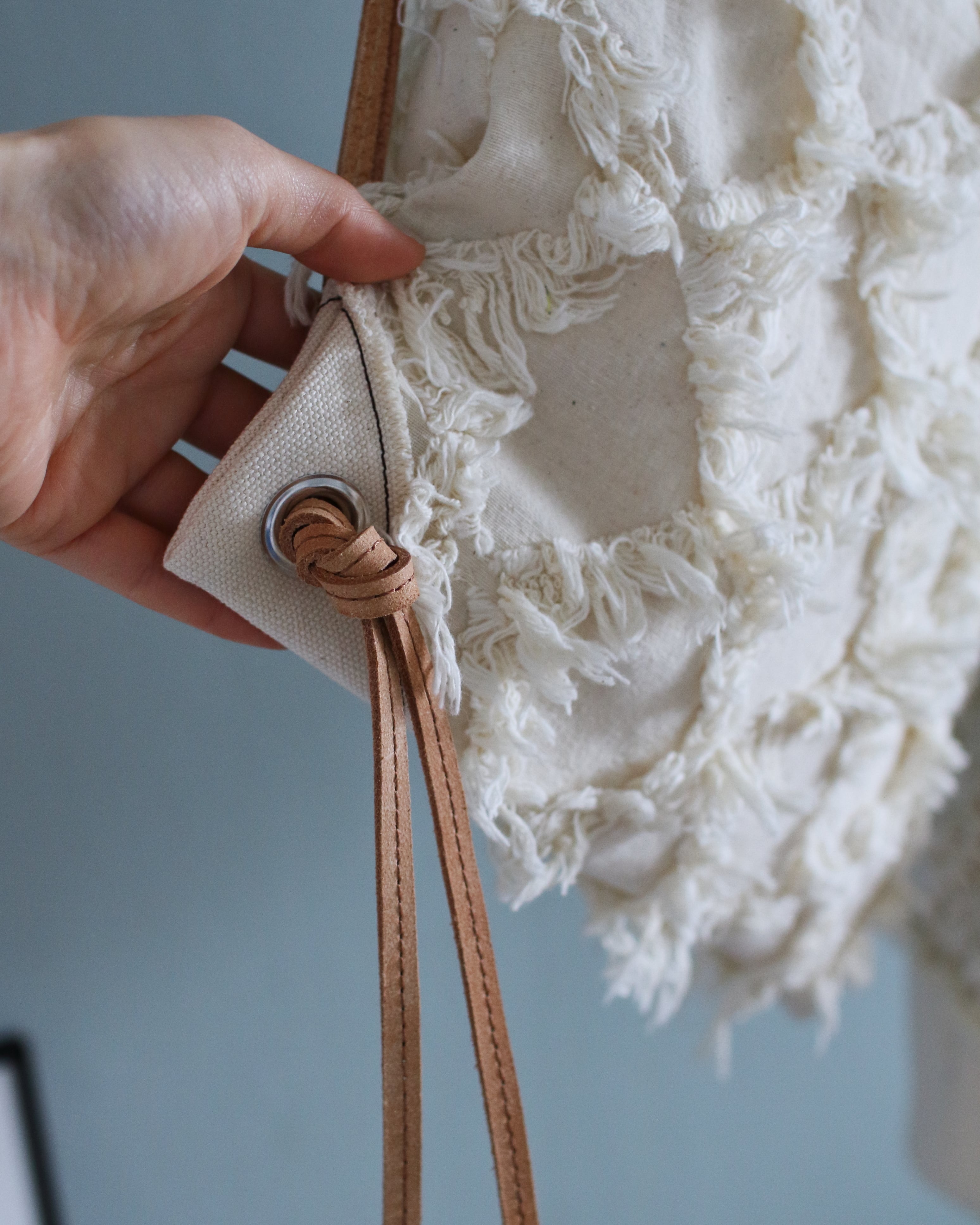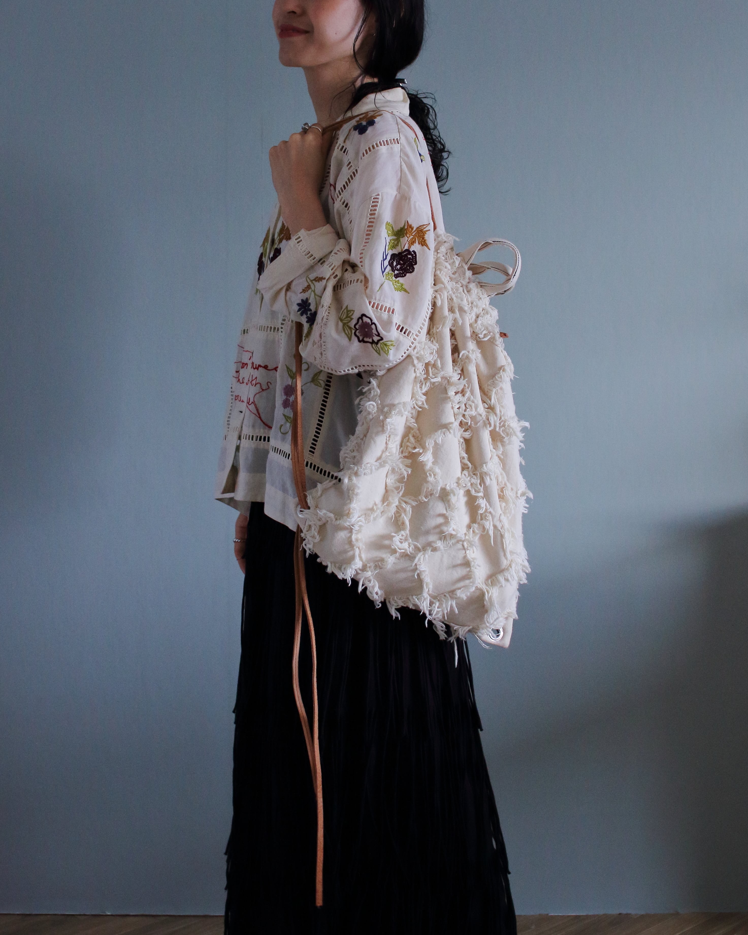 ダイヤ型に起毛したフリンジ生地をふんだんに使ったナップサック。