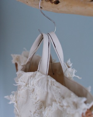 力強いコットン生地と持ち手は牛革の平紐にステッチを入れて、コントラストがありながらの統一感を目指しました。