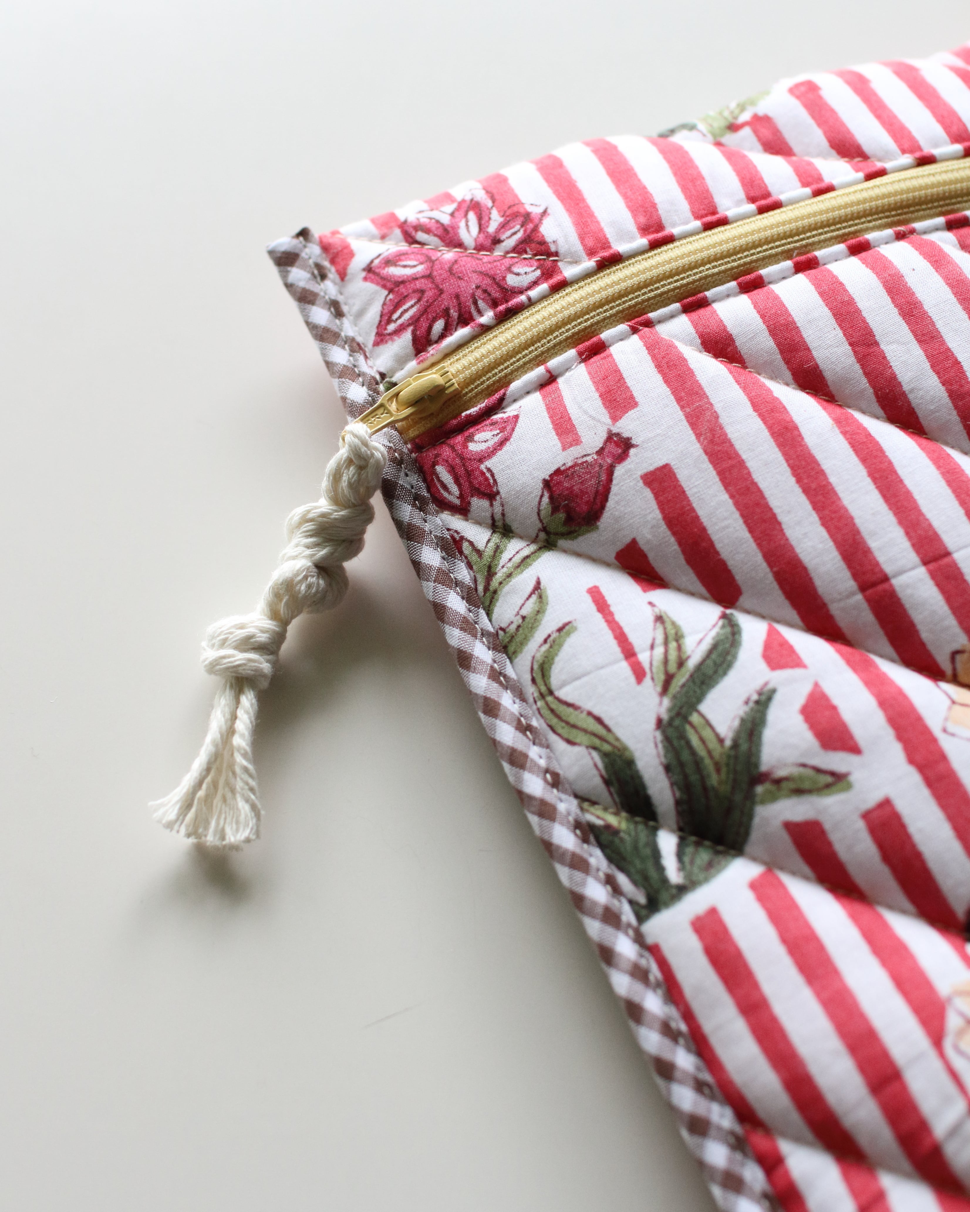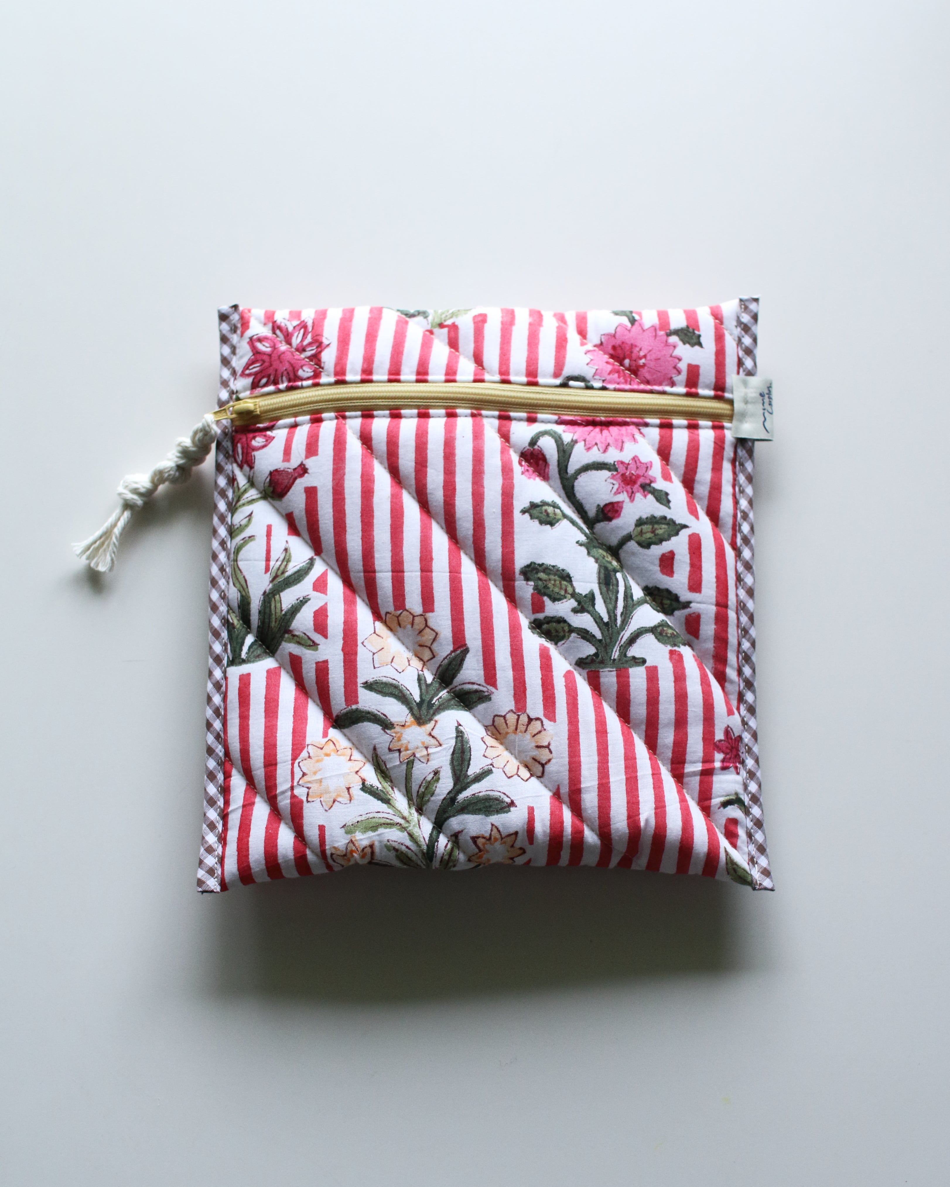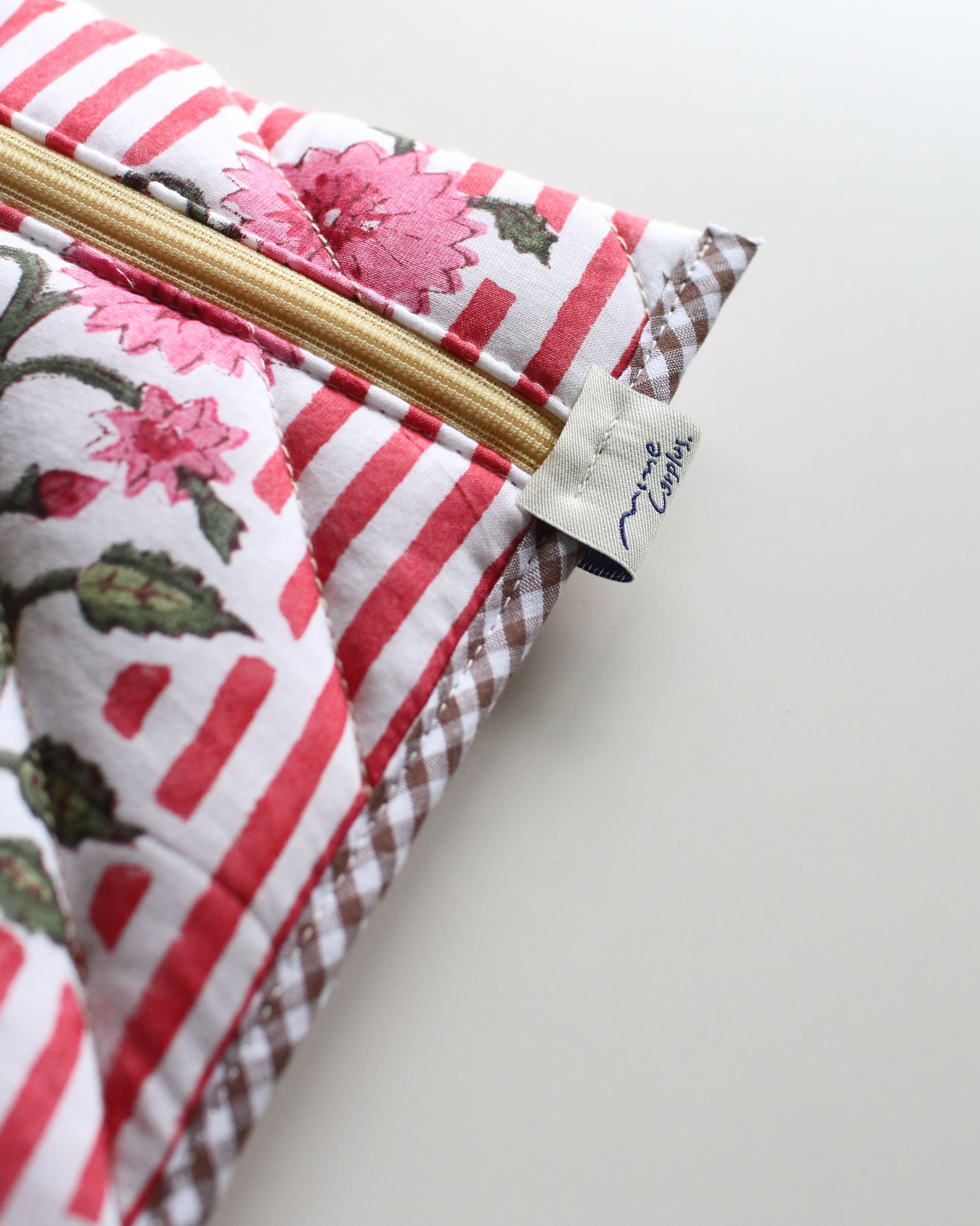 裏地にもブロックプリントの柄を配置していて、縁取りの組み合わせもひとつひとつ違っている、全て1点ずつの制作となります。
