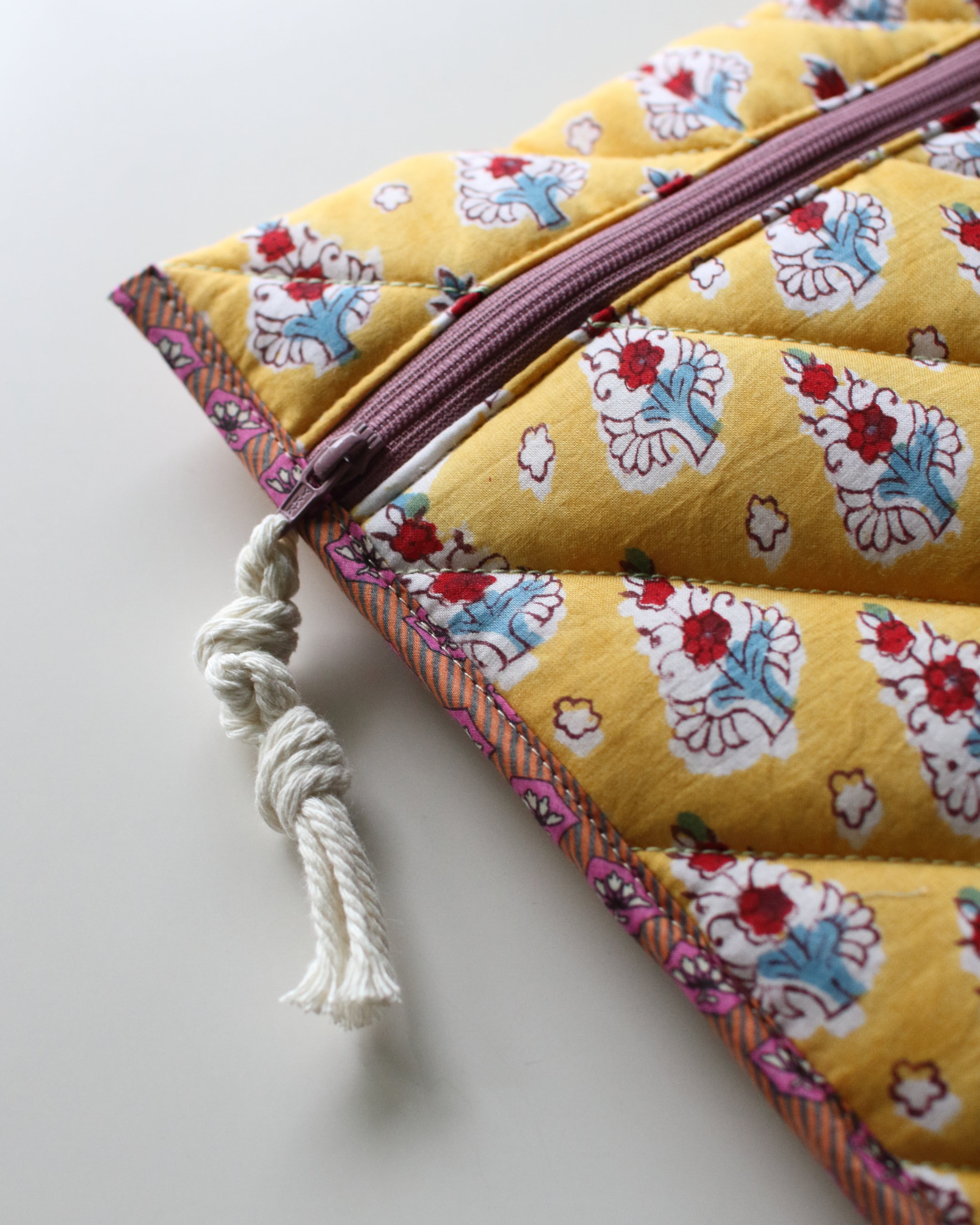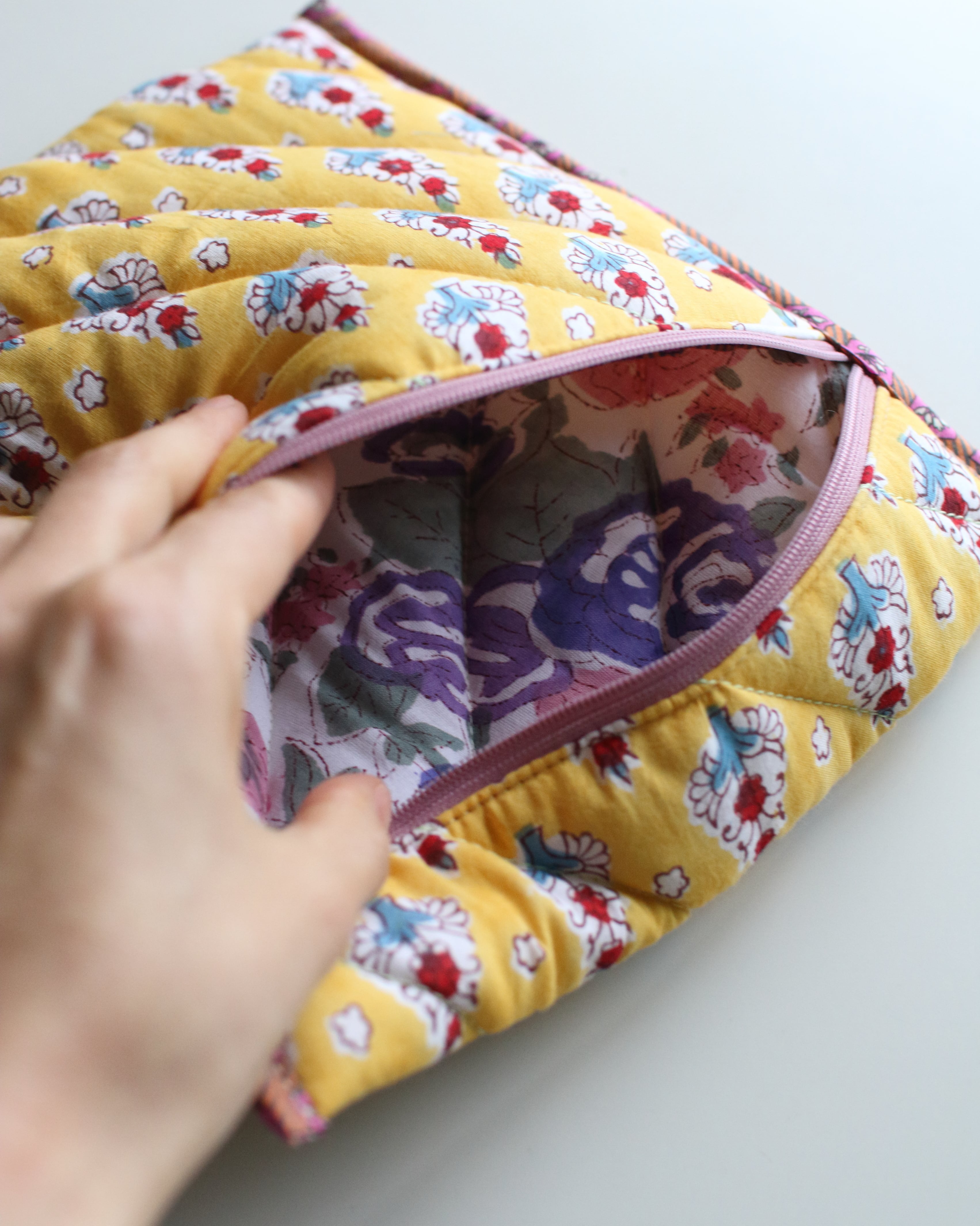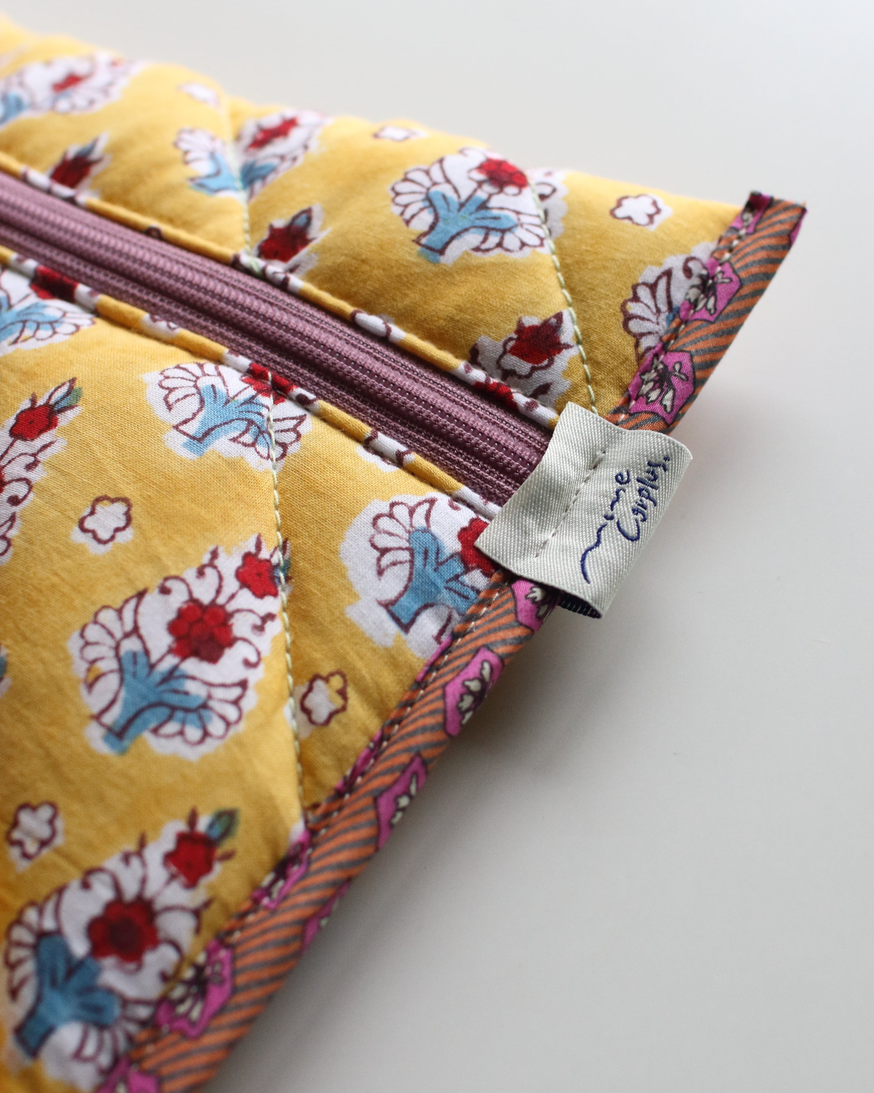 裏地にもブロックプリントの柄を配置していて、縁取りの組み合わせもひとつひとつ違っている、全て1点ずつの制作となります。