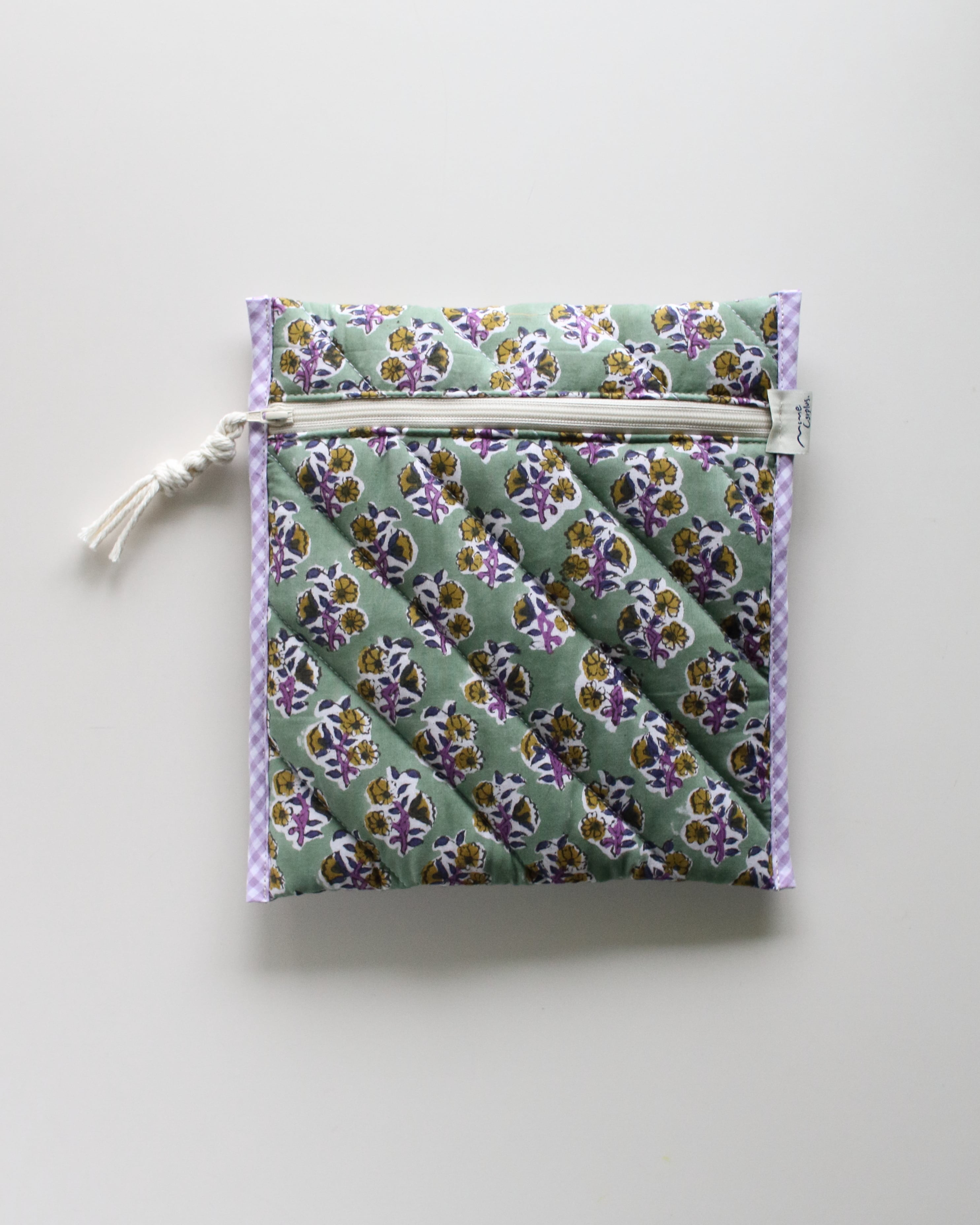 裏地にもブロックプリントの柄を配置していて、縁取りの組み合わせもひとつひとつ違っている、全て1点ずつの制作となります。