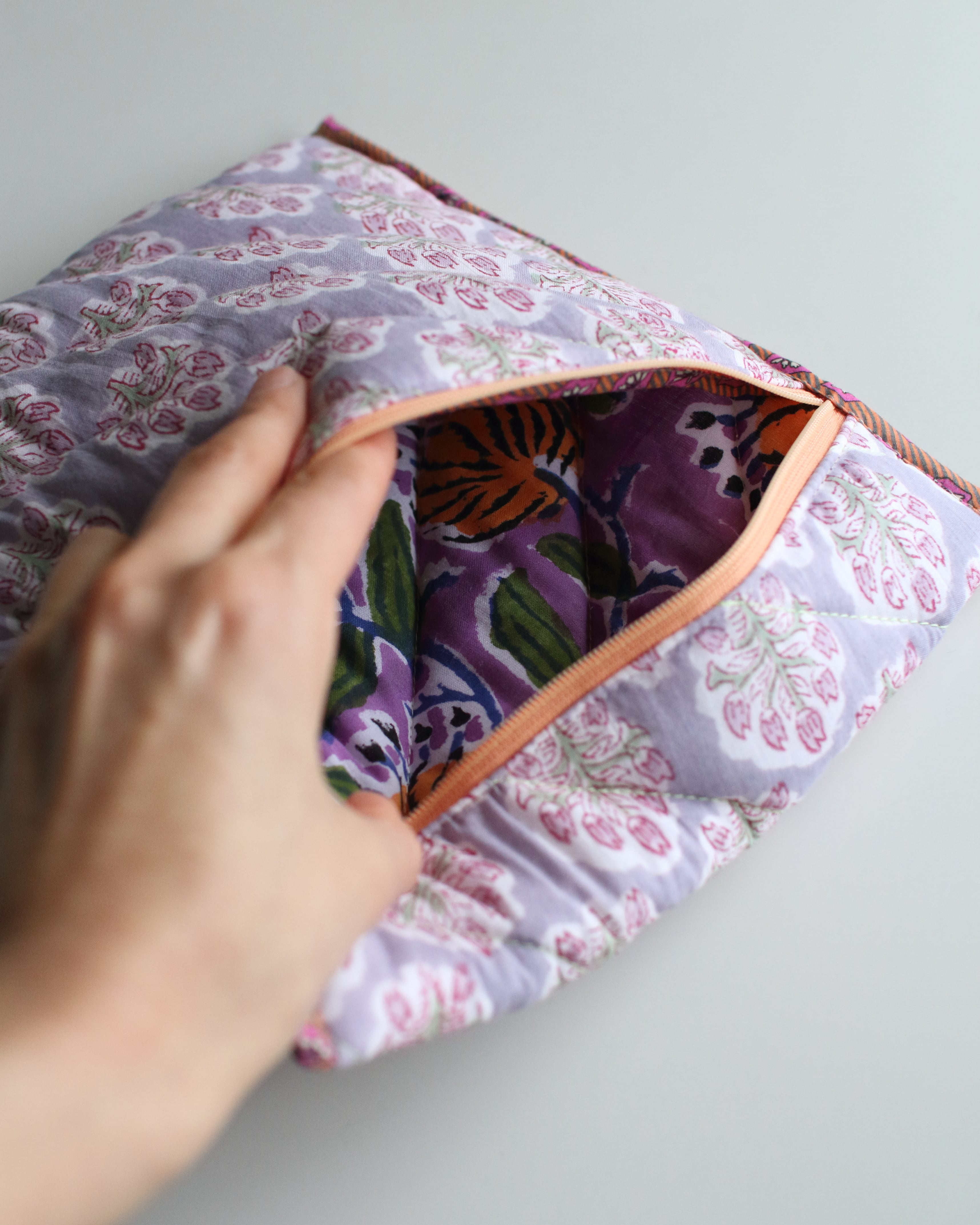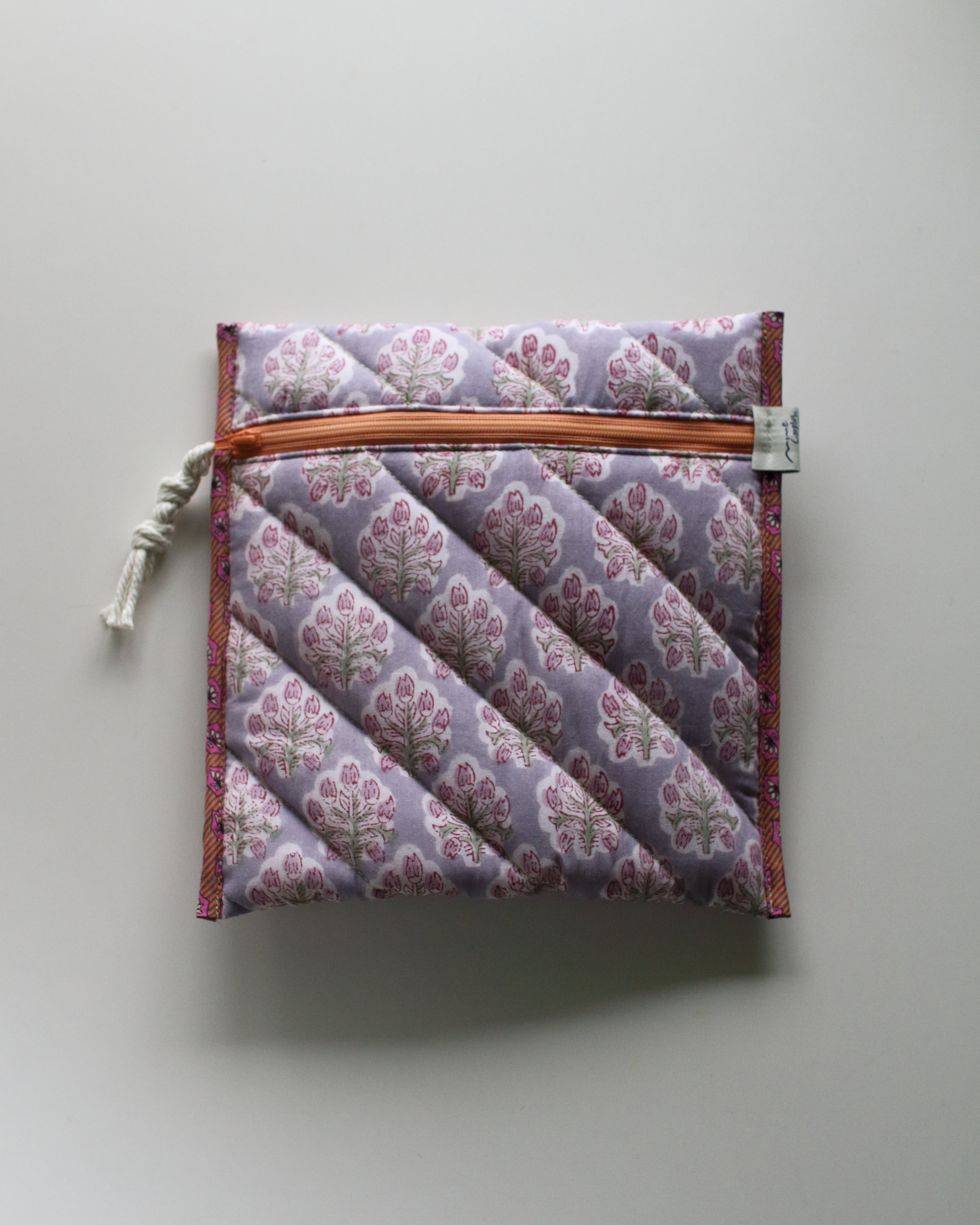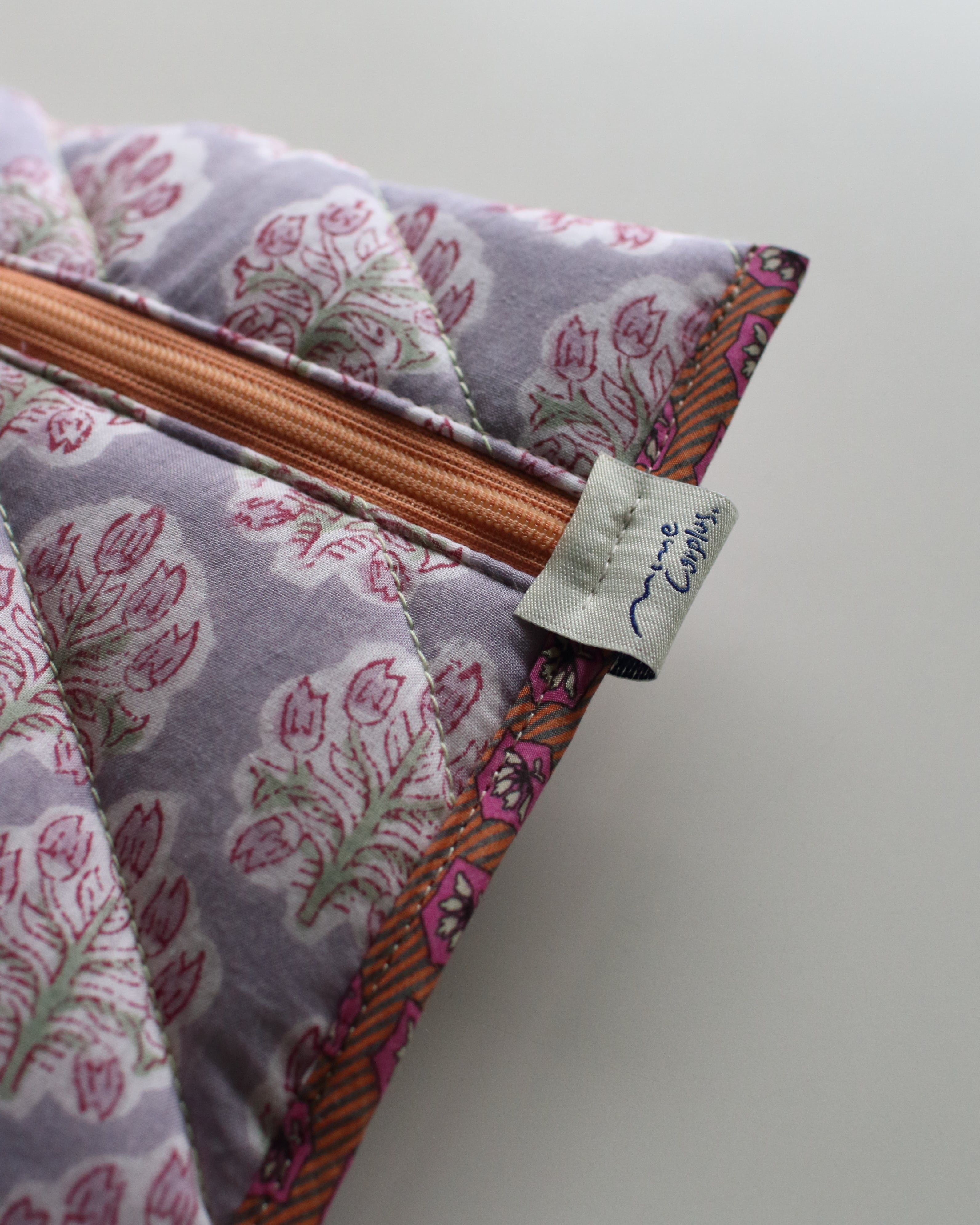裏地にもブロックプリントの柄を配置していて、縁取りの組み合わせもひとつひとつ違っている、全て1点ずつの制作となります。