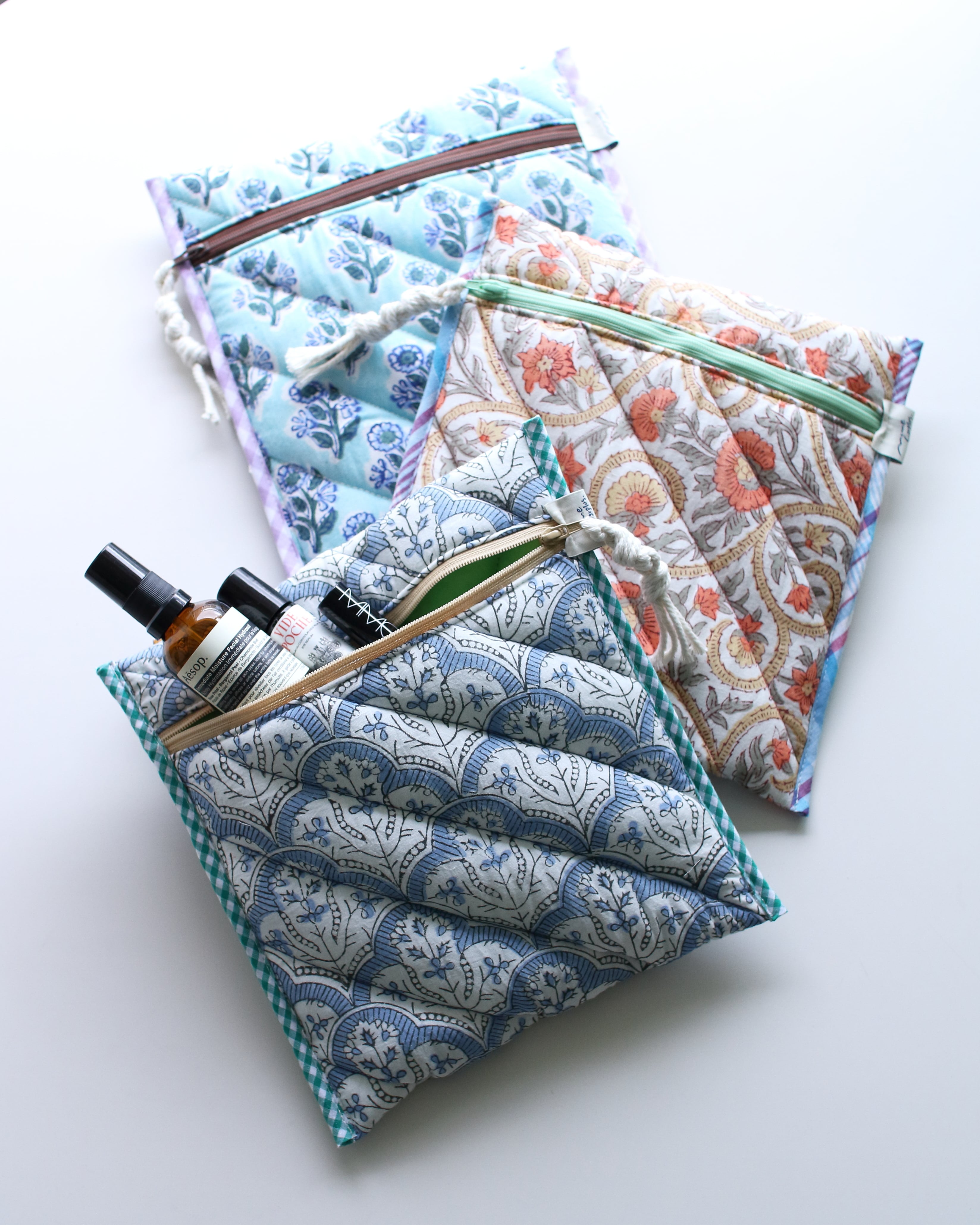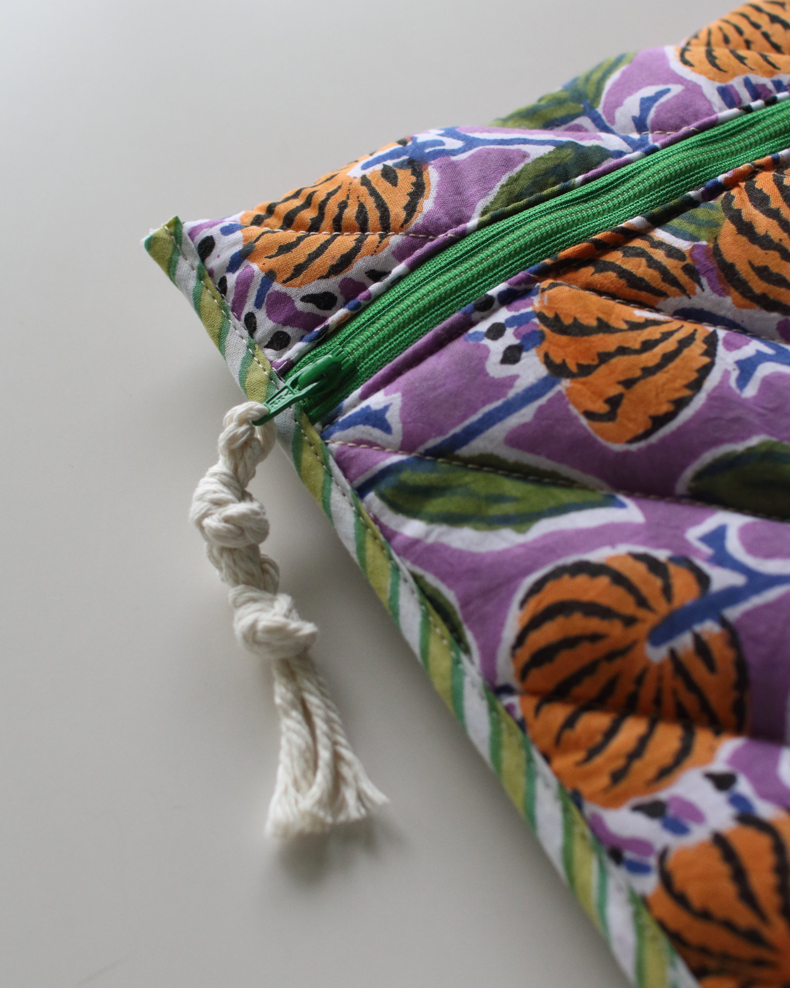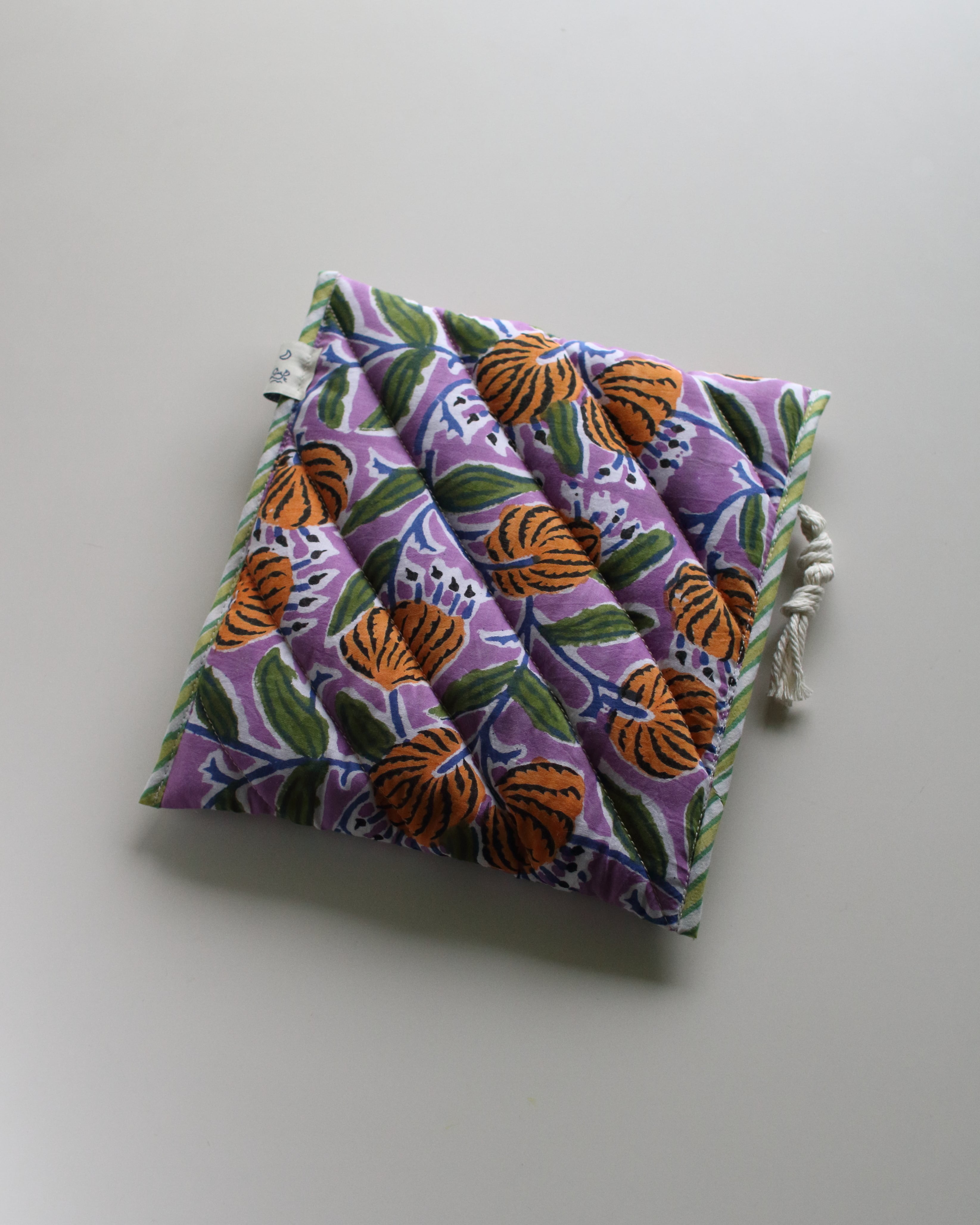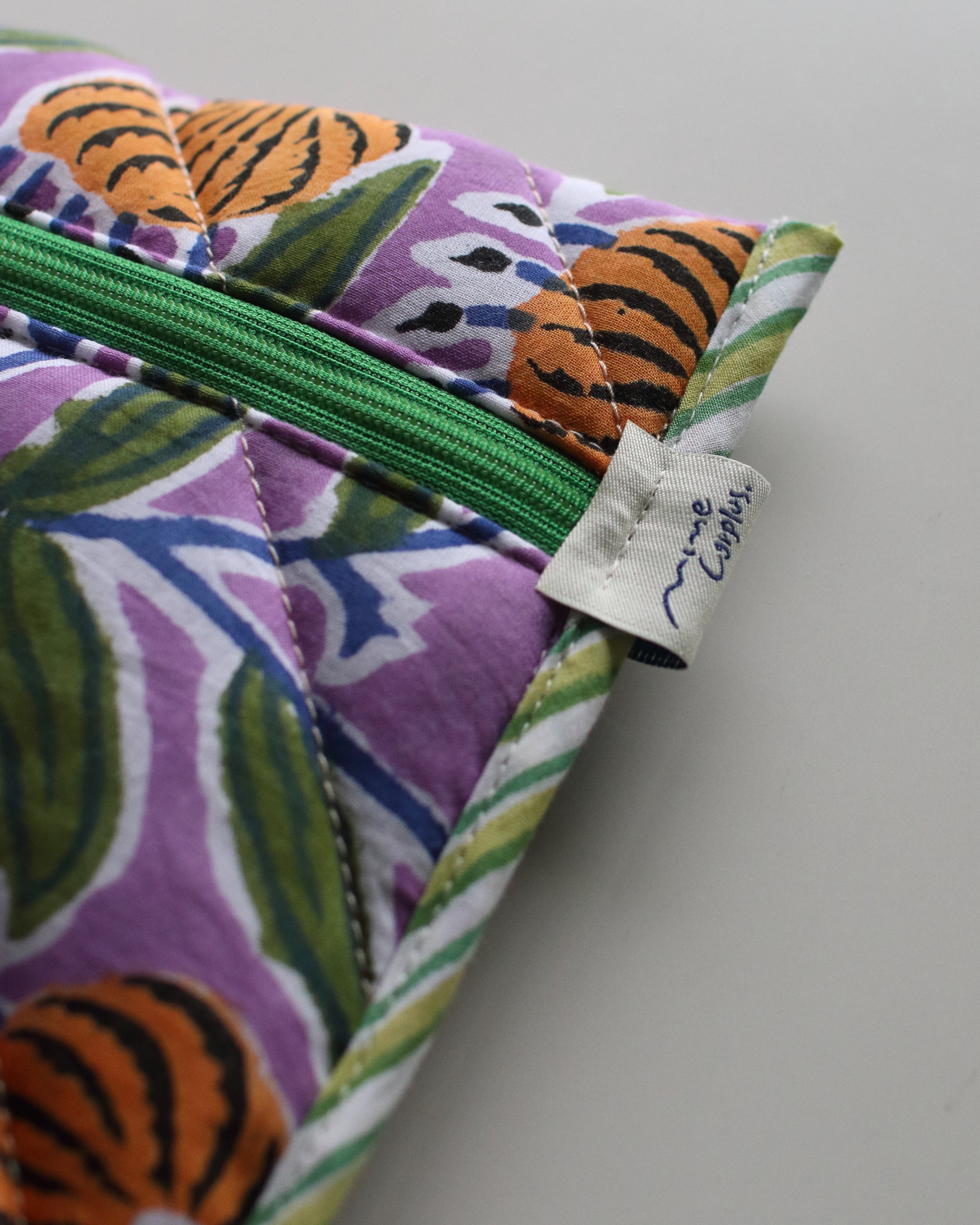裏地にもブロックプリントの柄を配置していて、縁取りの組み合わせもひとつひとつ違っている、全て1点ずつの制作となります。