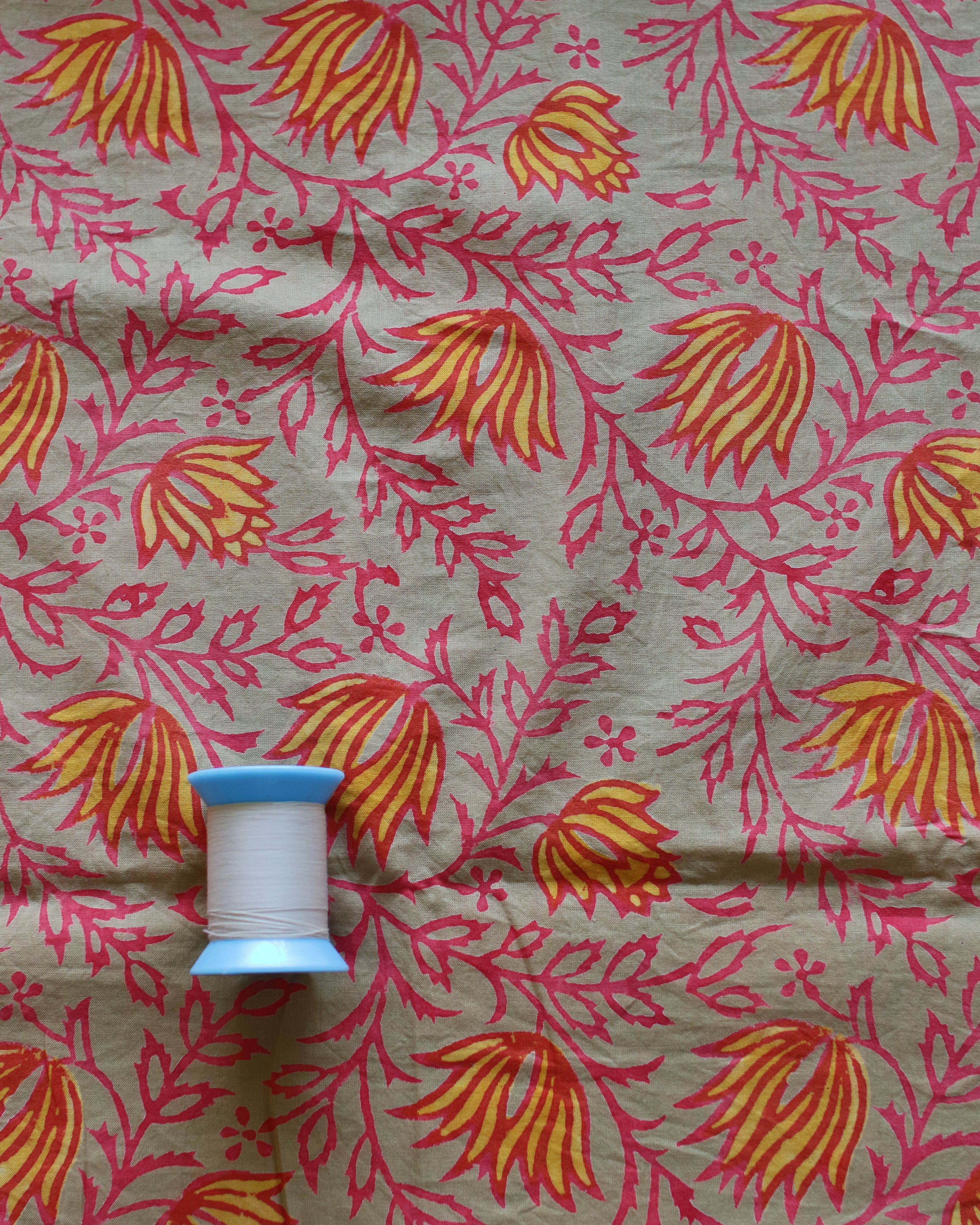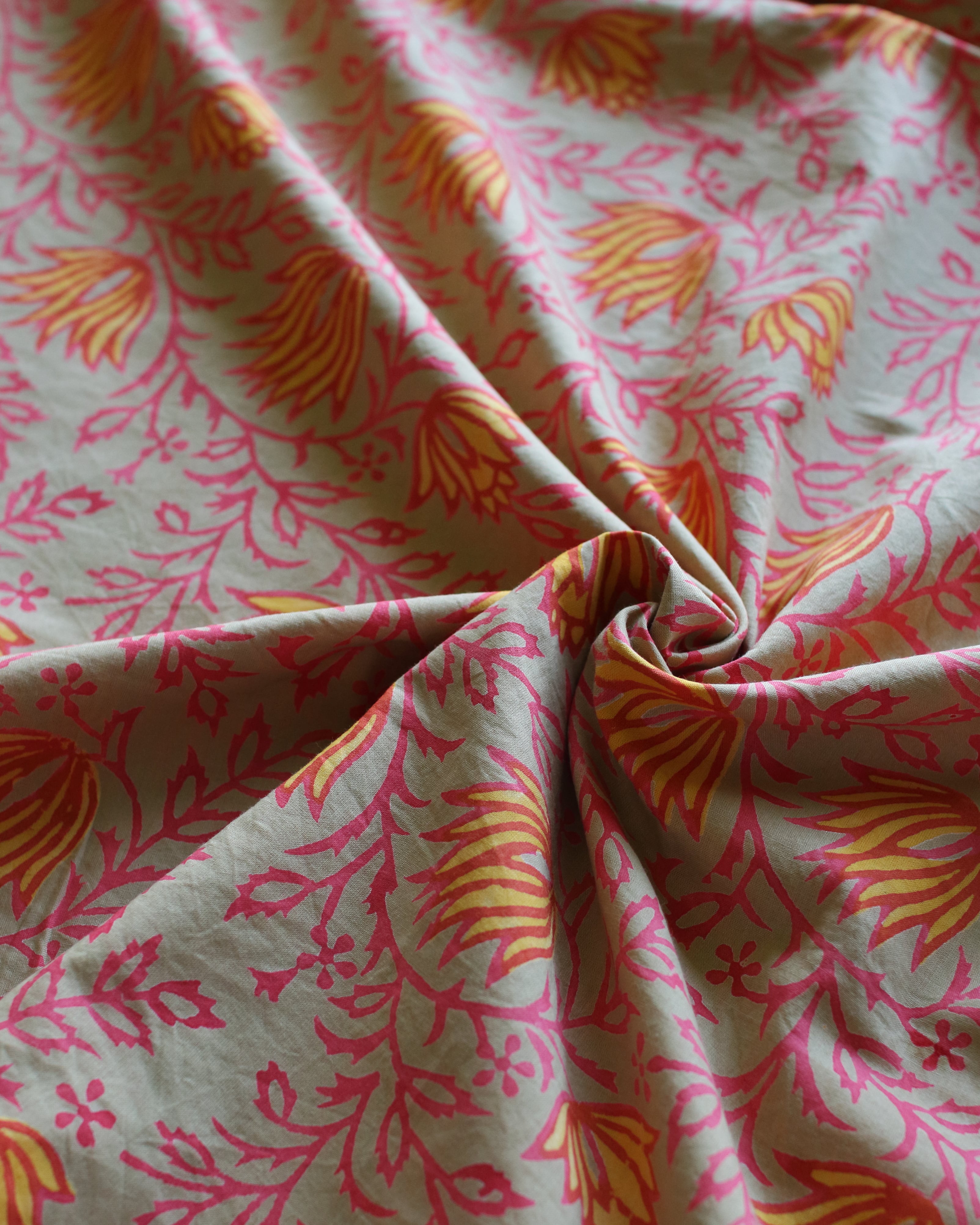 ハンドブロックプリントはインドの伝統的な技法で、手彫りの木版をひとつひとつ布に押しあてて制作していく、あたたかみ溢れるコットンファブリックです。