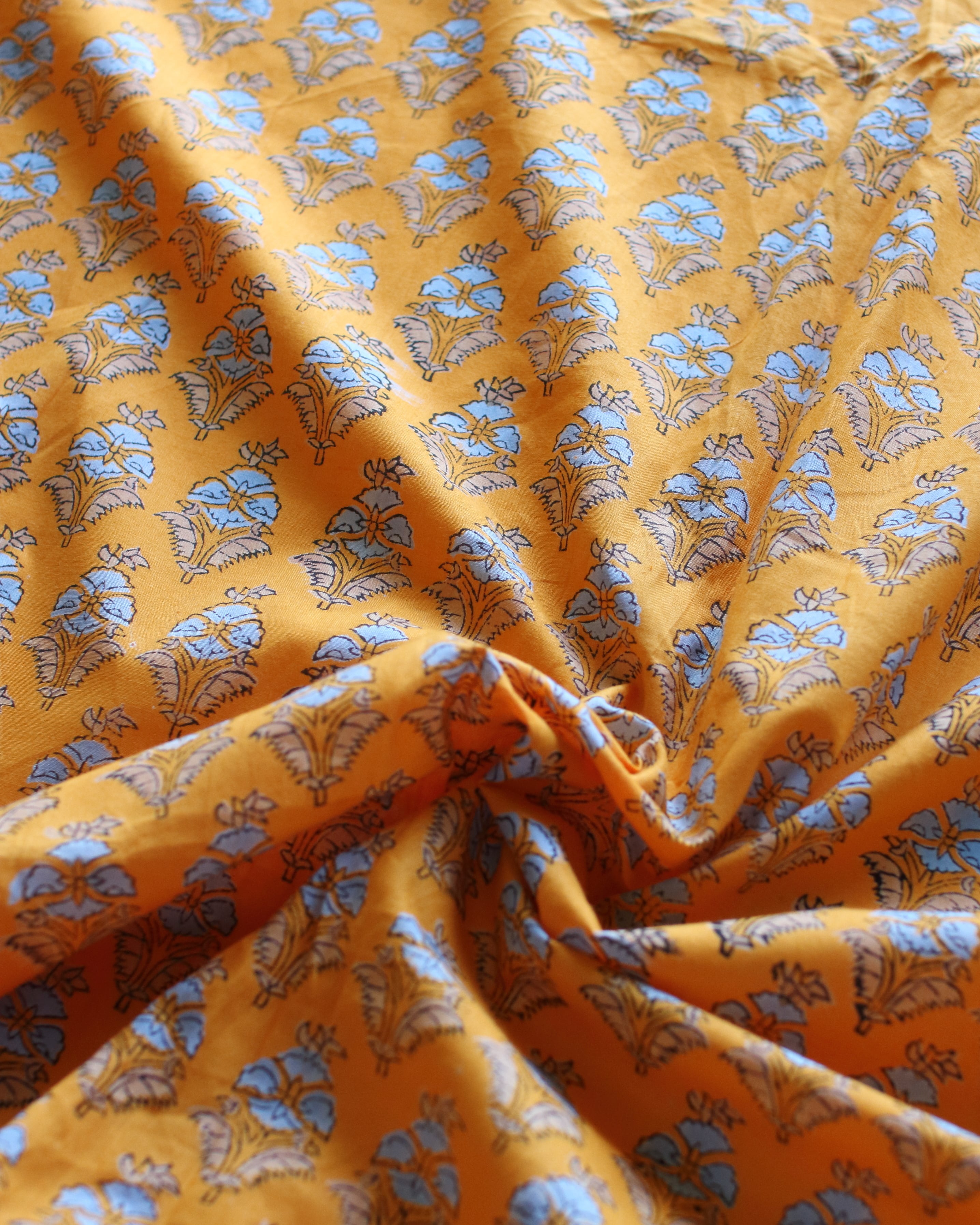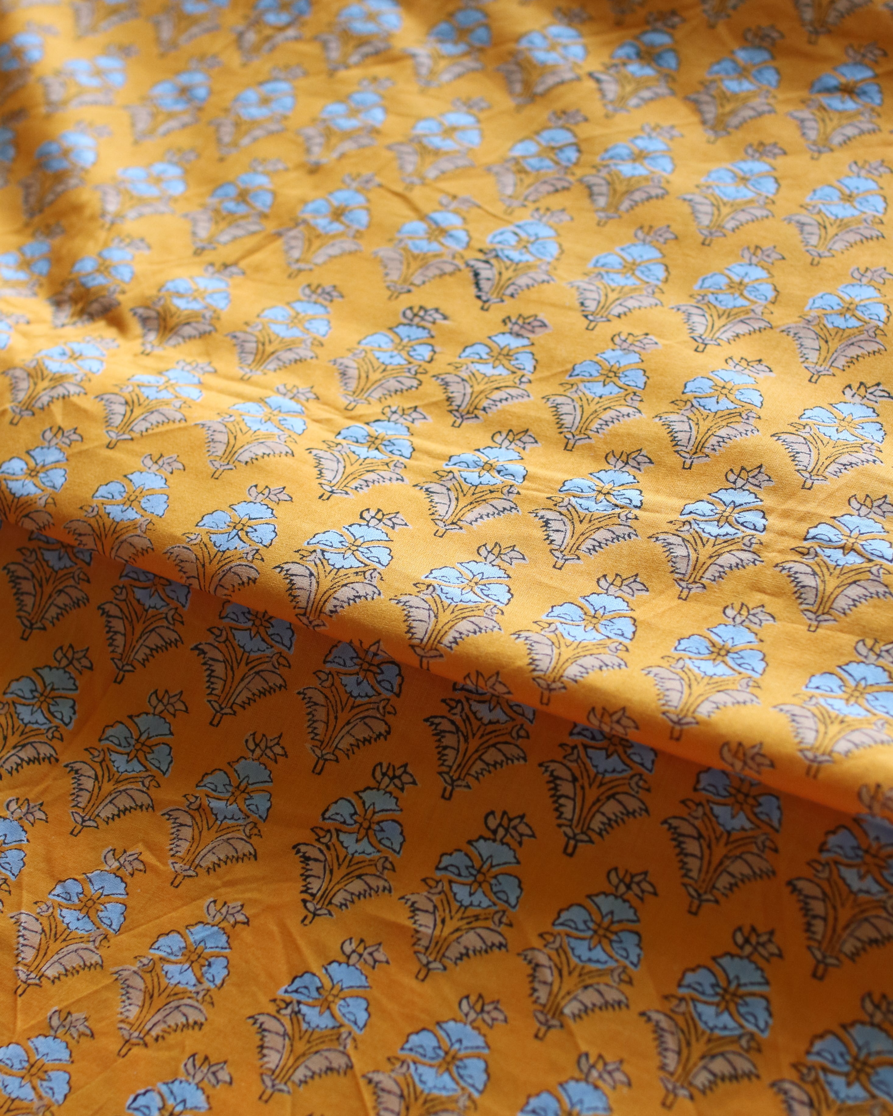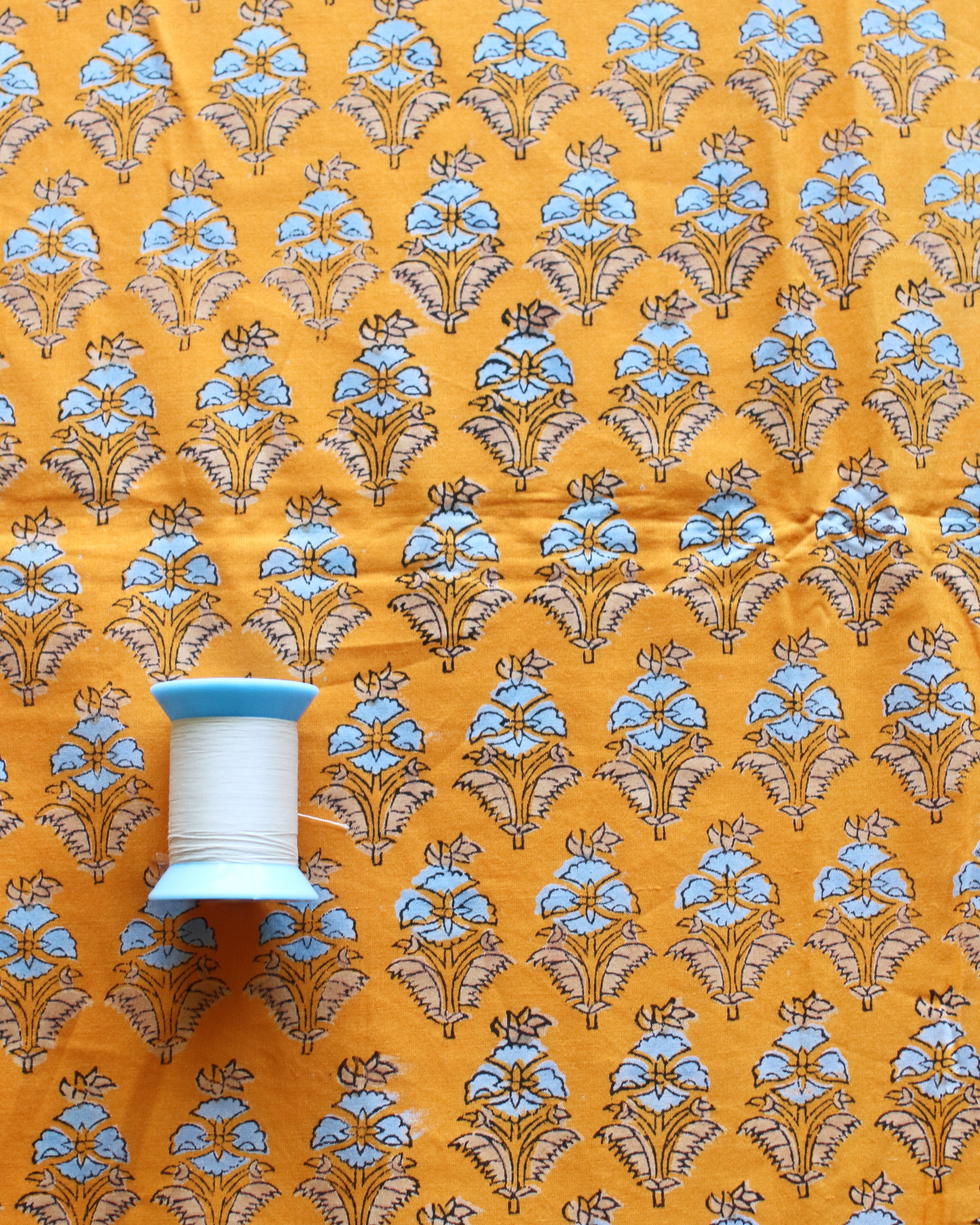 ハンドブロックプリントはインドの伝統的な技法で、手彫りの木版をひとつひとつ布に押しあてて制作していく、あたたかみ溢れるコットンファブリックです。