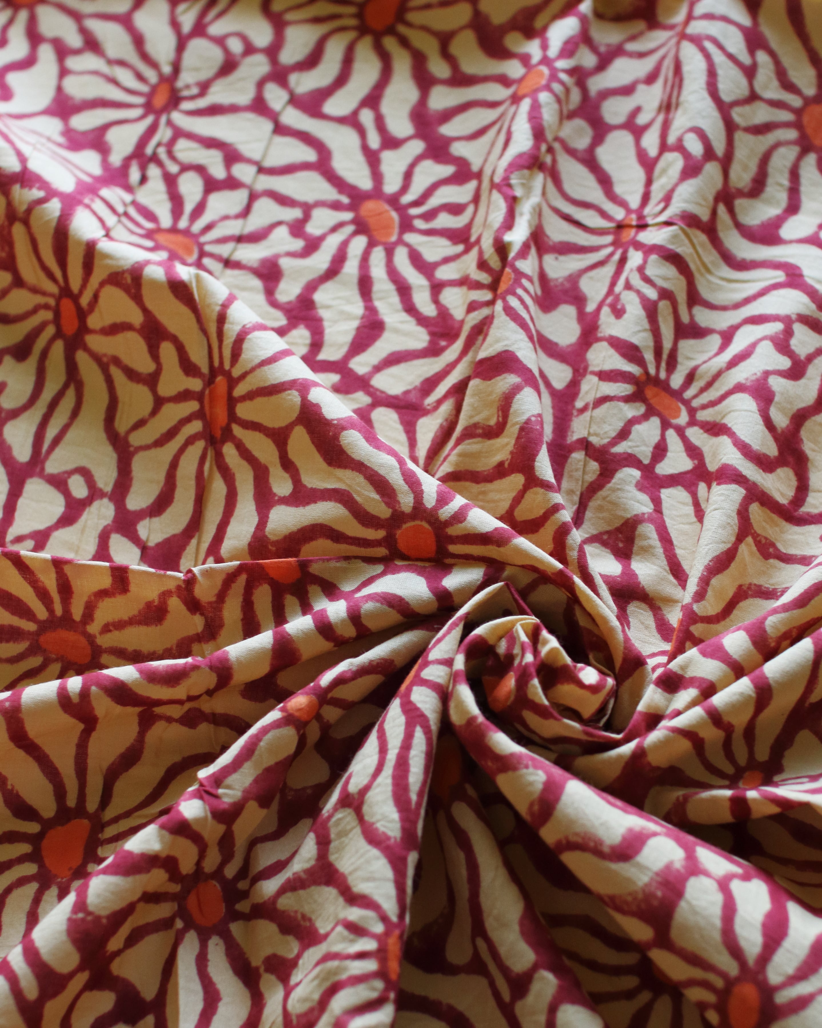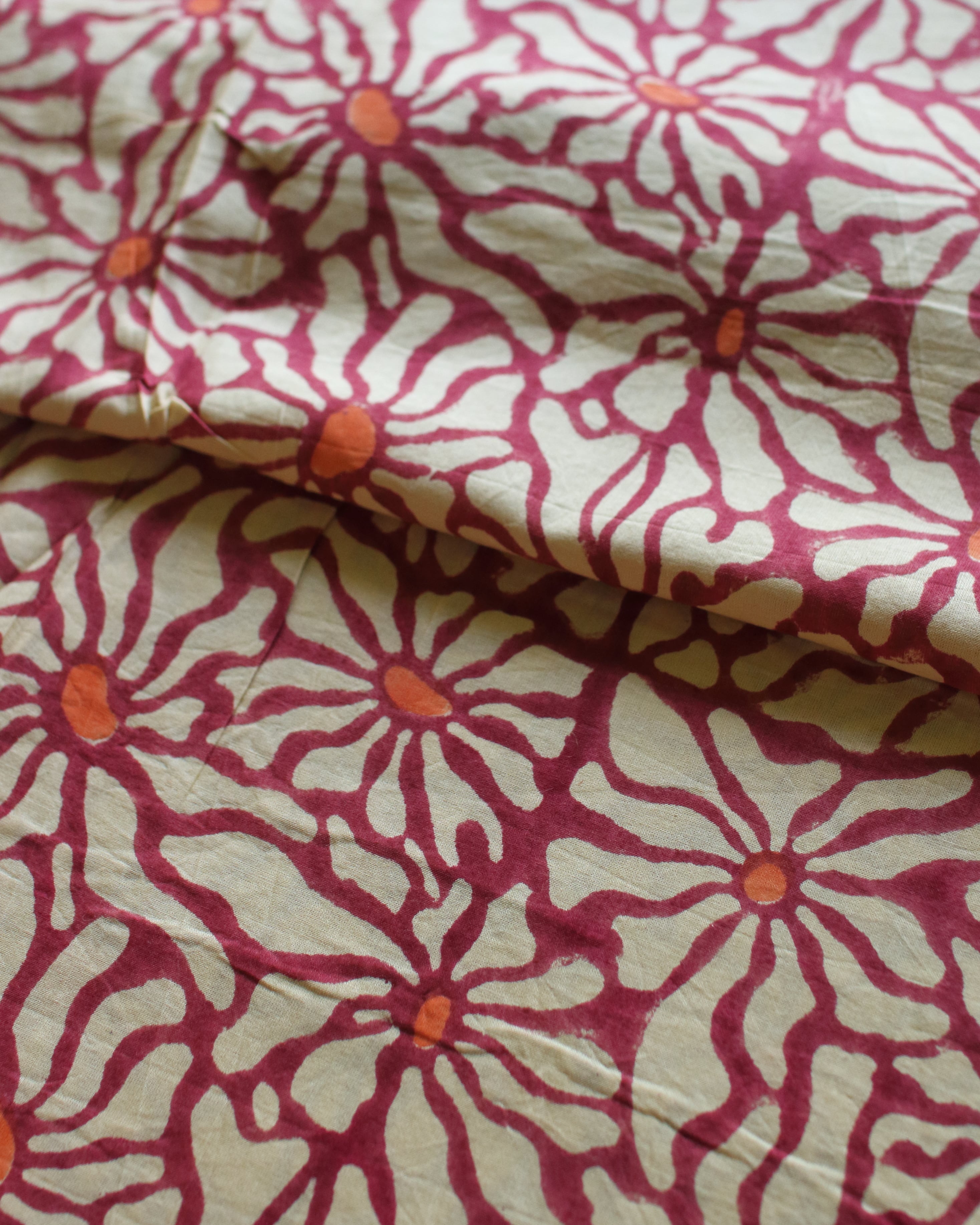 ハンドブロックプリントはインドの伝統的な技法で、手彫りの木版をひとつひとつ布に押しあてて制作していく、あたたかみ溢れるコットンファブリックです。