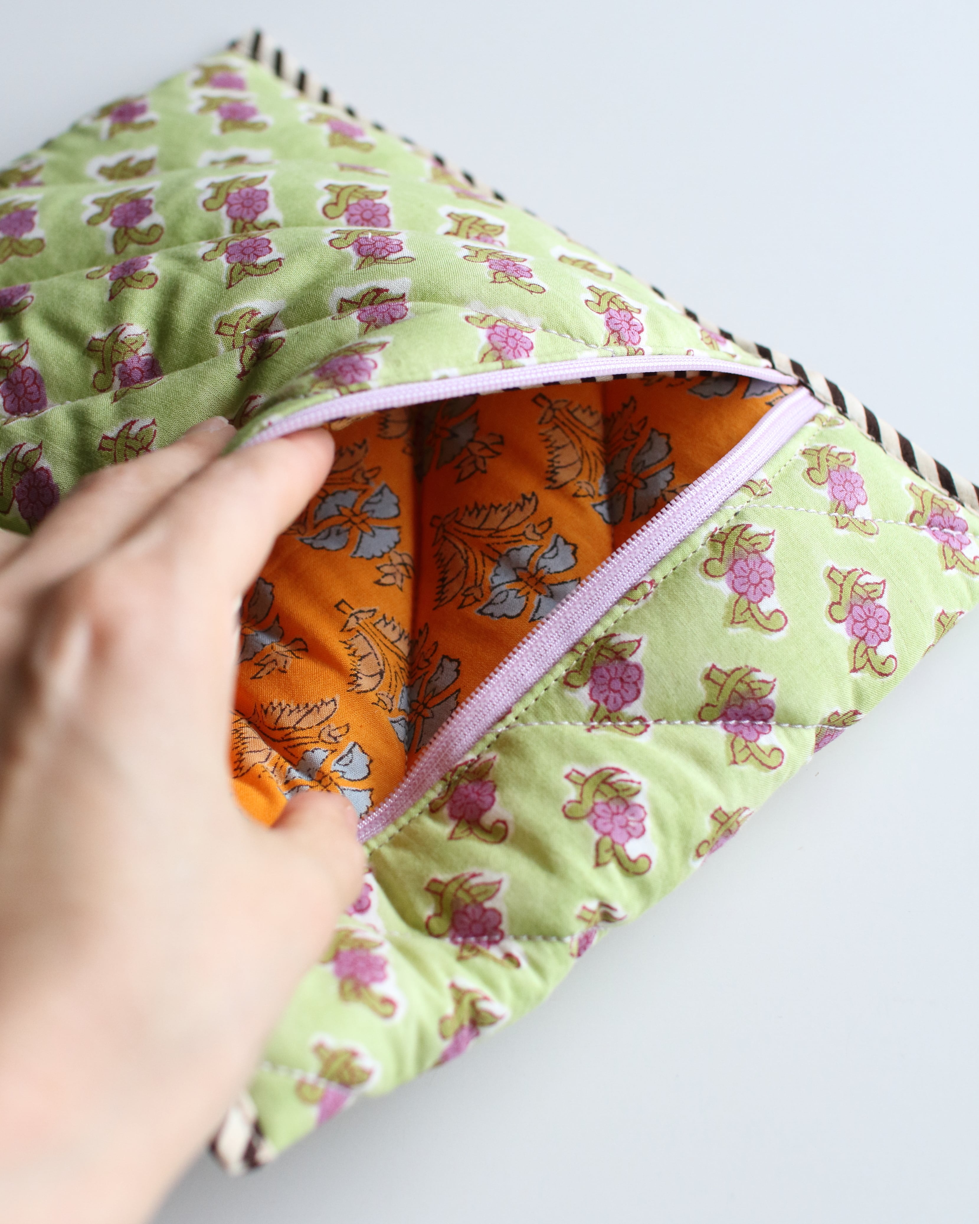 裏地にもブロックプリントの柄を配置していて、縁取りの組み合わせもひとつひとつ違っている、全て1点ずつの制作となります。