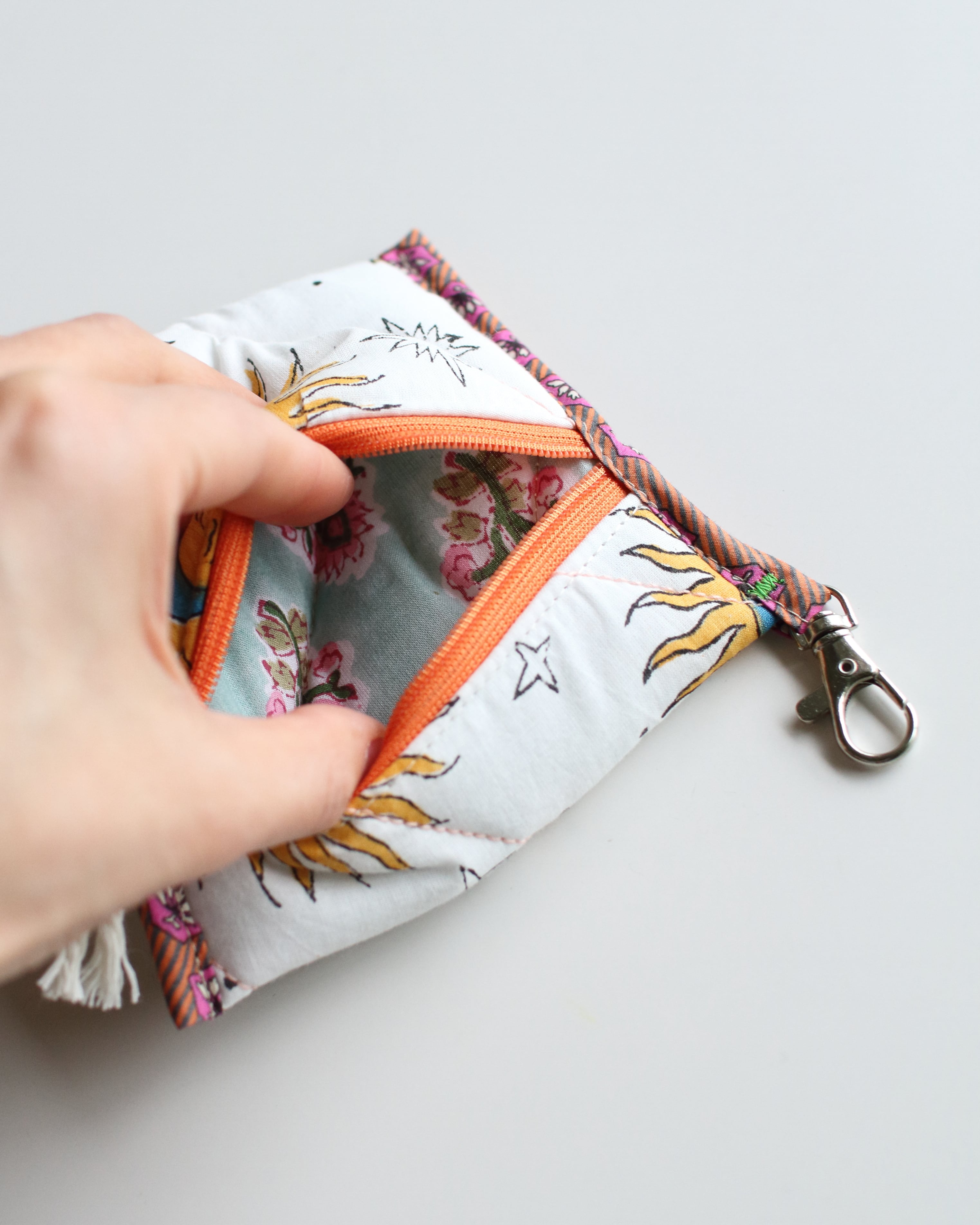 裏地にもブロックプリント柄を配置していて、縁取りの組み合わせもひとつひとつ違っています。
