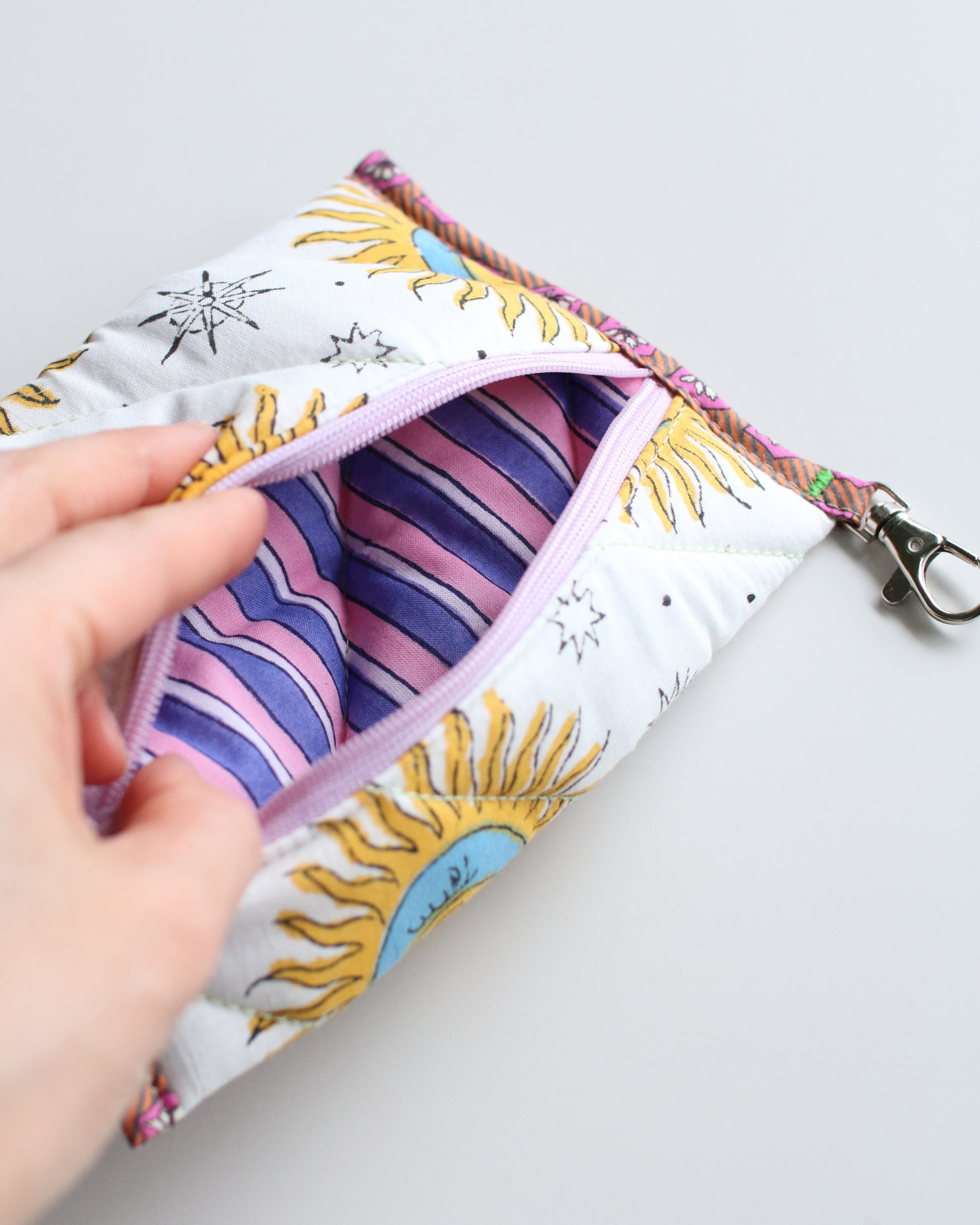 オリジナルで厚みのあるキルティングに仕立てたコンパクトポーチ。