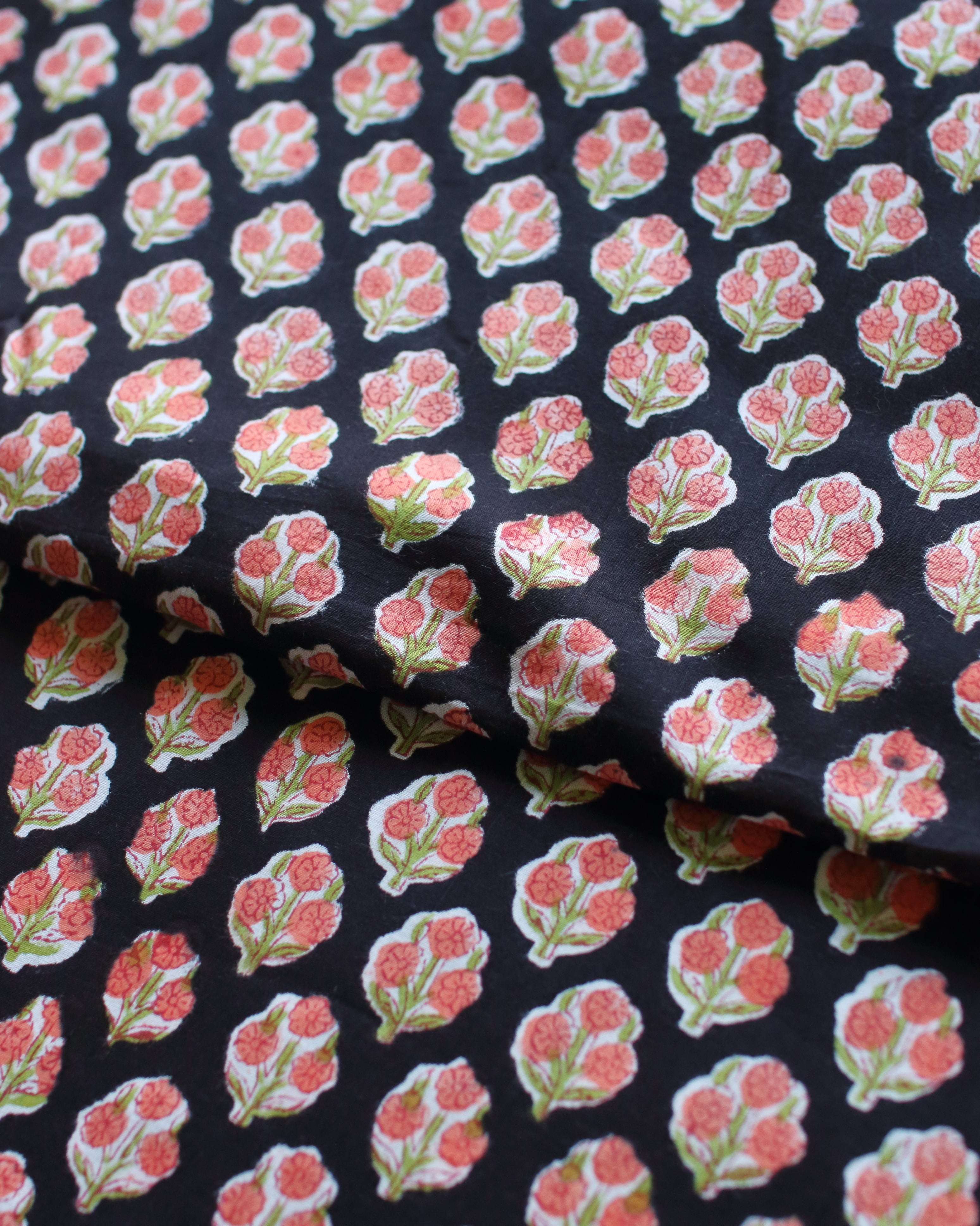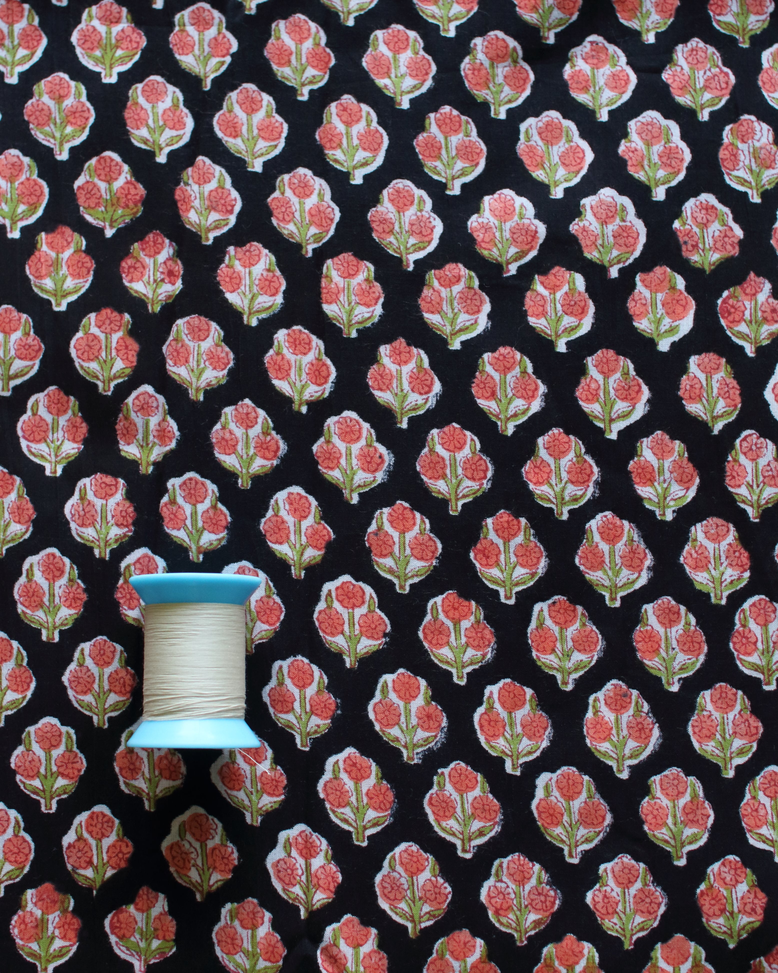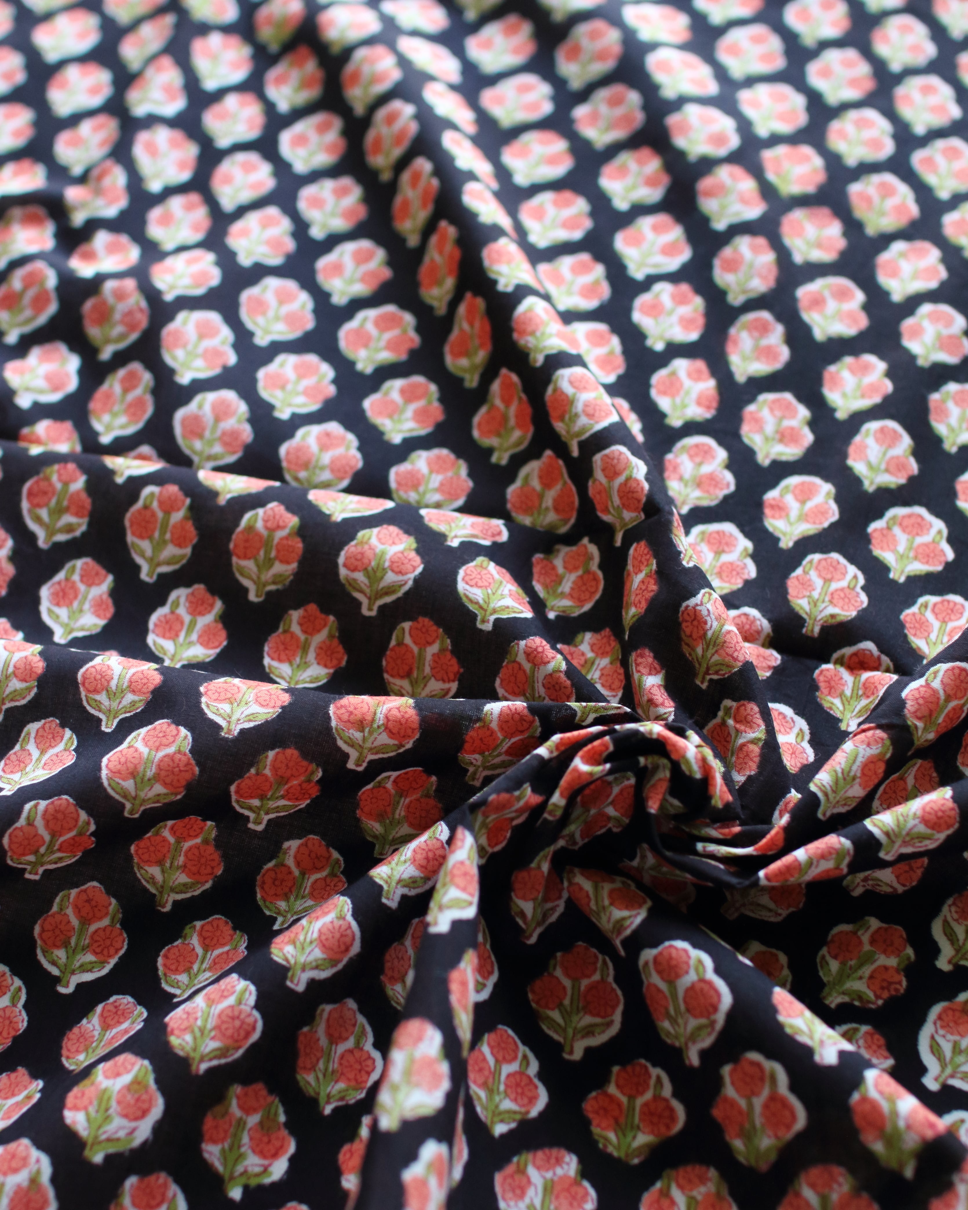 ハンドブロックプリントはインドの伝統的な技法で、手彫りの木版をひとつひとつ布に押しあてて制作していく、あたたかみ溢れるコットンファブリックです。
