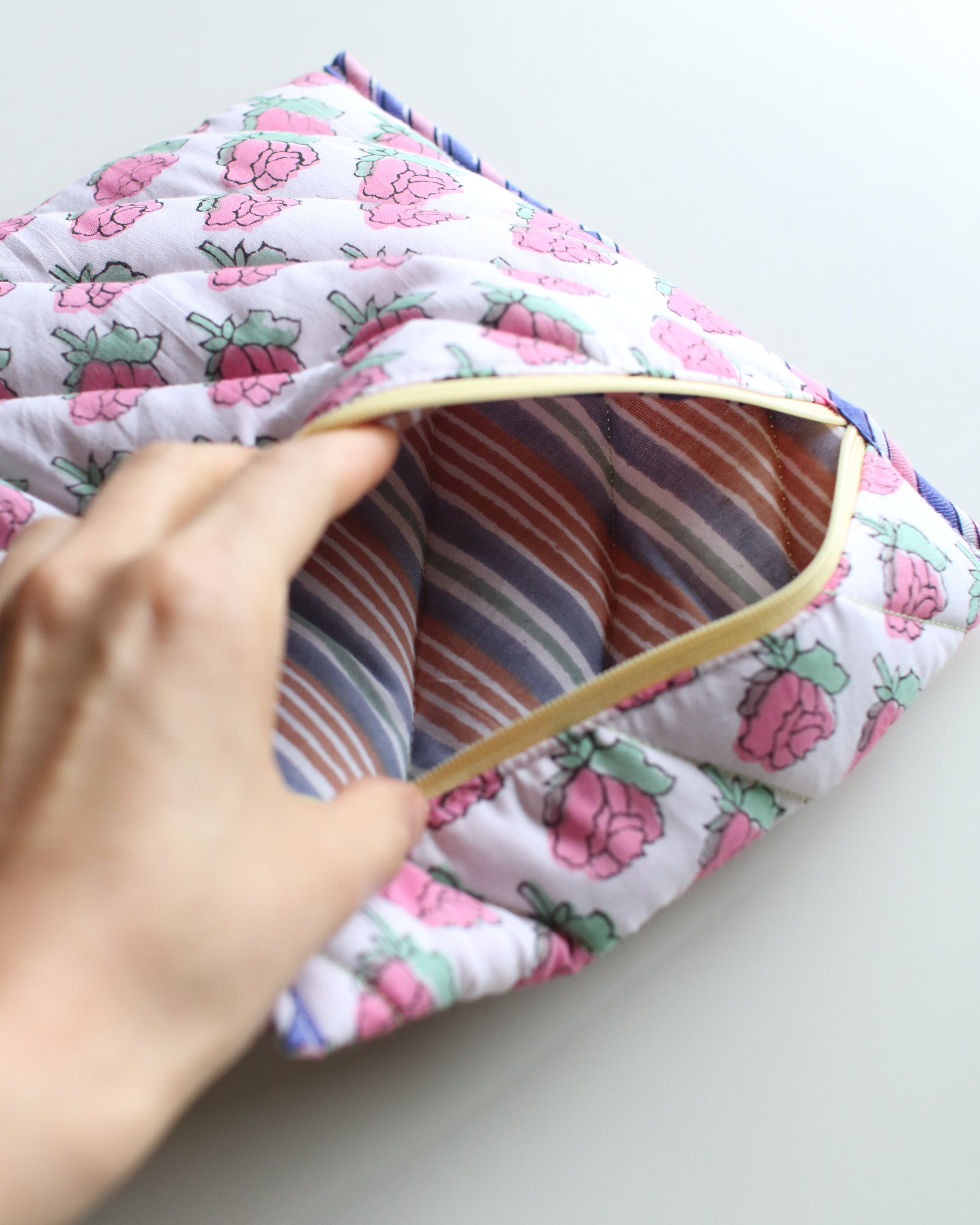 ハンドブロックプリントはインドの伝統的な技法で、手彫りの木版をひとつひとつ布に押しあてて制作していく、あたたかみ溢れるコットンファブリックです。