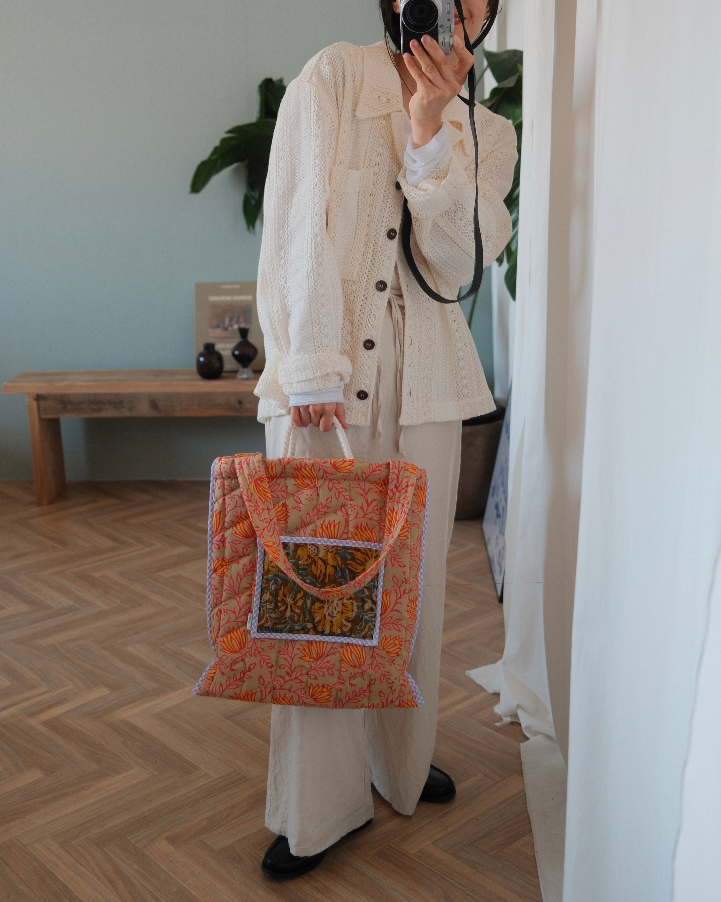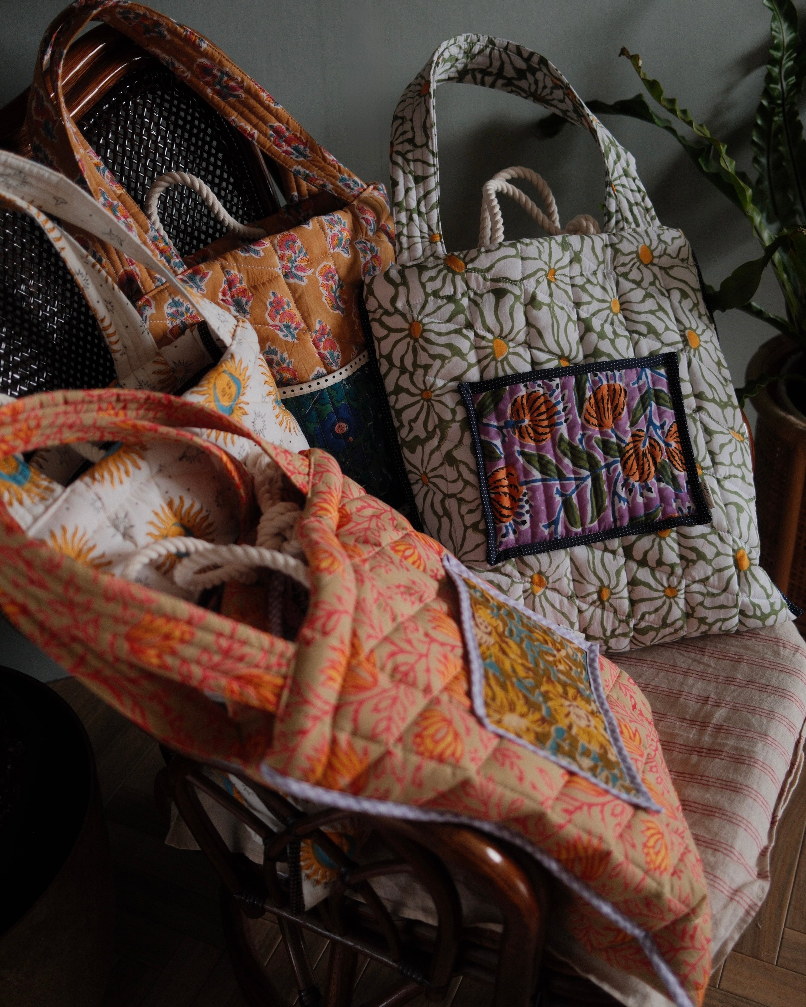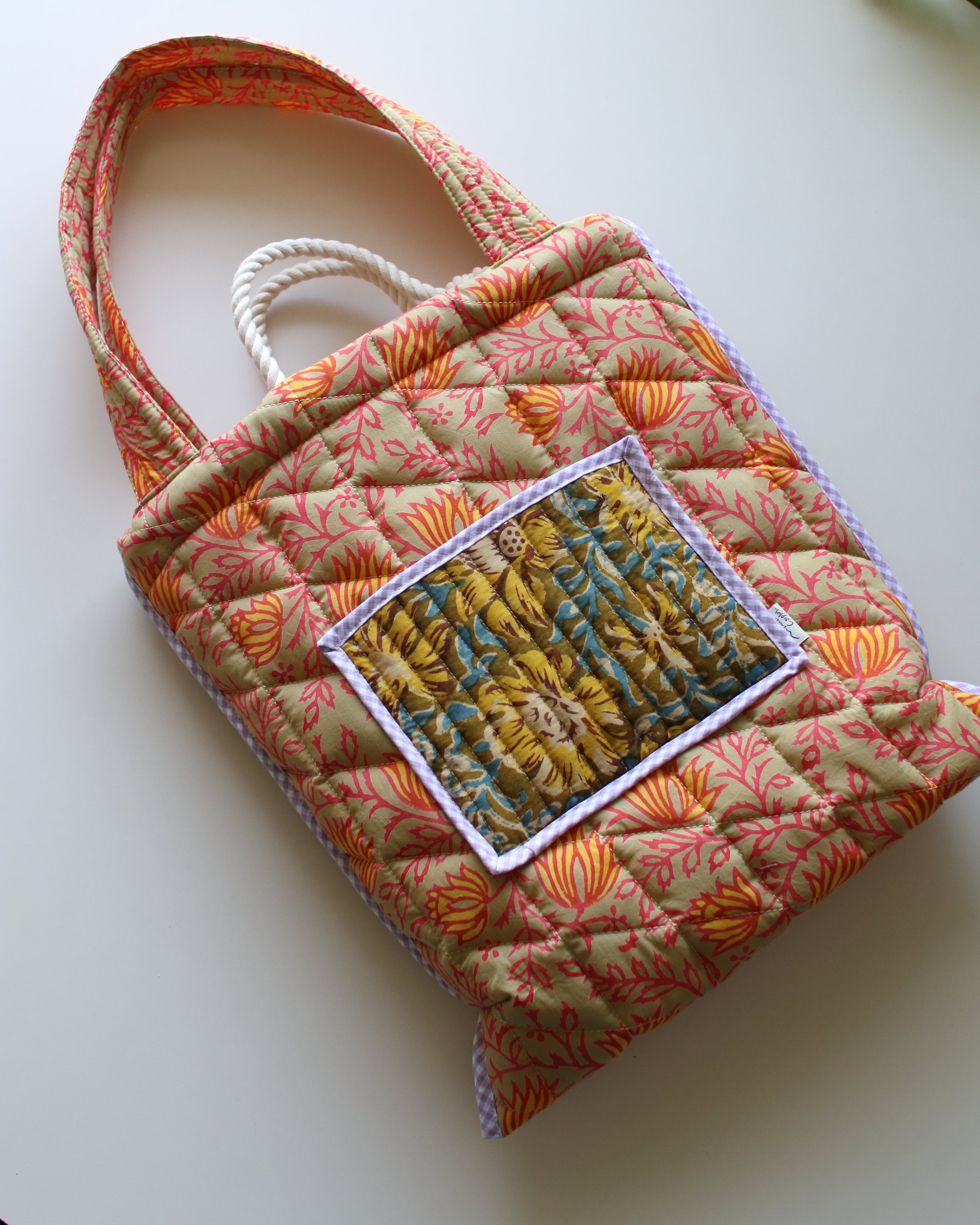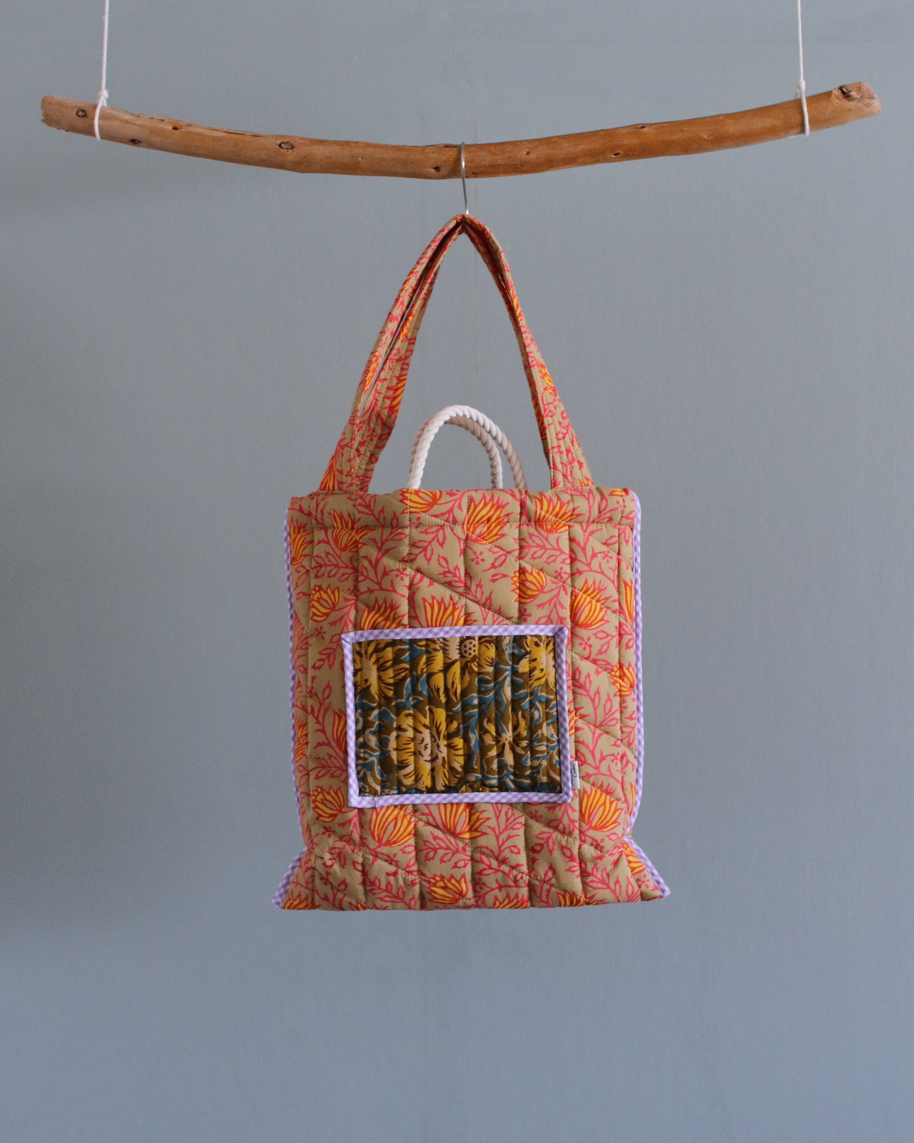 インドで作られたハンドブロックプリント生地(木製のスタンプで色を重ねていく伝統的な手法)をオリジナルで厚みのあるキルティングに仕立てた、軽くてたくさん入るトートバッグ。
