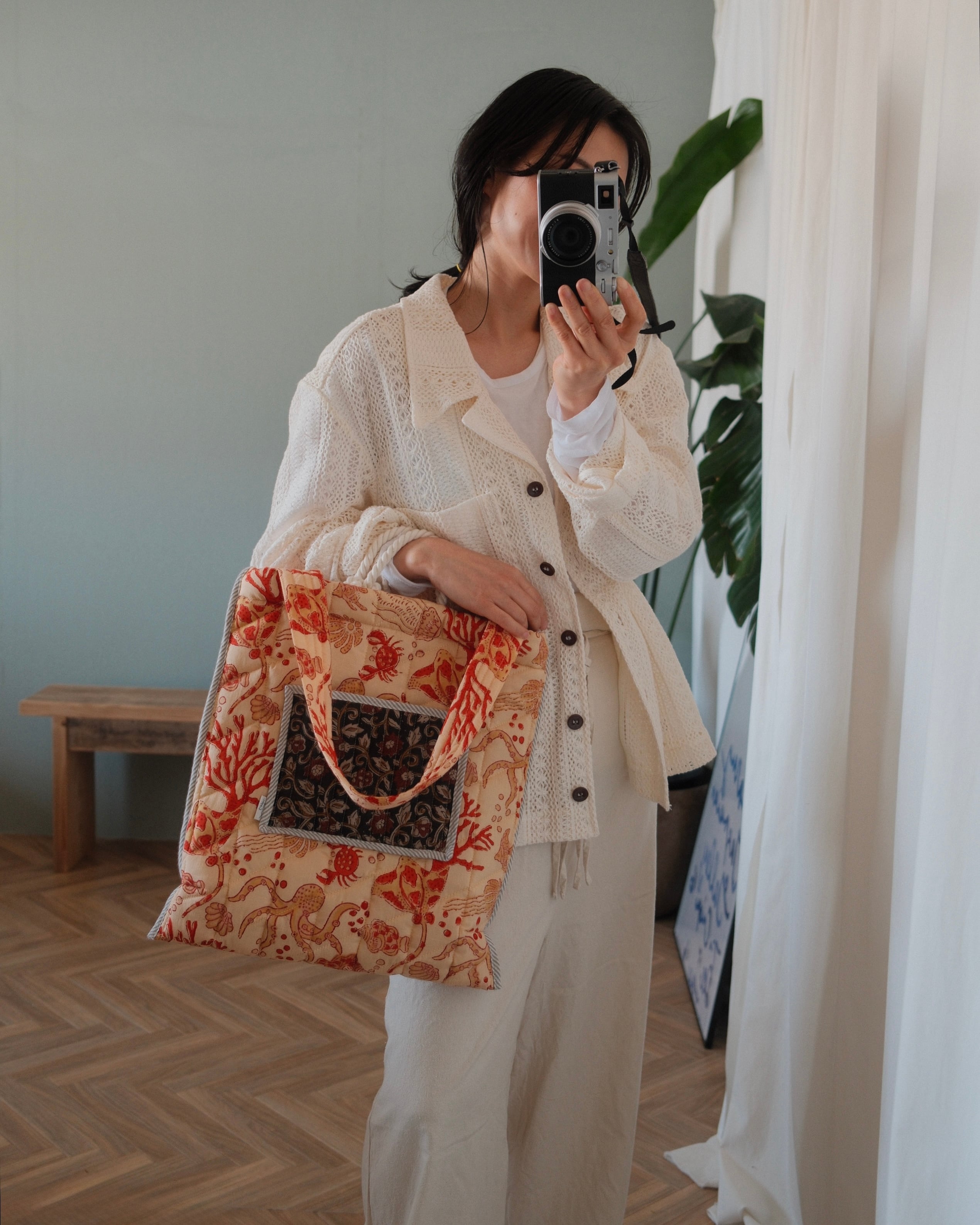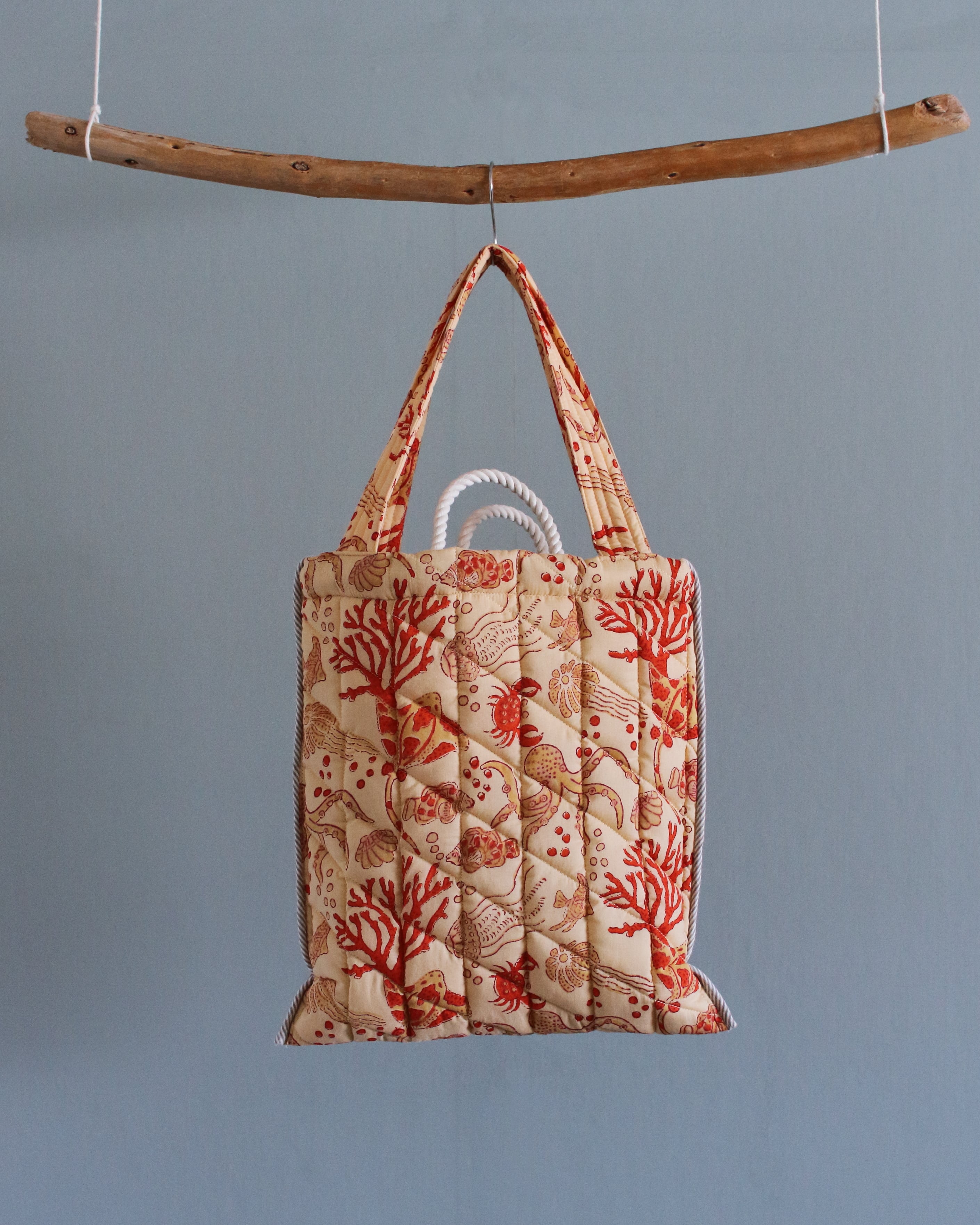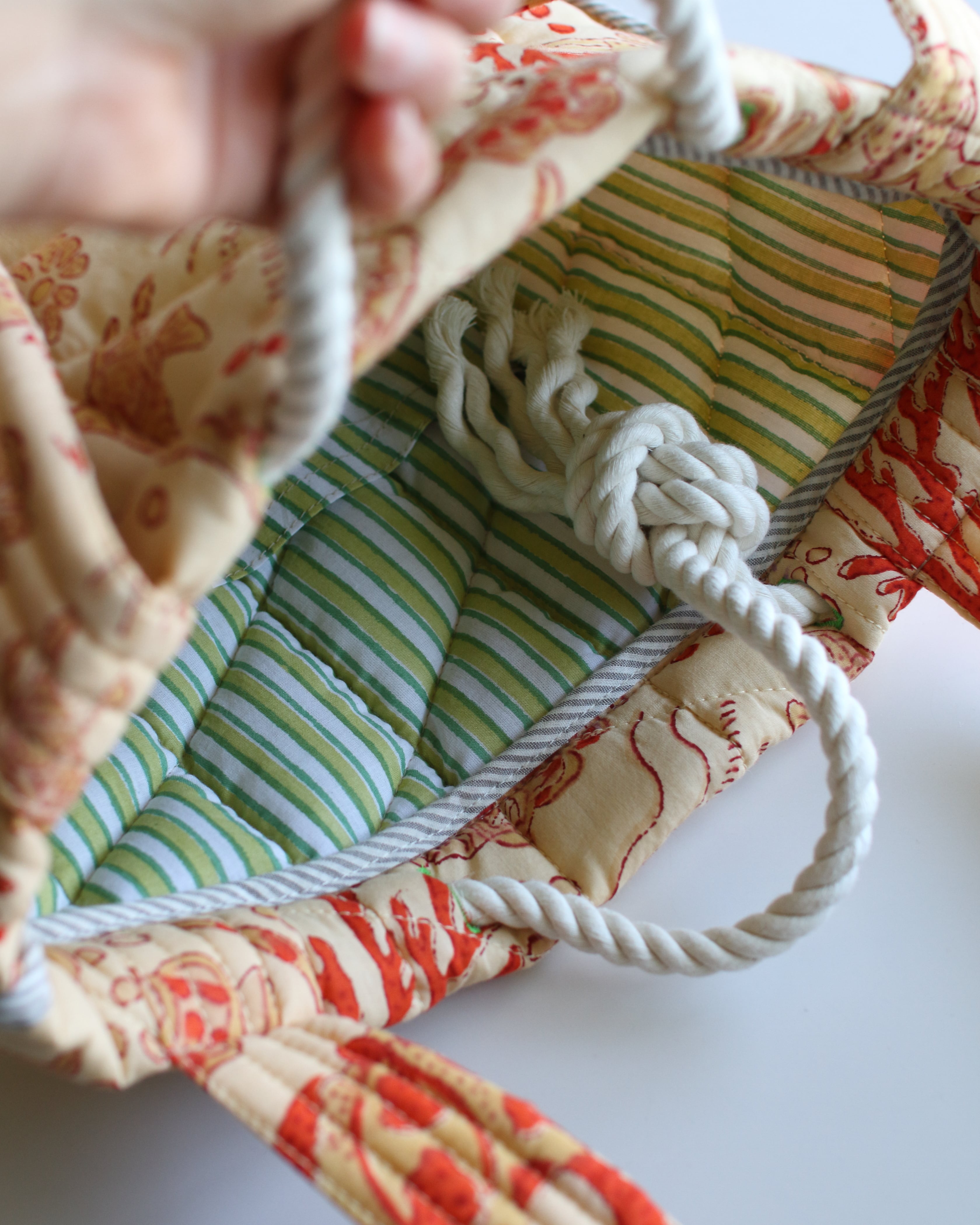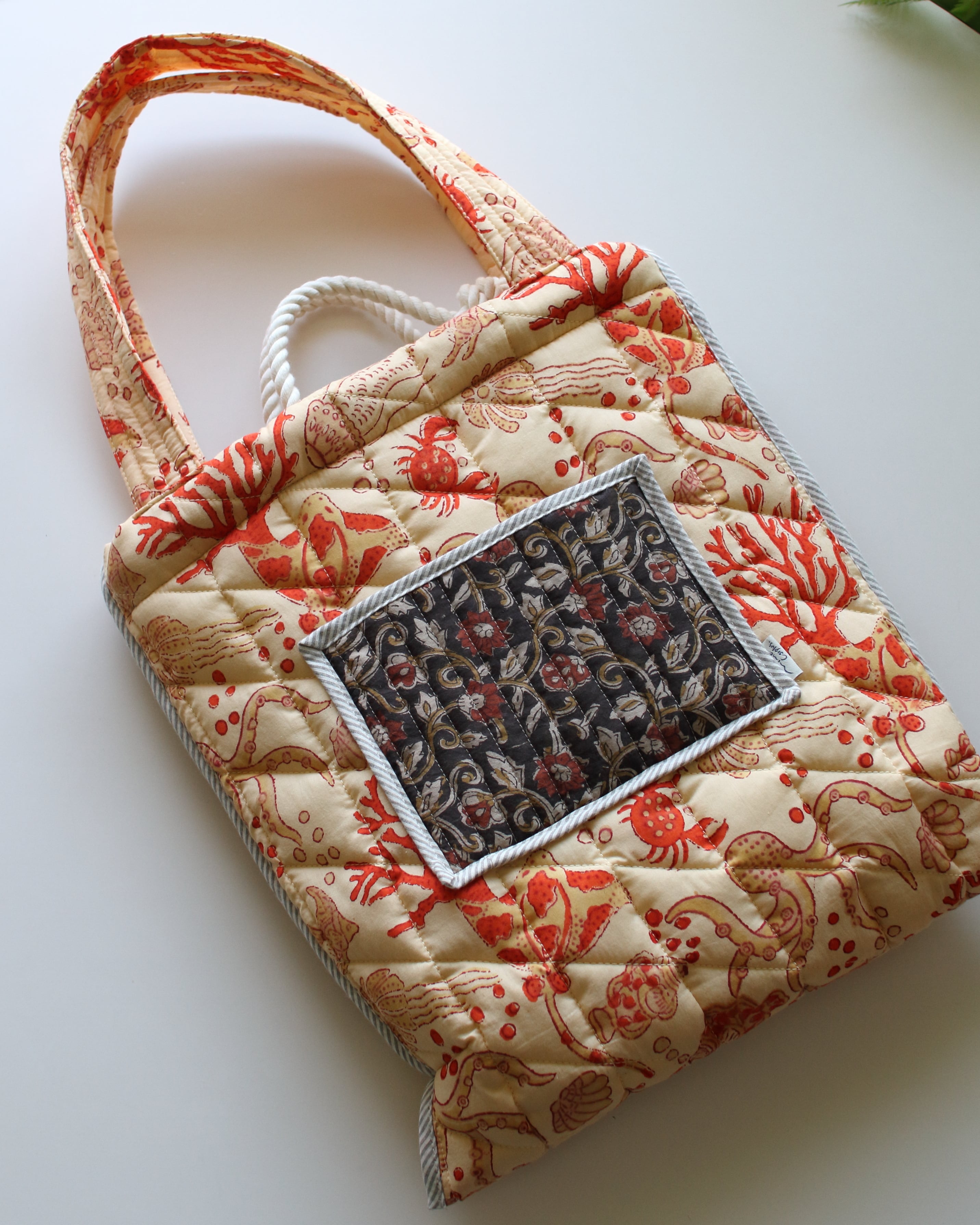 インドで作られたハンドブロックプリント生地(木製のスタンプで色を重ねていく伝統的な手法)をオリジナルで厚みのあるキルティングに仕立てた、軽くてたくさん入るトートバッグ。