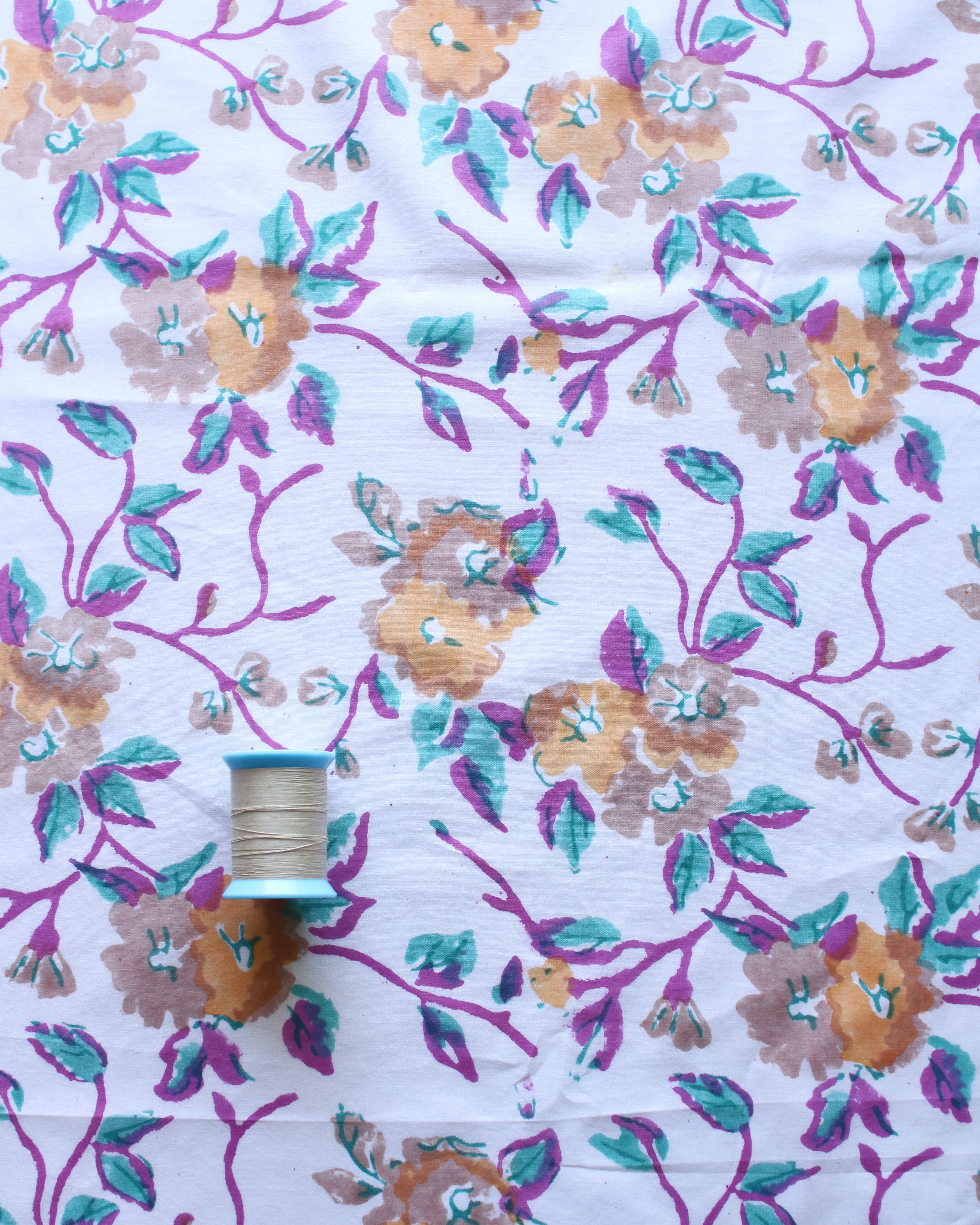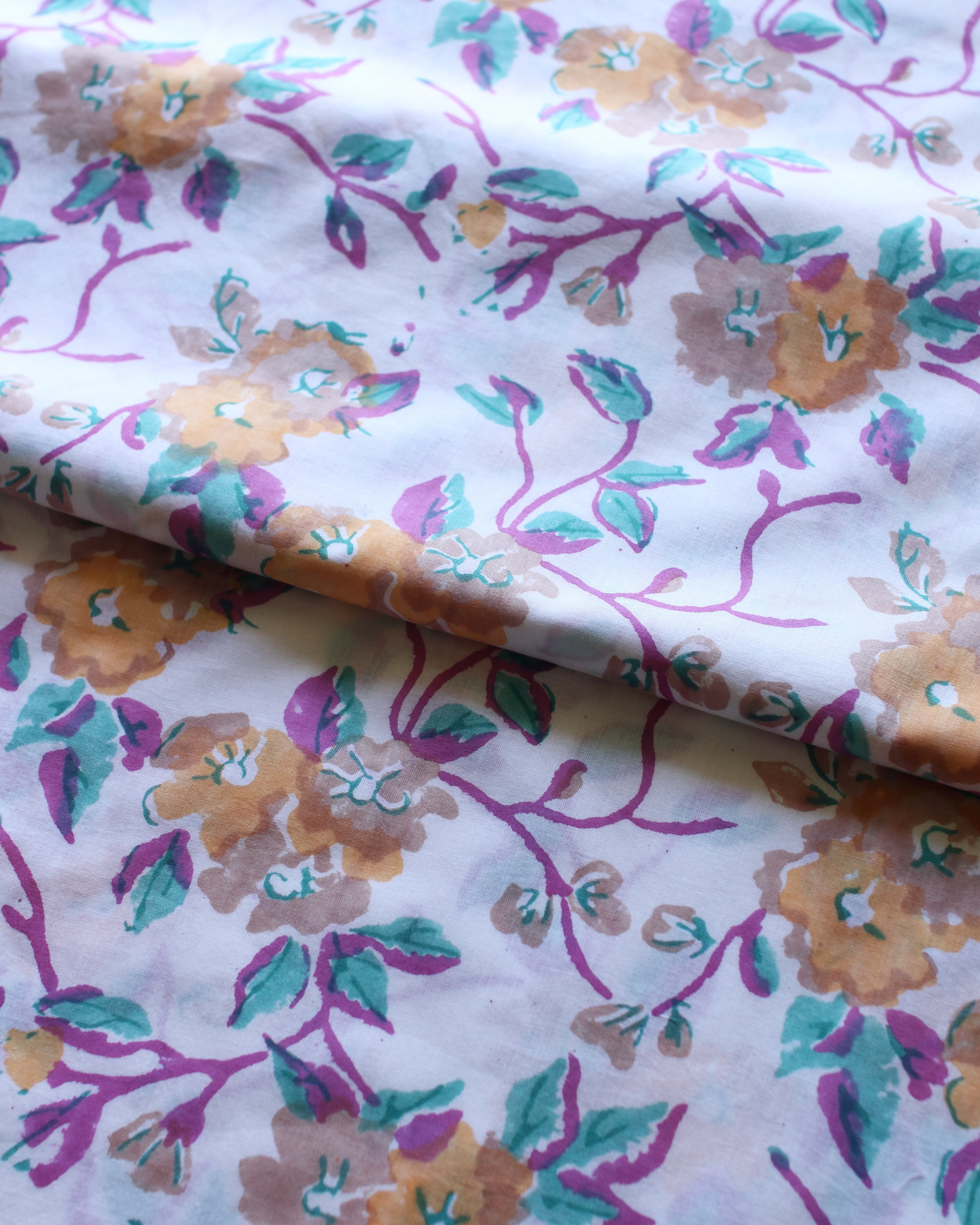 ハンドブロックプリントはインドの伝統的な技法で、手彫りの木版をひとつひとつ布に押しあてて制作していく、あたたかみ溢れるコットンファブリックです。