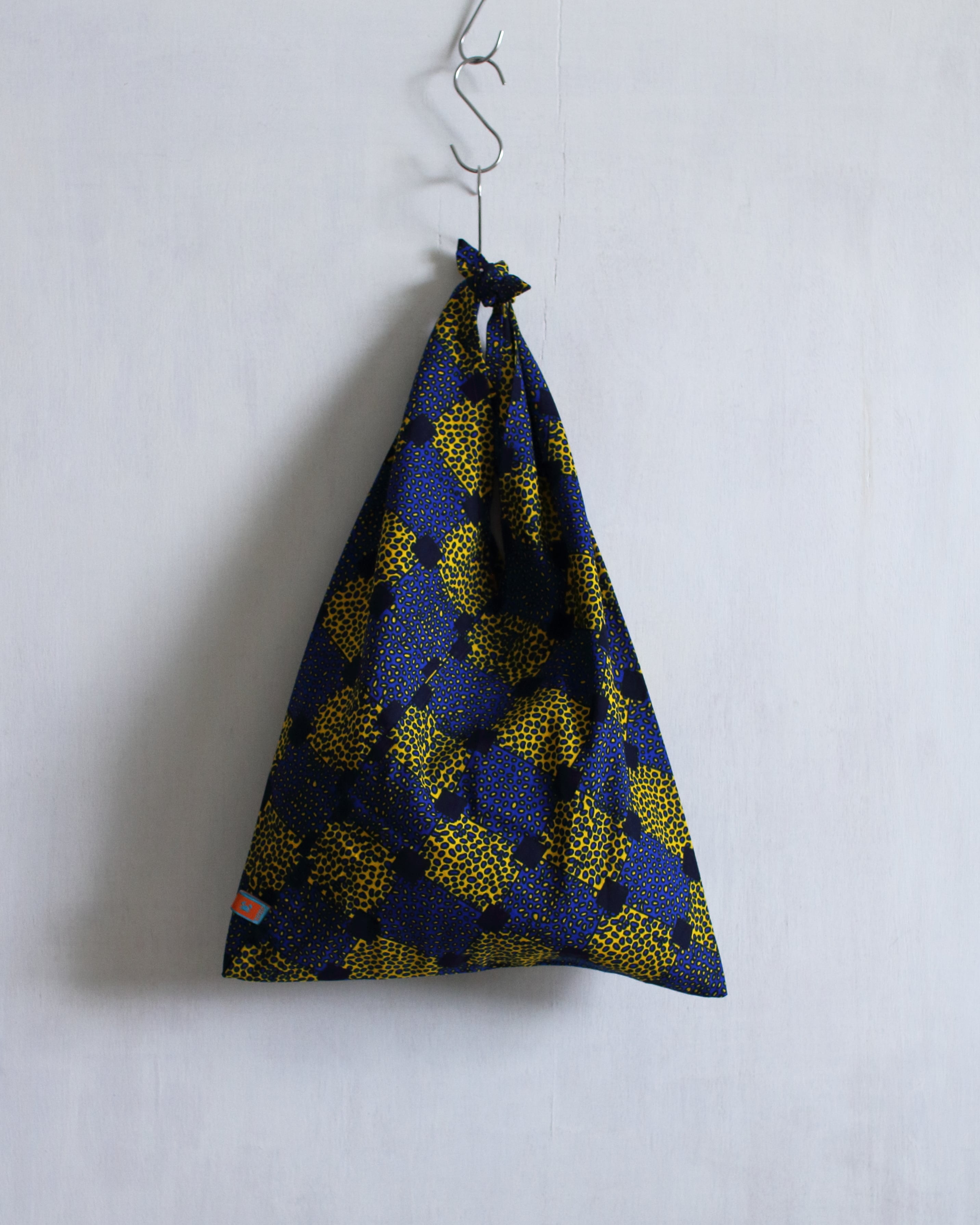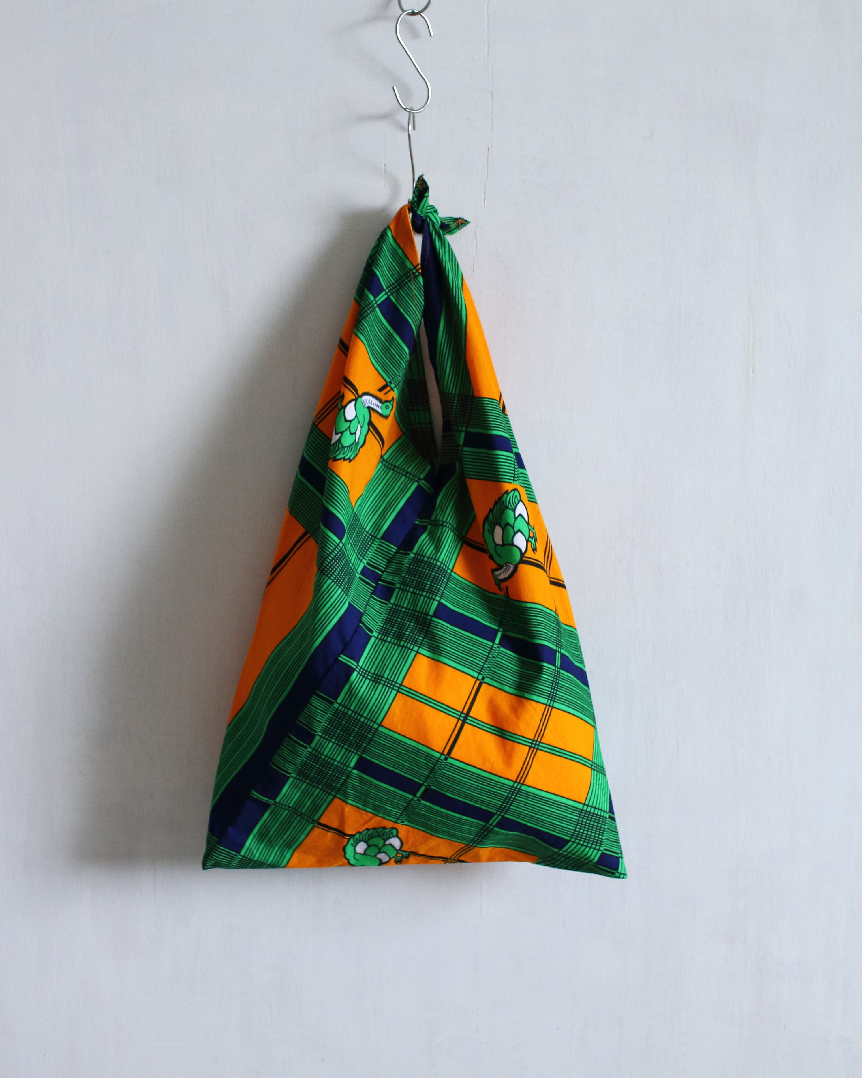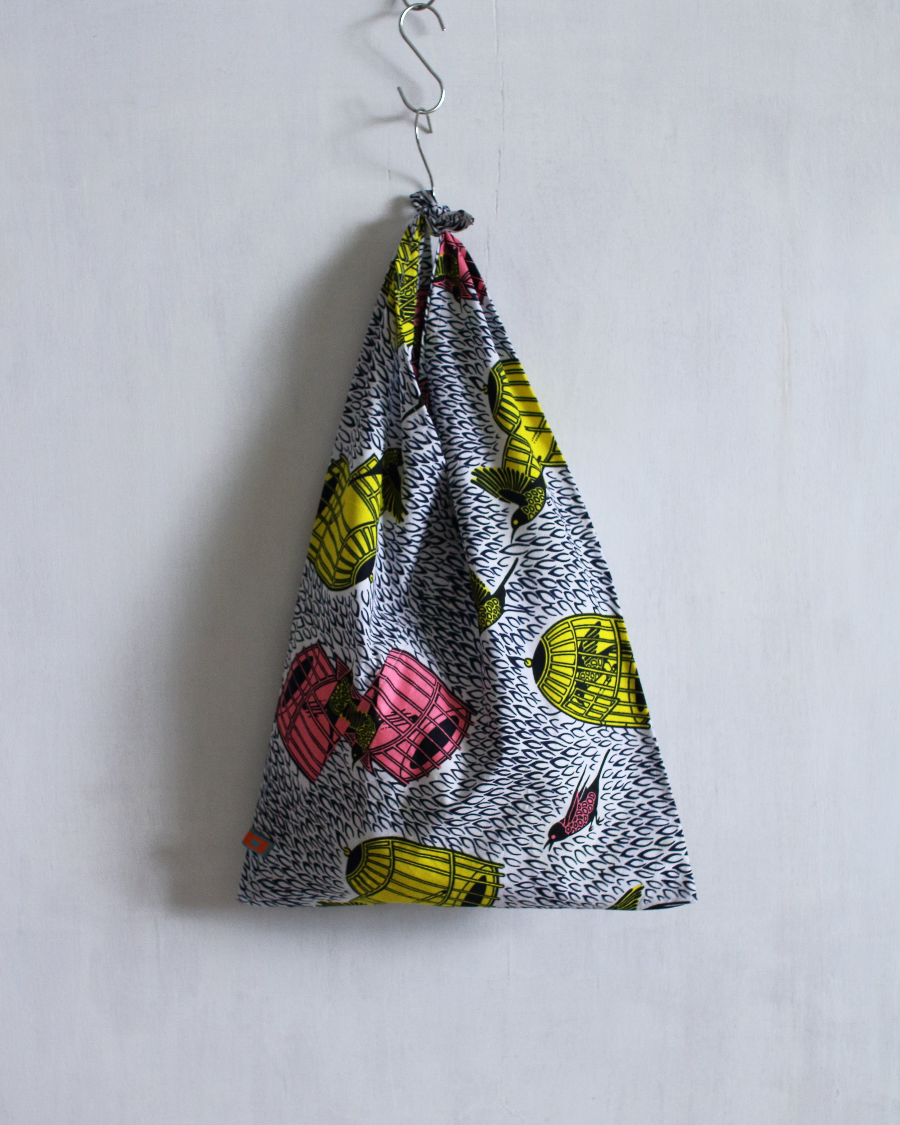 力強いアフリカンプリントを縦長のあずま袋に仕立てました。