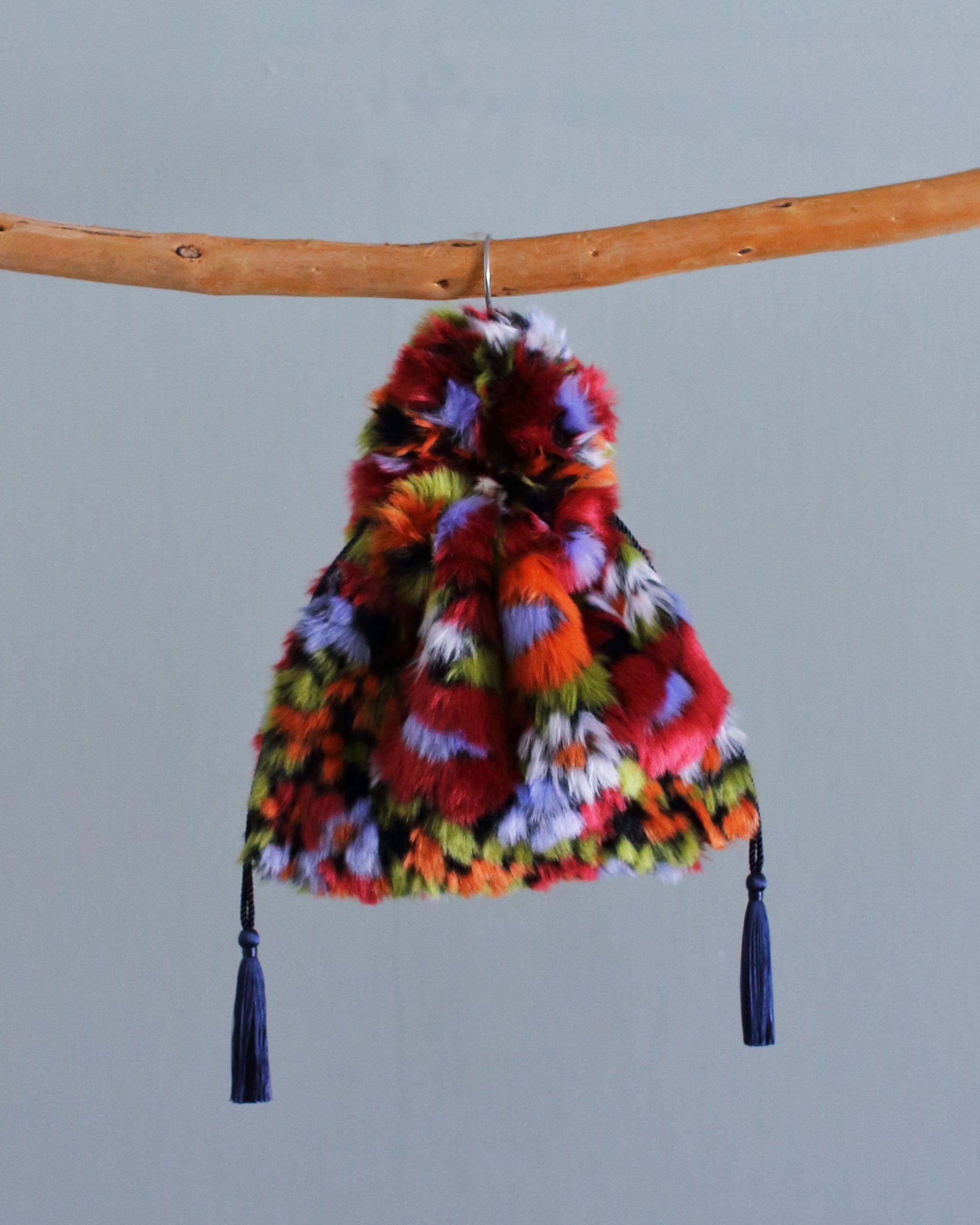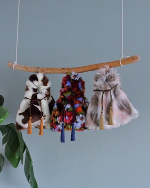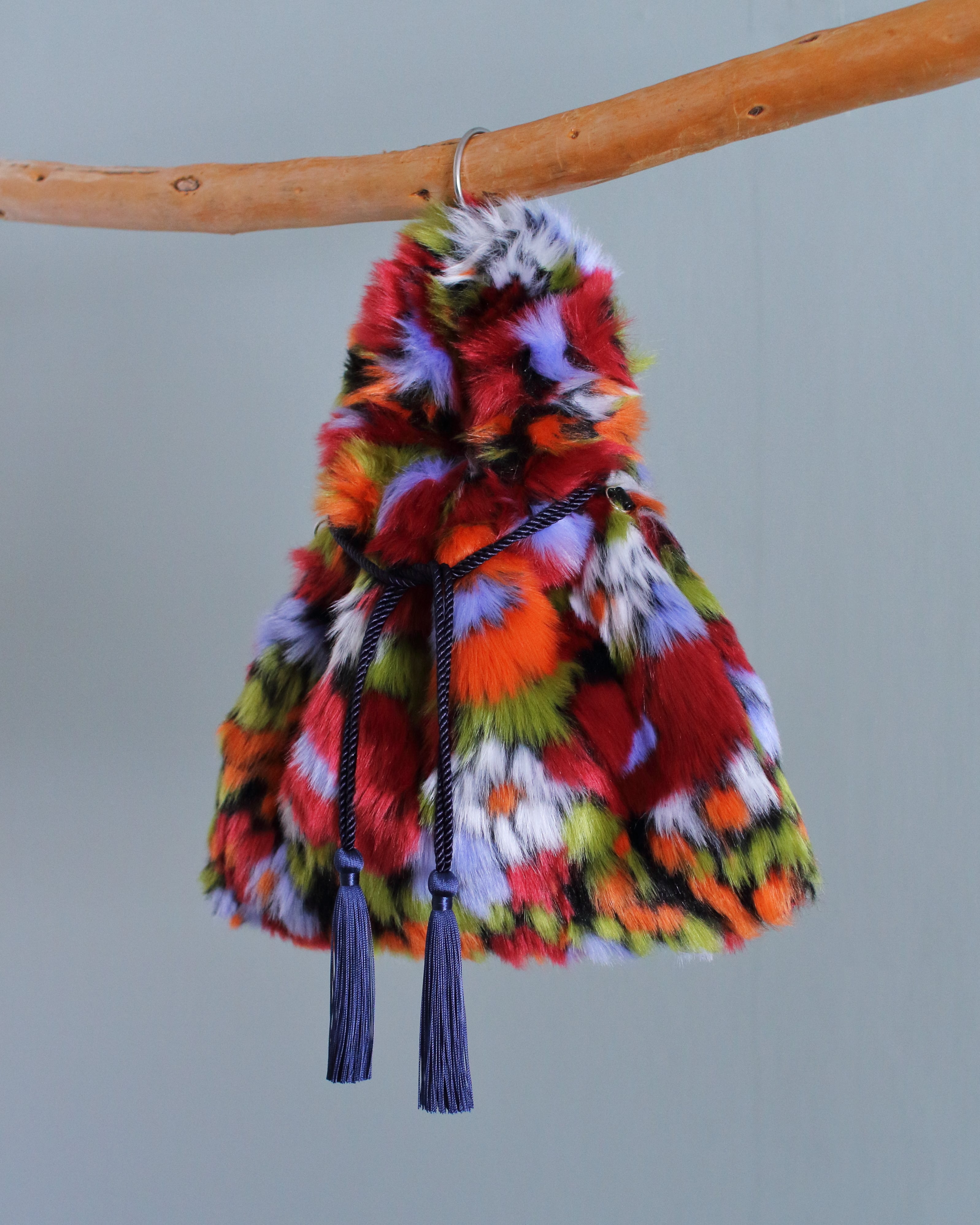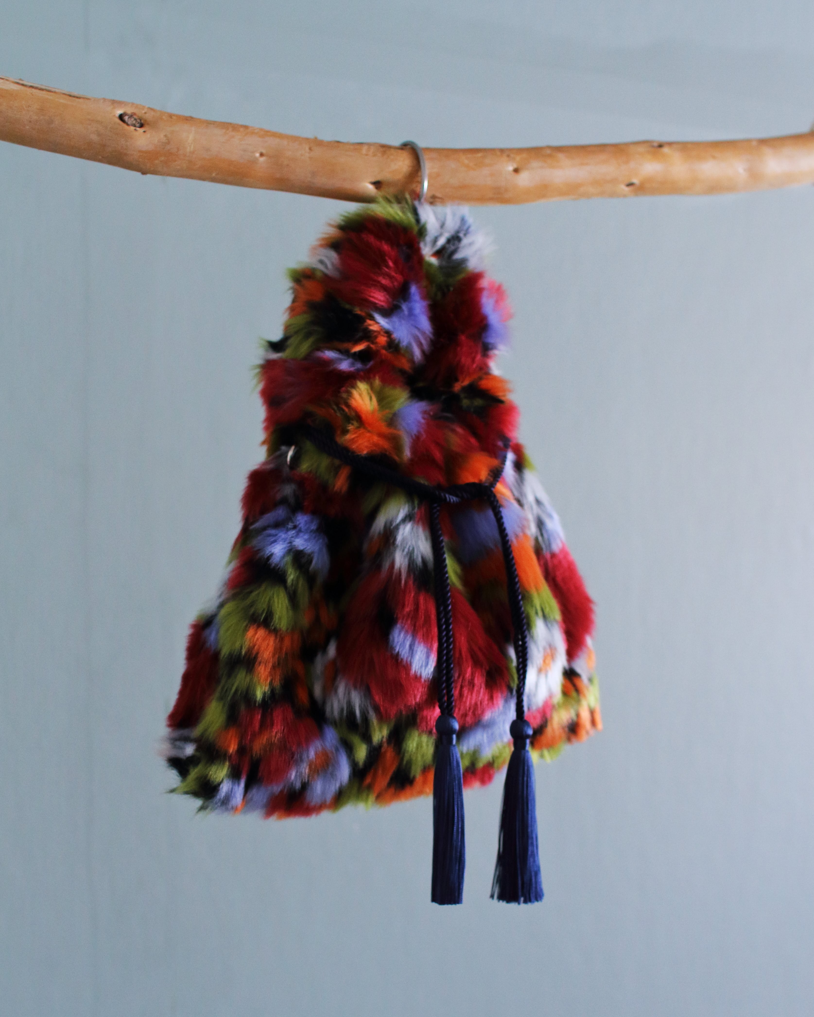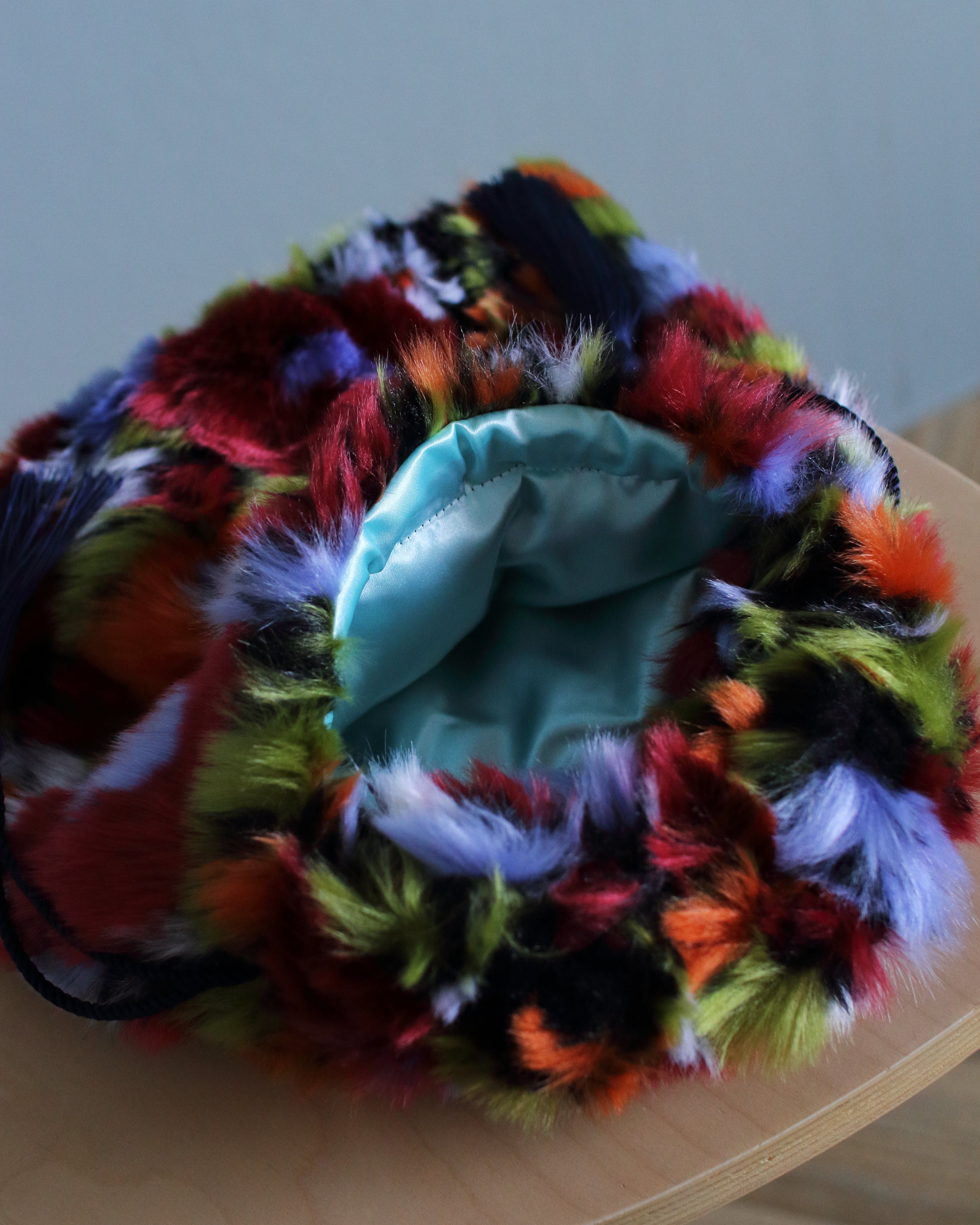 定番のシュリンク巾着を手触りふわふわのフェイクファーで仕立てました。