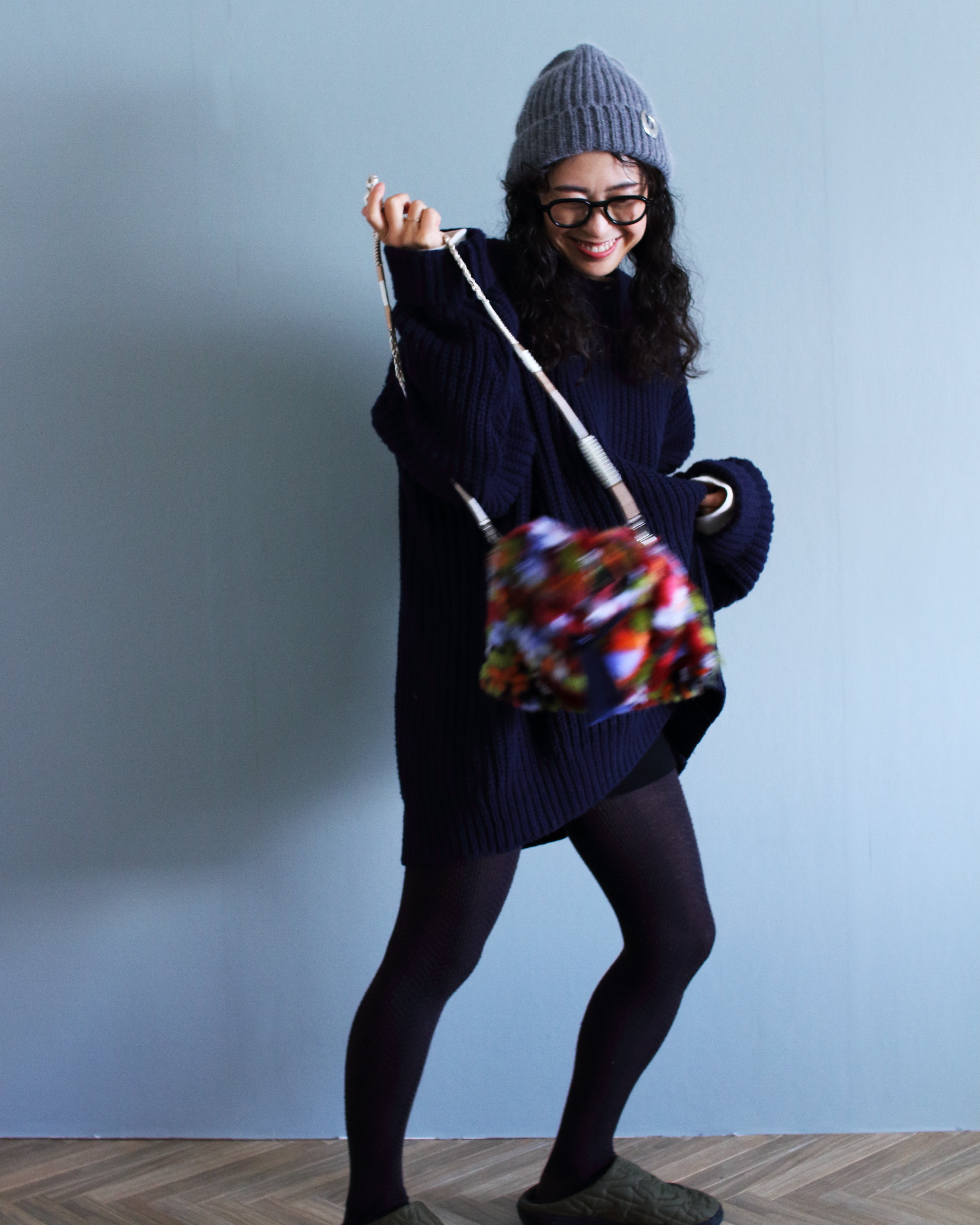 ユニークなお花畑の柄が広がって、冬の装いに華を添える。