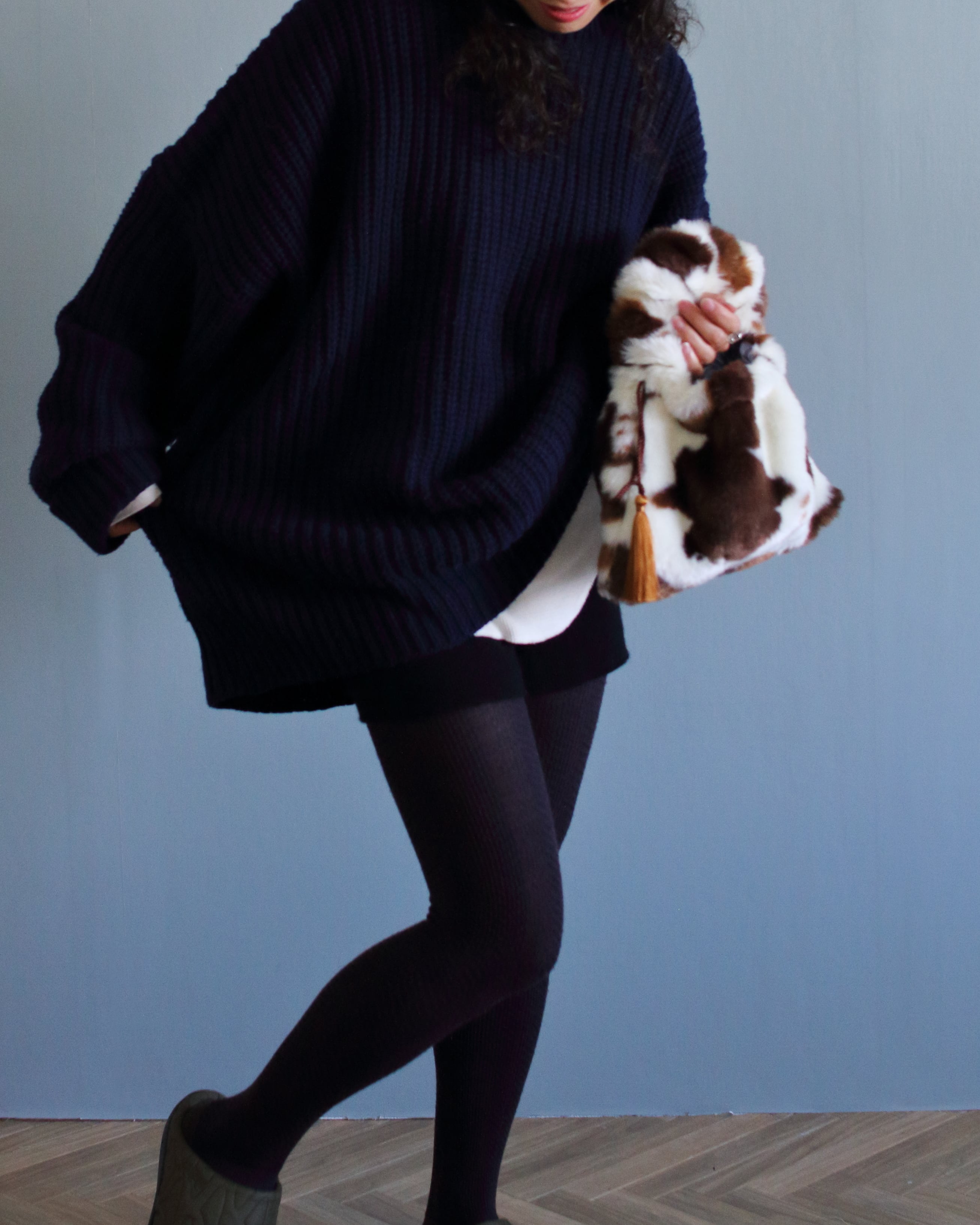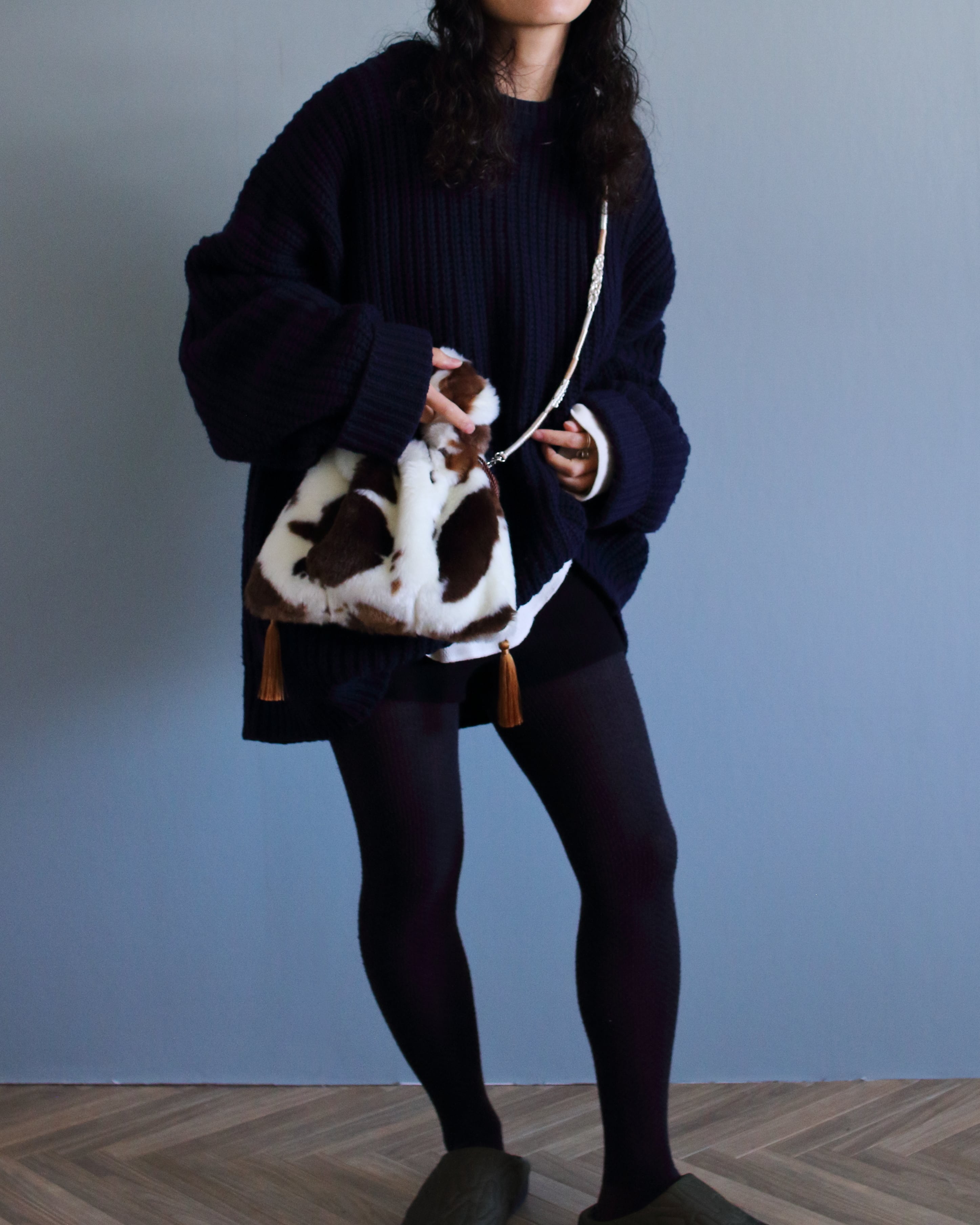 ユニークな子牛柄が広がって、冬の装いに華を添える。