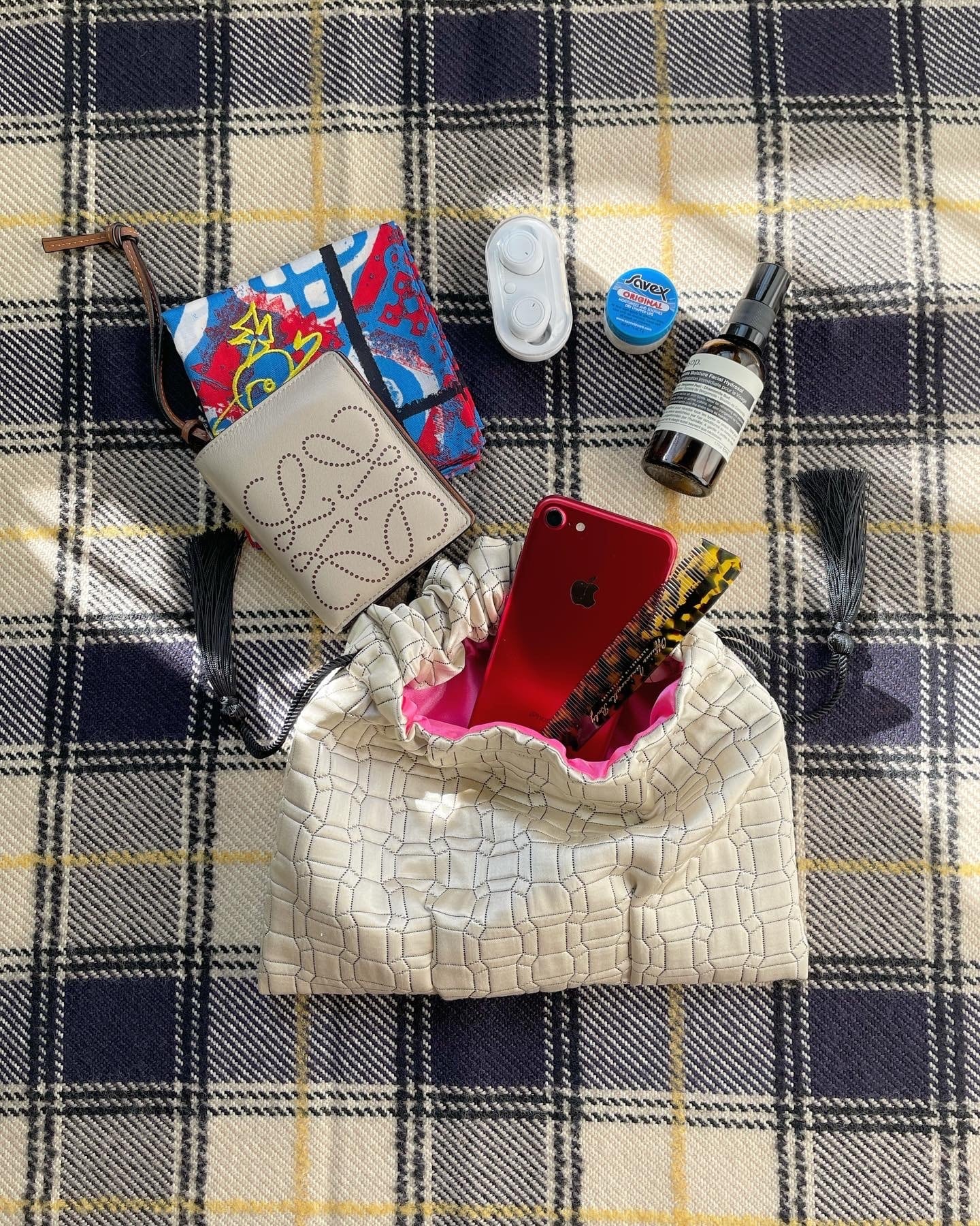 荷物を入れると重みで取手が伸びるので、色々な持ち方を楽しんで頂ければと思います。