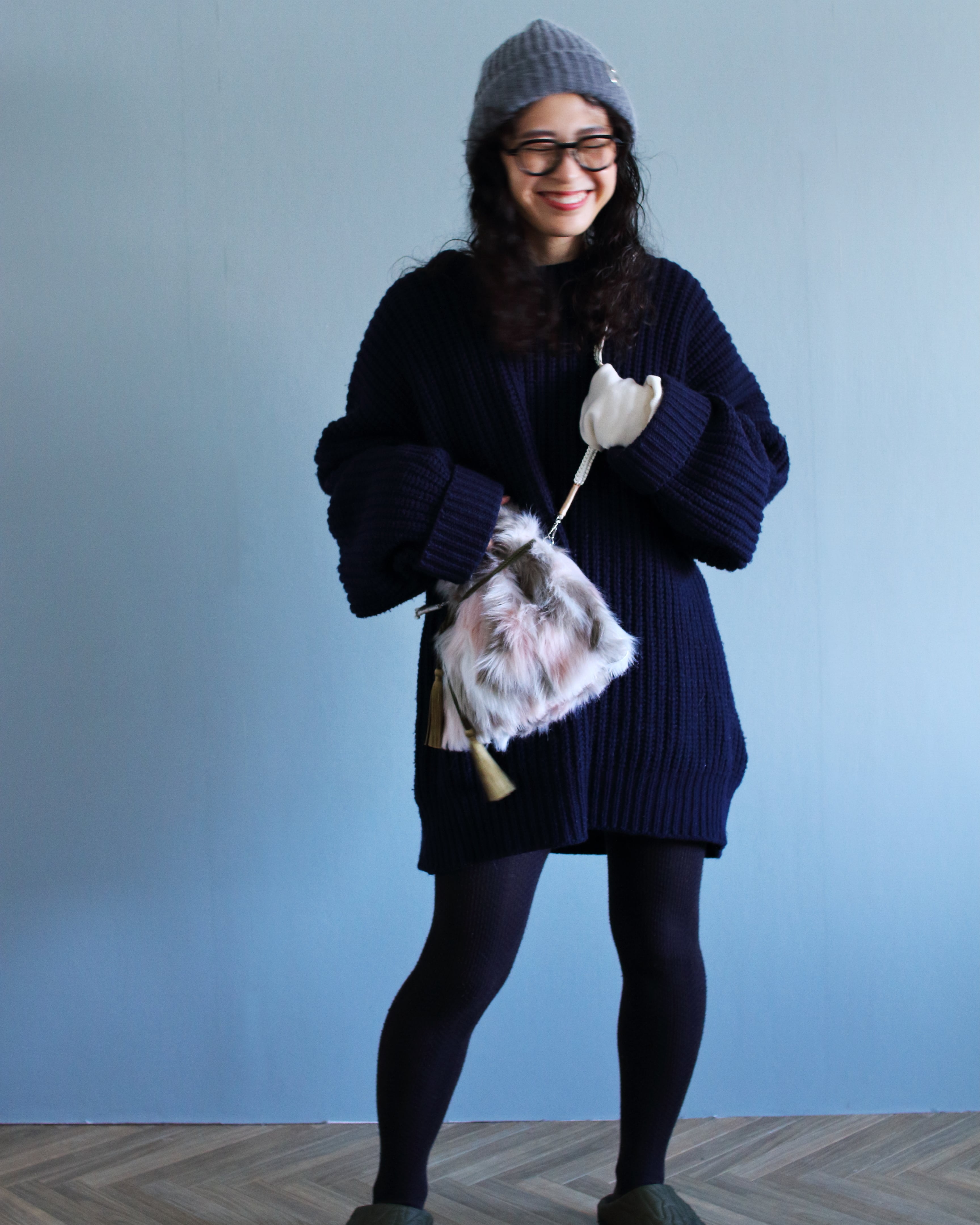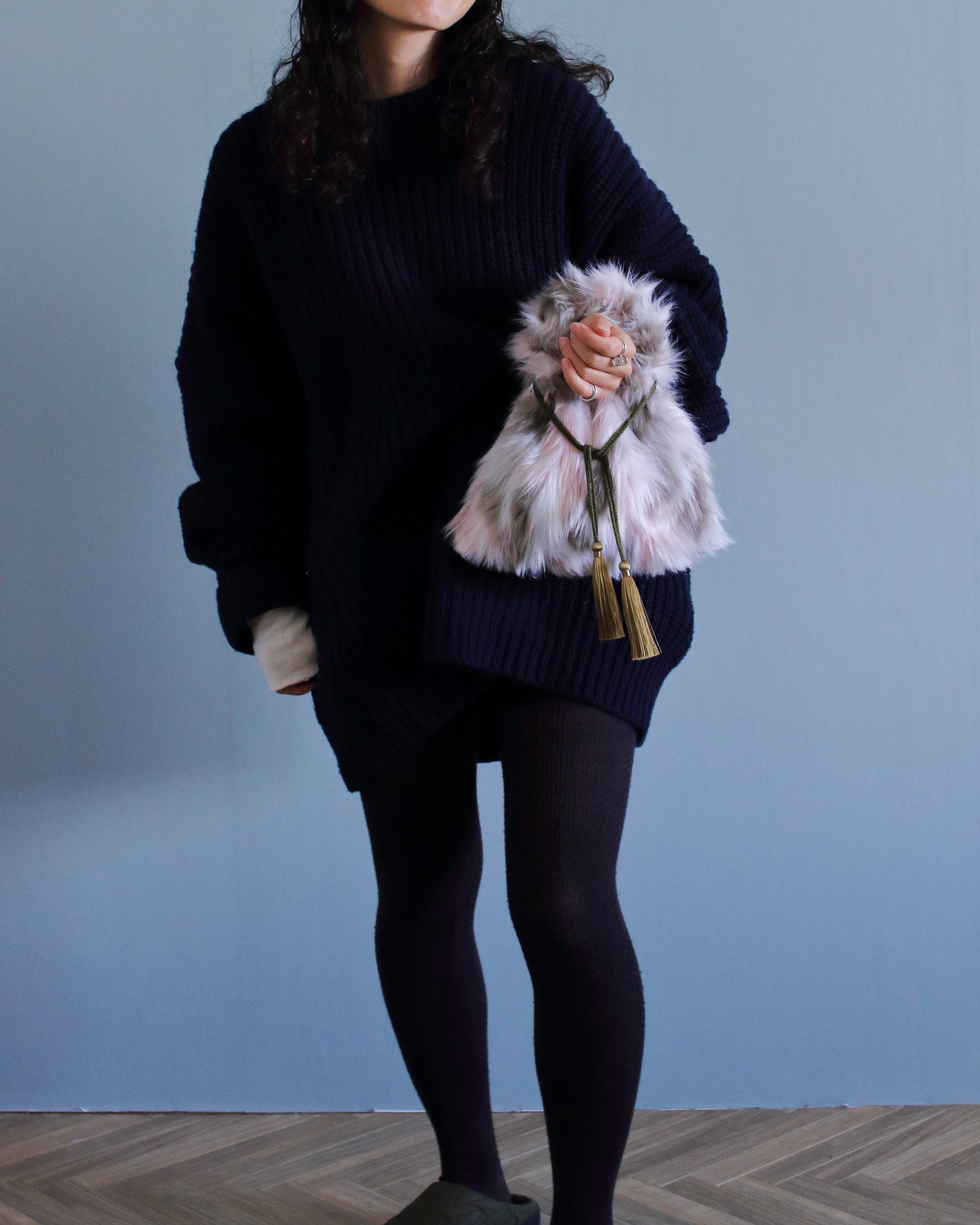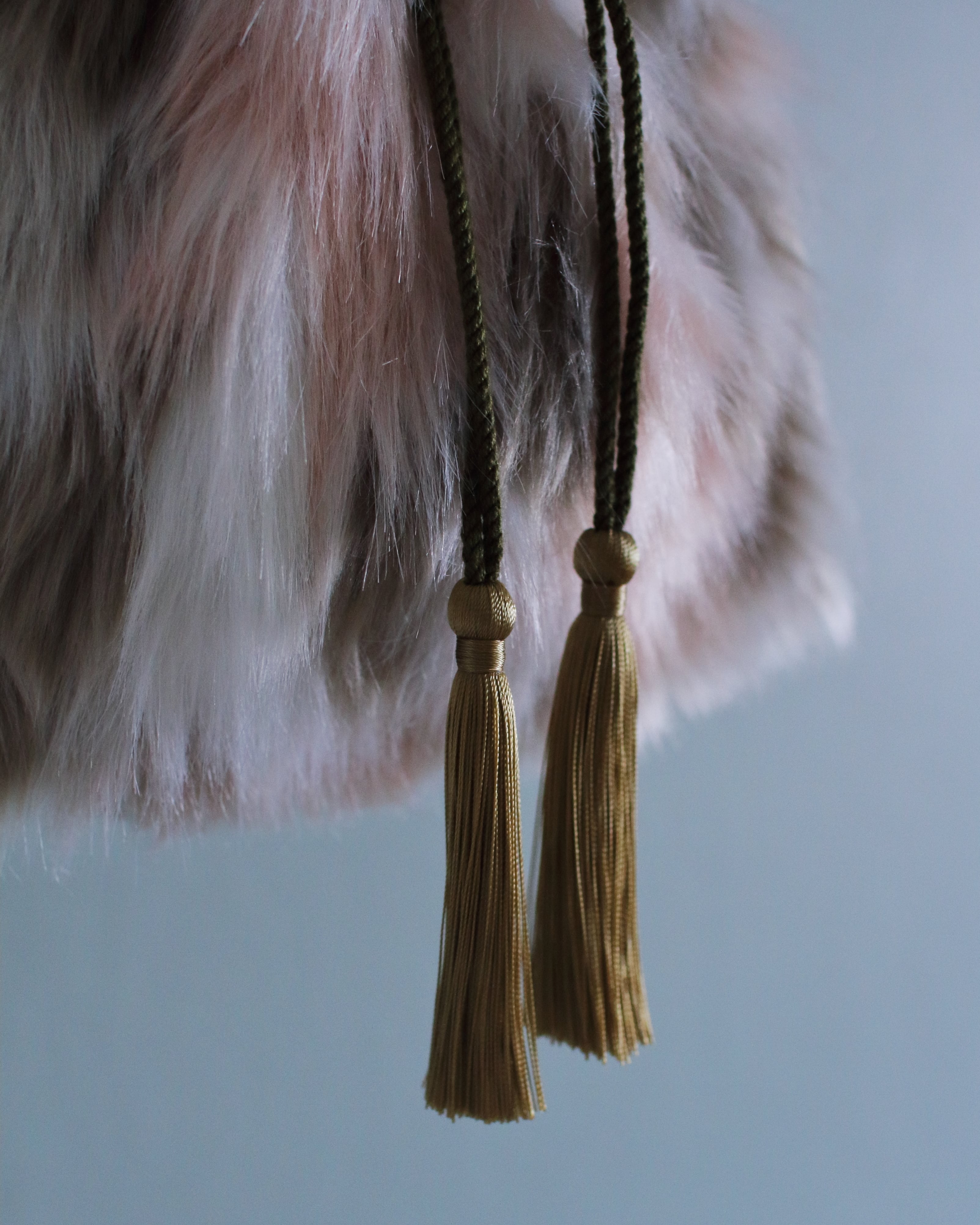 定番のシュリンク巾着を手触りふわふわのフェイクファーで仕立てました。